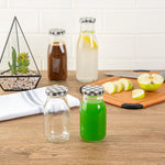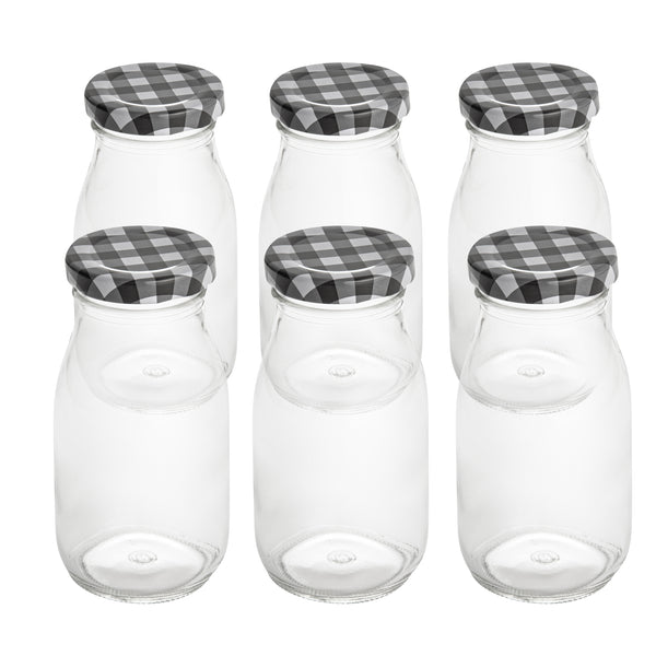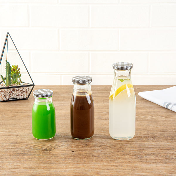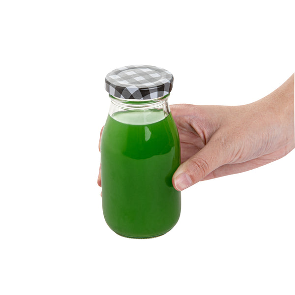 Elevate your beverage presentation with our French Countryside 6-ounce Glass Bottles. Crafted for durability, each glass bottle features a sturdy build that stands up to daily use. The airtight cap of these countryside glass bottles adorned with a plaid pattern ensures freshness and a secure seal. These clear glass bottles are suitable for hot and cold beverages. Made from durable glass, these recyclable milk bottles embrace sustainability. The microwavable and dishwashable design of these glass juice bottles streamlines meal prep and cleanup. With a 6-ounce capacity and dimensions of 2.25 inches in diameter by 4.75 inches in height, these glass milk bottles offer a touch of elegance and functionality. Shipped in a 10 count box.