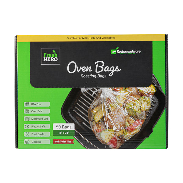 Enhance your cooking efficiency with oven-safe convenience. Fresh Hero Moisture-Locking Oven Bags are crafted from BPA-free plastic, ensuring a safe meal preparation environment while locking in moisture and flavor with included ties. These disposable roasting bags feature a clear design, allowing chefs to easily monitor roasts without constant checks, making them ideal for busy foodservice kitchens. Measuring 24 inches by 18 inches, they accommodate large portions or whole poultry, perfect for bulk cooking scenarios in catering services or institutional food preparation. The heavy-duty construction of these cooking bags prevents punctures, securely holding various food items during cooking. Streamline your kitchen operations with these versatile oven bags, engineered to enhance flavor retention and moisture in every dish. Each order includes 50 Fresh Hero Moisture-Locking Oven Bags.