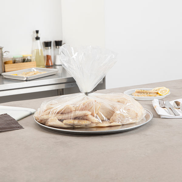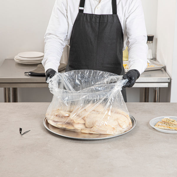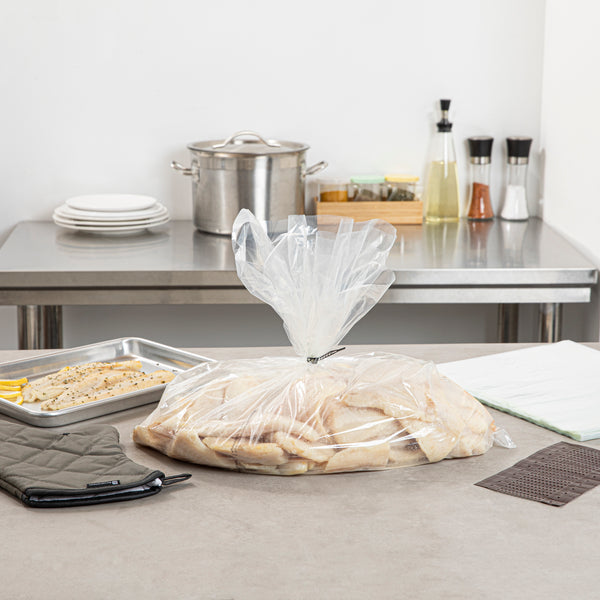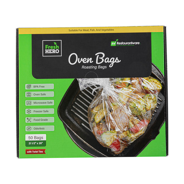 Ensure flawless meal preparation with tear-resistant oven bags. The Fresh Hero Clear Nylon Oven Bag features heavy-duty nylon material that ensures durability and prevents tearing during cooking, making it ideal for commercial kitchens. These roasting bags include ties to lock in moisture and flavor, ensuring fresh, succulent dishes every time. Crafted from BPA-free plastic, these turkey oven bags provide a safe and reliable solution for meal preparation, free from harmful chemicals. With a generous size of 21.5 inches by 26 inches, these clear bags can accommodate large cuts of meat or multiple items, making them perfect for large-scale catering events. The transparent design enables easy monitoring of food, allowing chefs to achieve perfect roasts without constant checks. Enhance your kitchen's efficiency with these versatile cooking bags. Each order includes 50 Fresh Hero Clear Nylon Oven Bags.