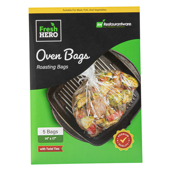 Ensure every dish is perfectly cooked with the Fresh Hero Moisture-Retaining Oven Bags. These oven bags, crafted from BPA-free plastic, prioritize food safety by eliminating harmful chemicals during high-temperature cooking. The included ties in these roasting bags provide a secure seal, effectively locking in moisture and flavor for succulent results. The clear design of these turkey roasting bags allows chefs to monitor their dishes effortlessly, ensuring perfect roasts without the need to open the bag and lose valuable heat. Measuring 14 inches by 17 inches, they accommodate a variety of dishes, from whole chickens to large roasts, offering versatility that meets diverse culinary needs. The heavy-duty construction withstands high cooking temperatures, making them a reliable choice for professional kitchens. Enhance your food preparation and cooking processes with these essential kitchen tools. Each order includes 200 Fresh Hero Moisture-Retaining Oven Bags.