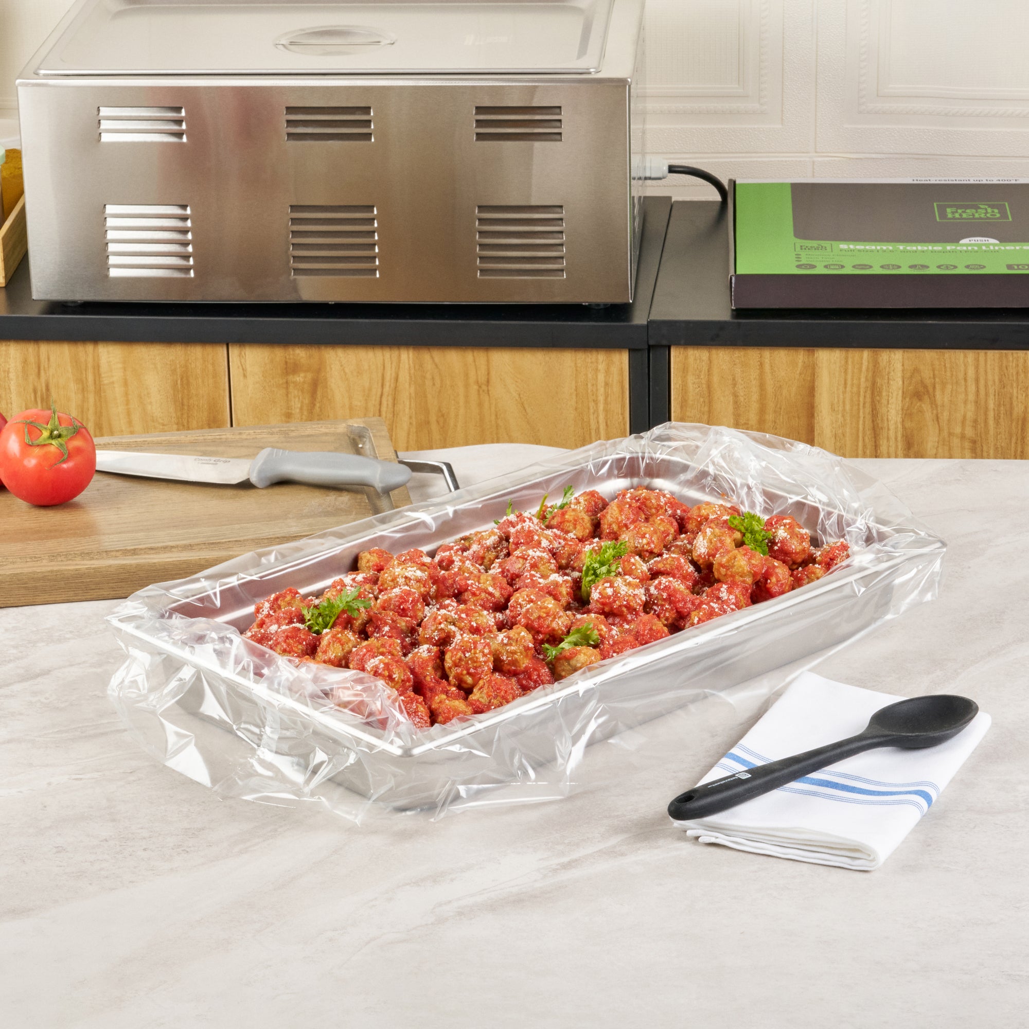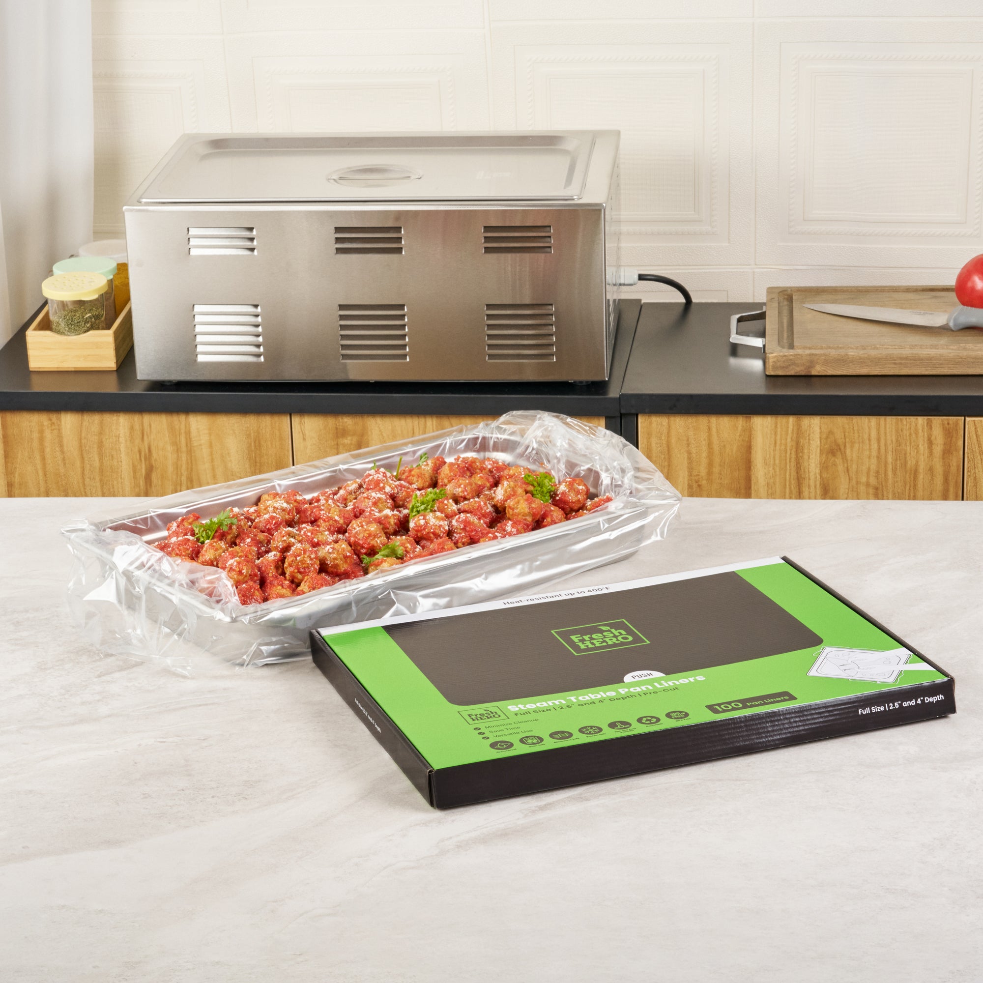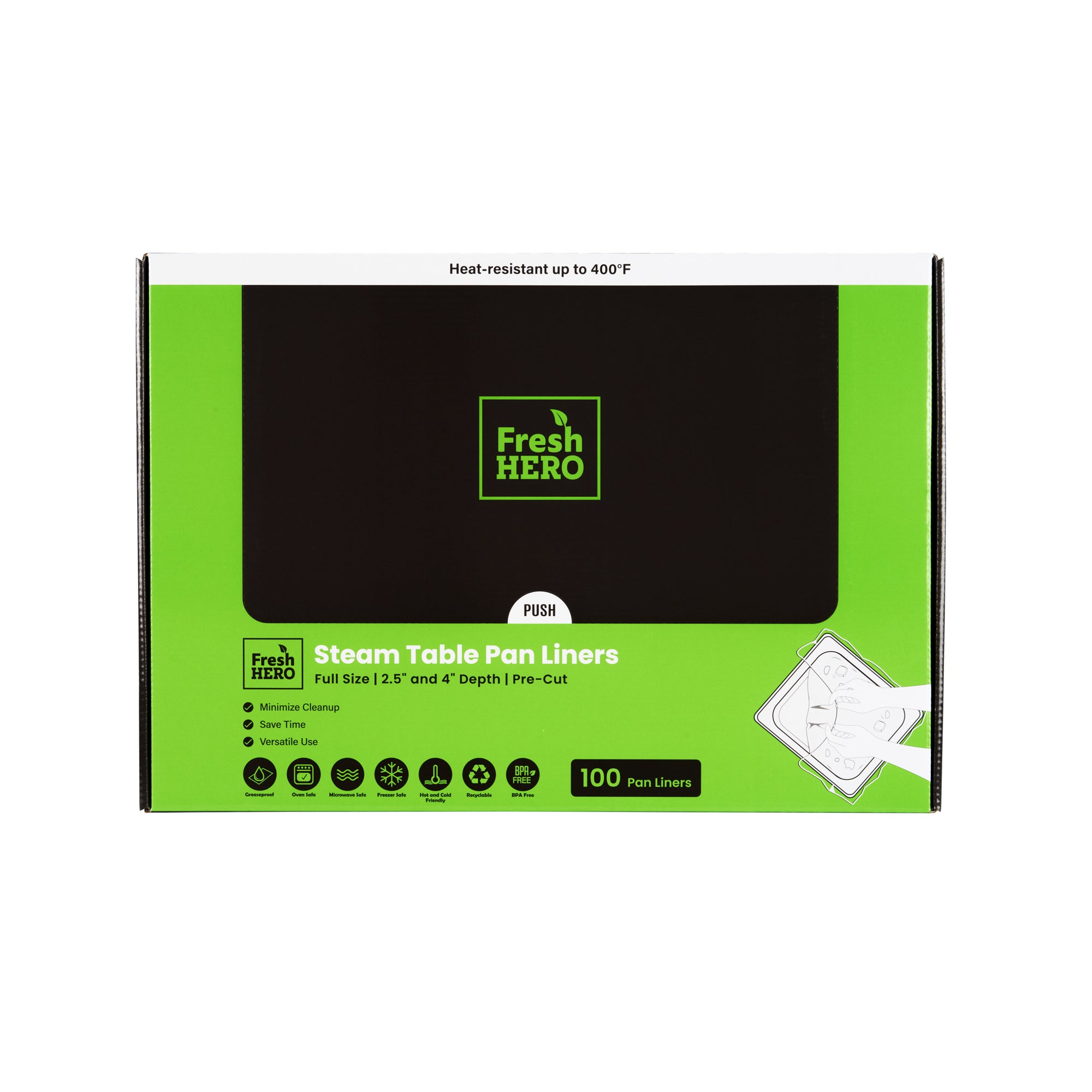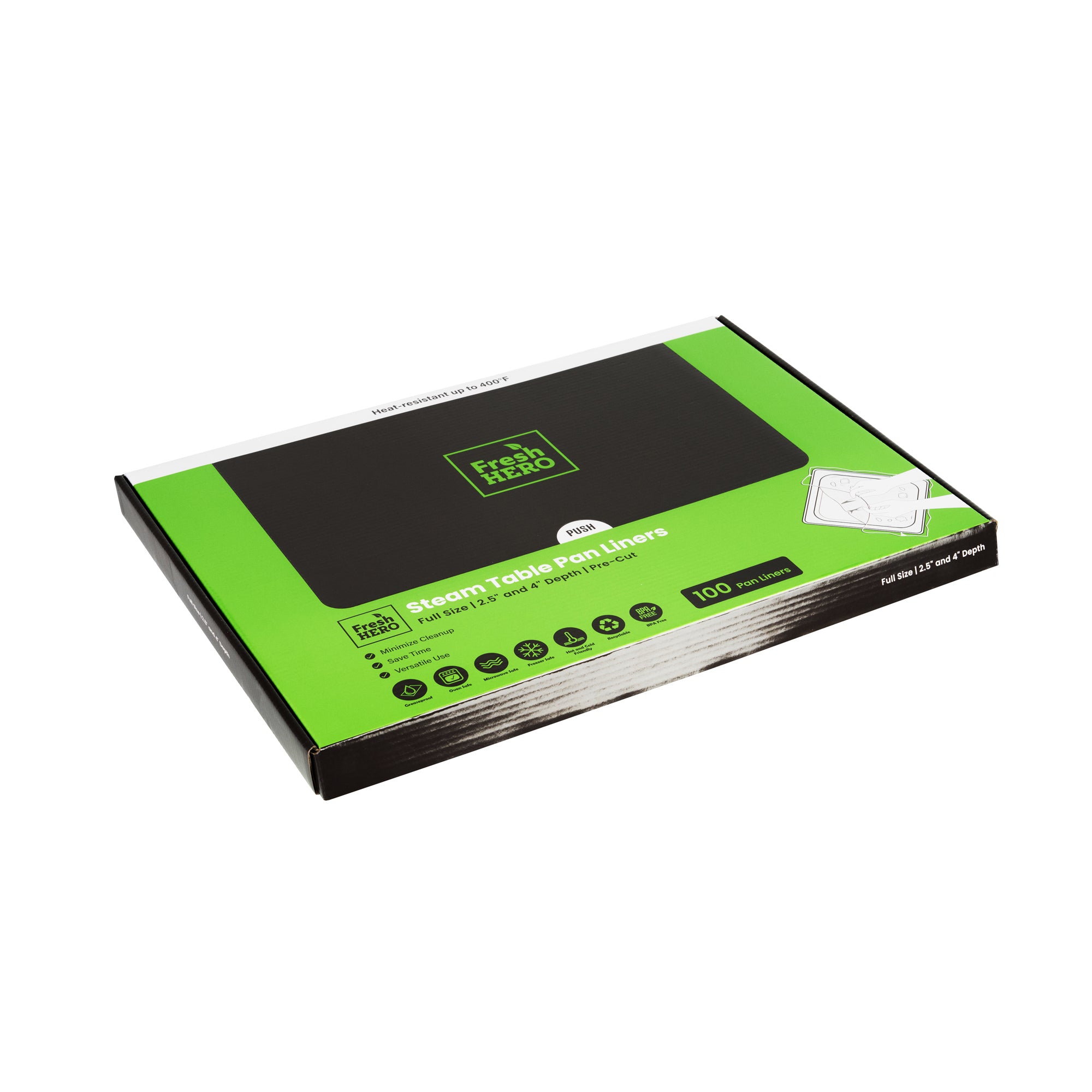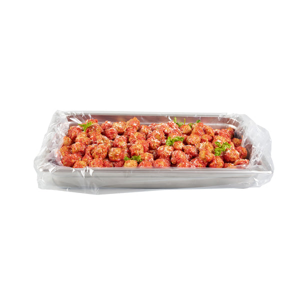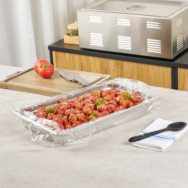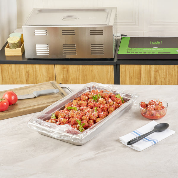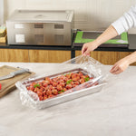 Streamline your kitchen operations with effortless cleanup. Fresh Hero Contour-Fit Steam Table Liners are expertly designed to fit perfectly into full-size hotel pans, measuring 34 inches in length and 12 inches in width, ensuring no food gets "lost" in the corners. These steam table liners feature Contour-Fit® technology that prevents food loss in the corners, thus increasing food yield. Made from durable plastic, they are greaseproof, microwave-safe, and freezer-safe, making them the ideal choice for various foodservice applications. By eliminating scrubbing, these disposable pan liners speed up cleanup, reducing labor costs significantly. Their ability to improve food quality by preventing moisture loss during storage ensures meals remain fresh and appetizing. Upgrade your food safety practices with these full hotel pan liners by minimizing surface contamination risks. Secure your operations' efficiency today with these reliable steam table liners. Each order includes 100 Fresh Hero Contour-Fit Steam Table Liners.