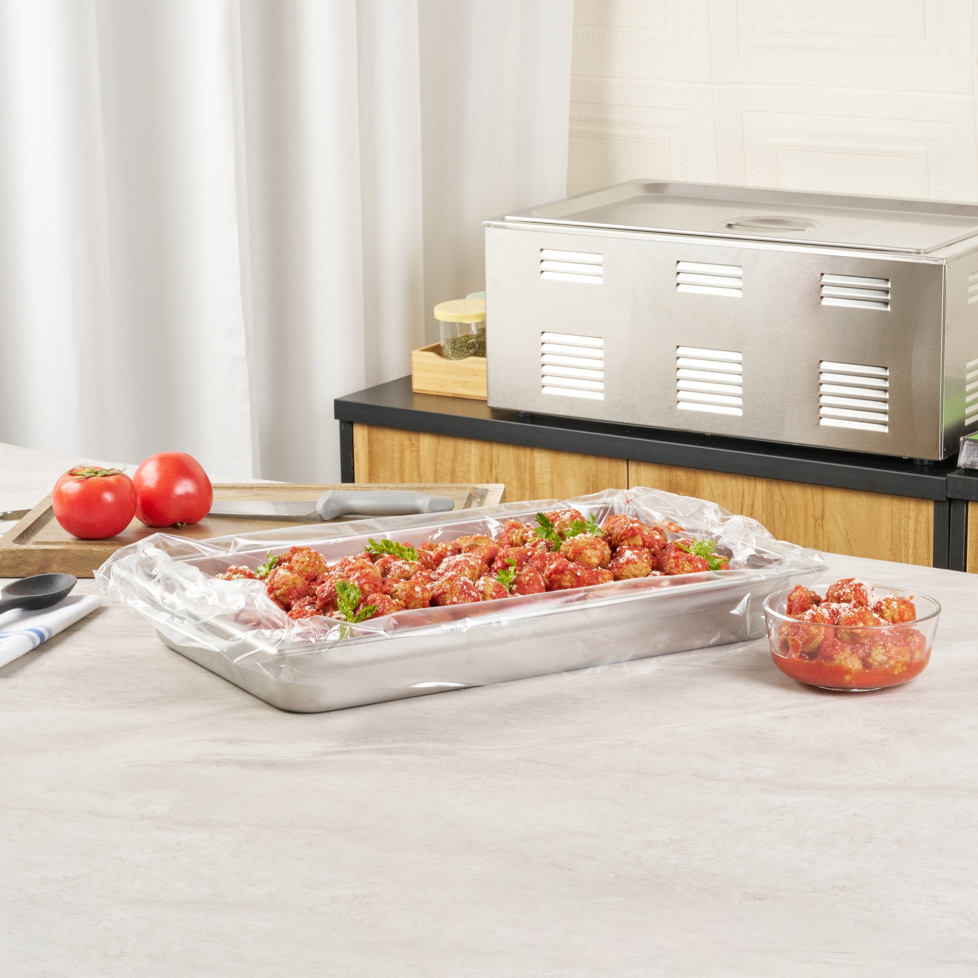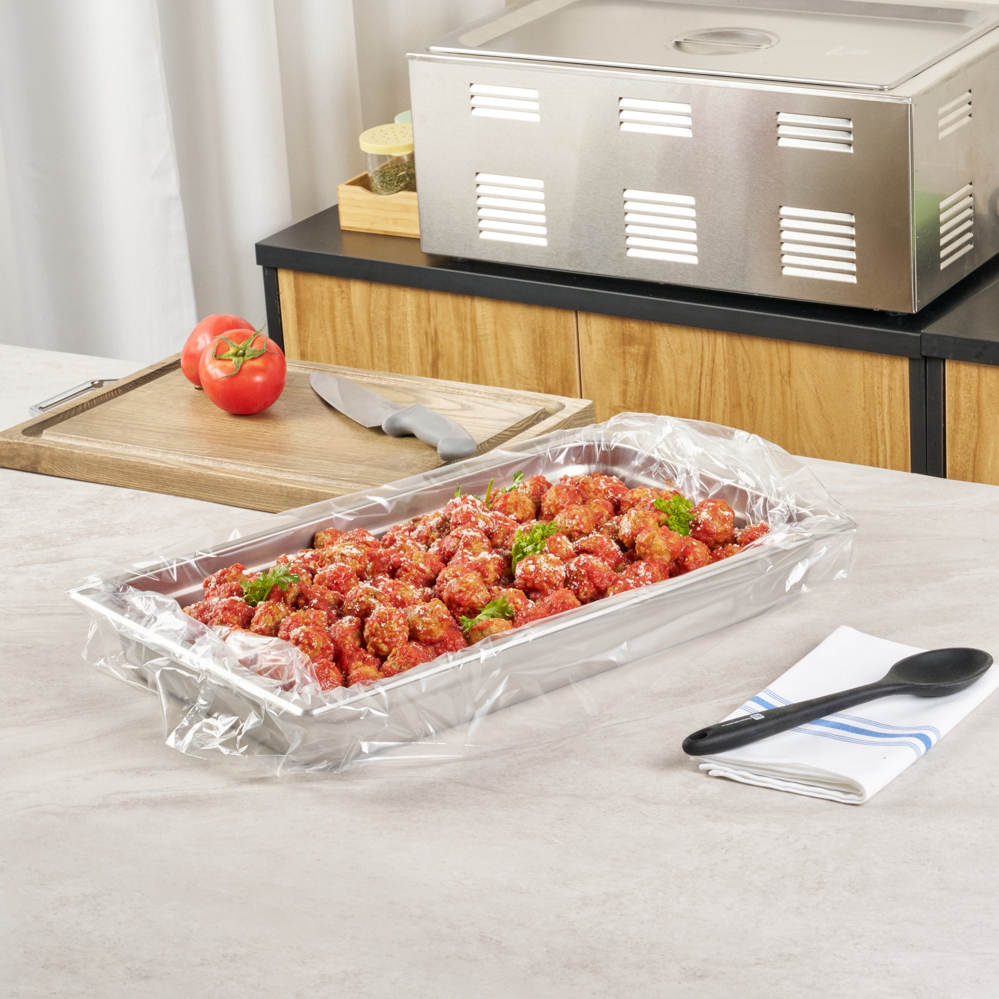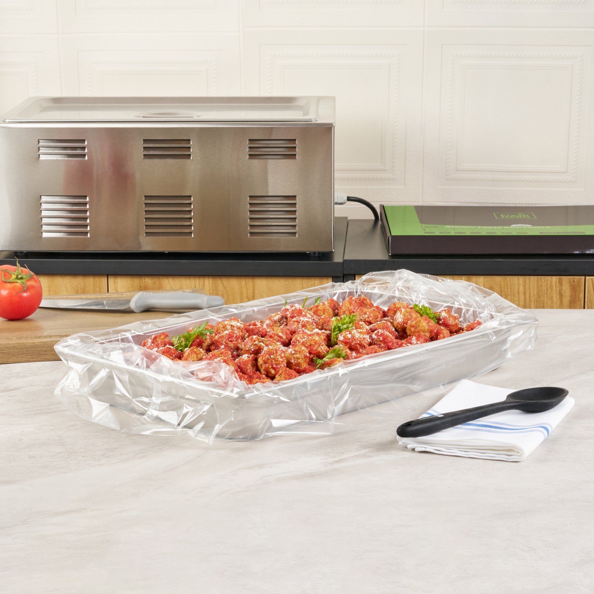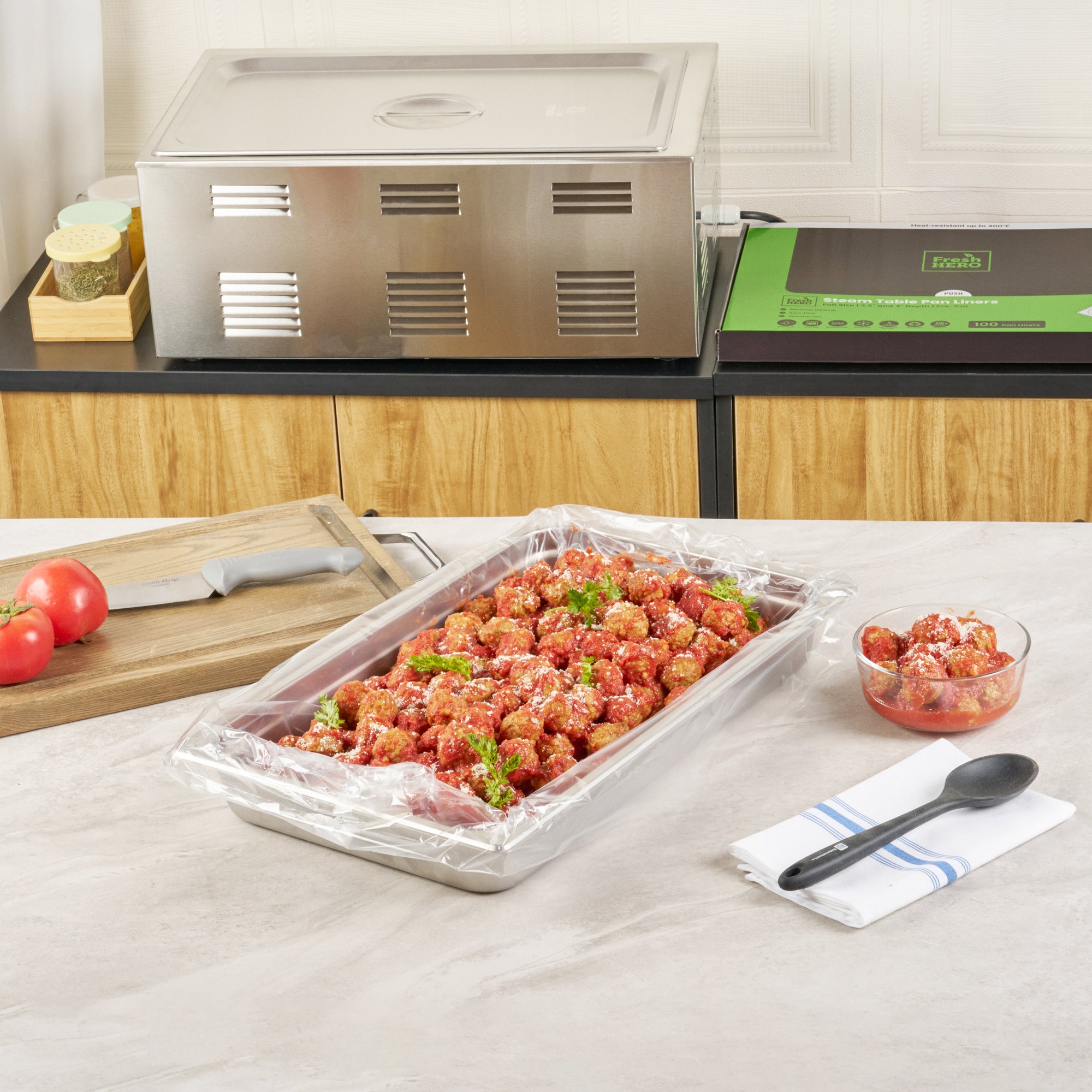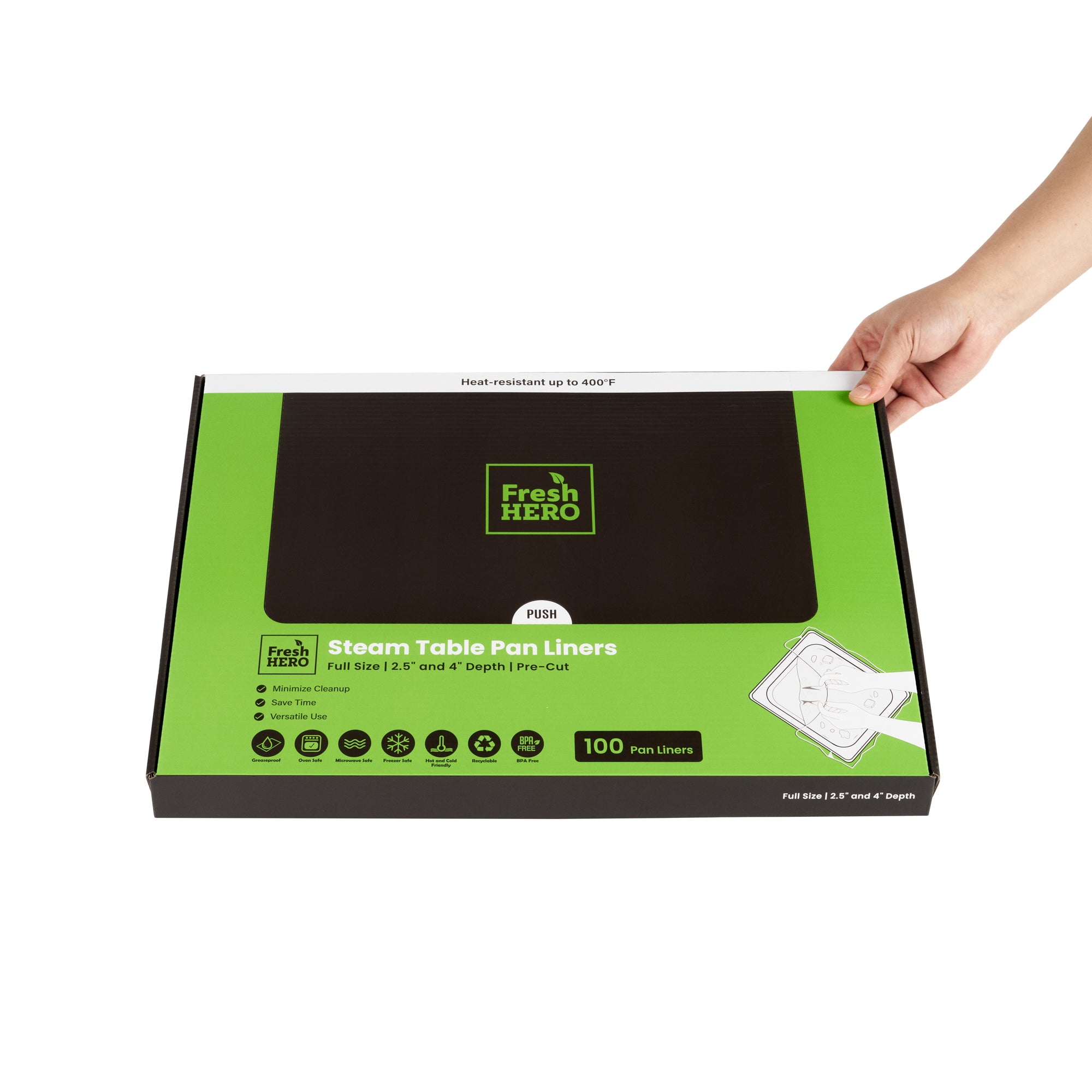 Streamline your kitchen operations with effortless cleanup. Fresh Hero Contour-Fit Steam Table Liners are expertly designed to fit perfectly into full-size hotel pans, measuring 34 inches in length and 12 inches in width, ensuring no food gets "lost" in the corners. These steam table liners feature Contour-Fit® technology that prevents food loss in the corners, thus increasing food yield. Made from durable plastic, they are greaseproof, microwave-safe, and freezer-safe, making them the ideal choice for various foodservice applications. By eliminating scrubbing, these disposable pan liners speed up cleanup, reducing labor costs significantly. Their ability to improve food quality by preventing moisture loss during storage ensures meals remain fresh and appetizing. Upgrade your food safety practices with these full hotel pan liners by minimizing surface contamination risks. Secure your operations' efficiency today with these reliable steam table liners. Each order includes 100 Fresh Hero Contour-Fit Steam Table Liners.