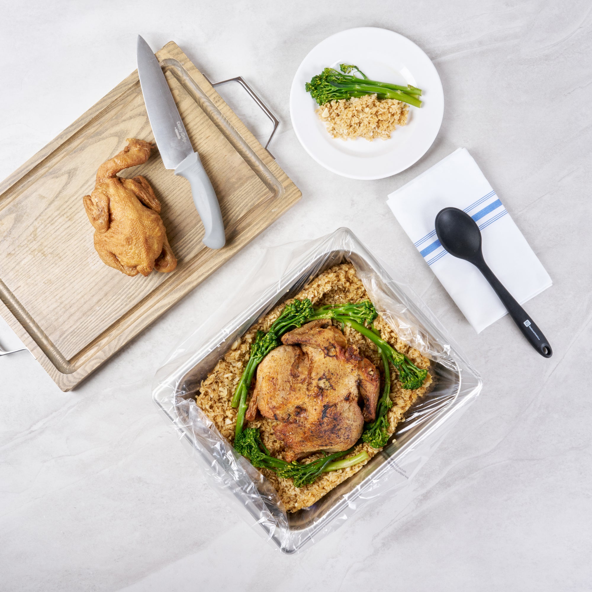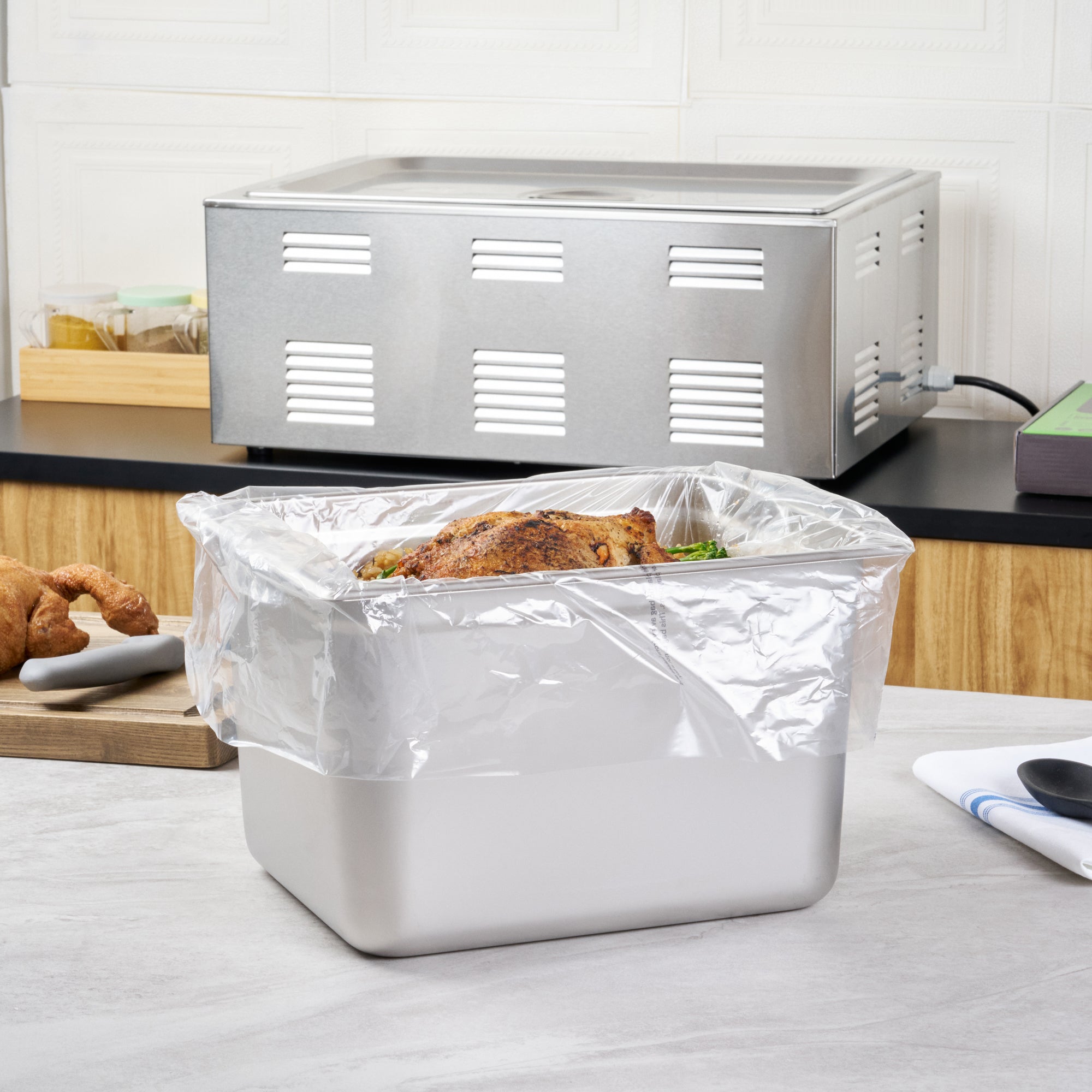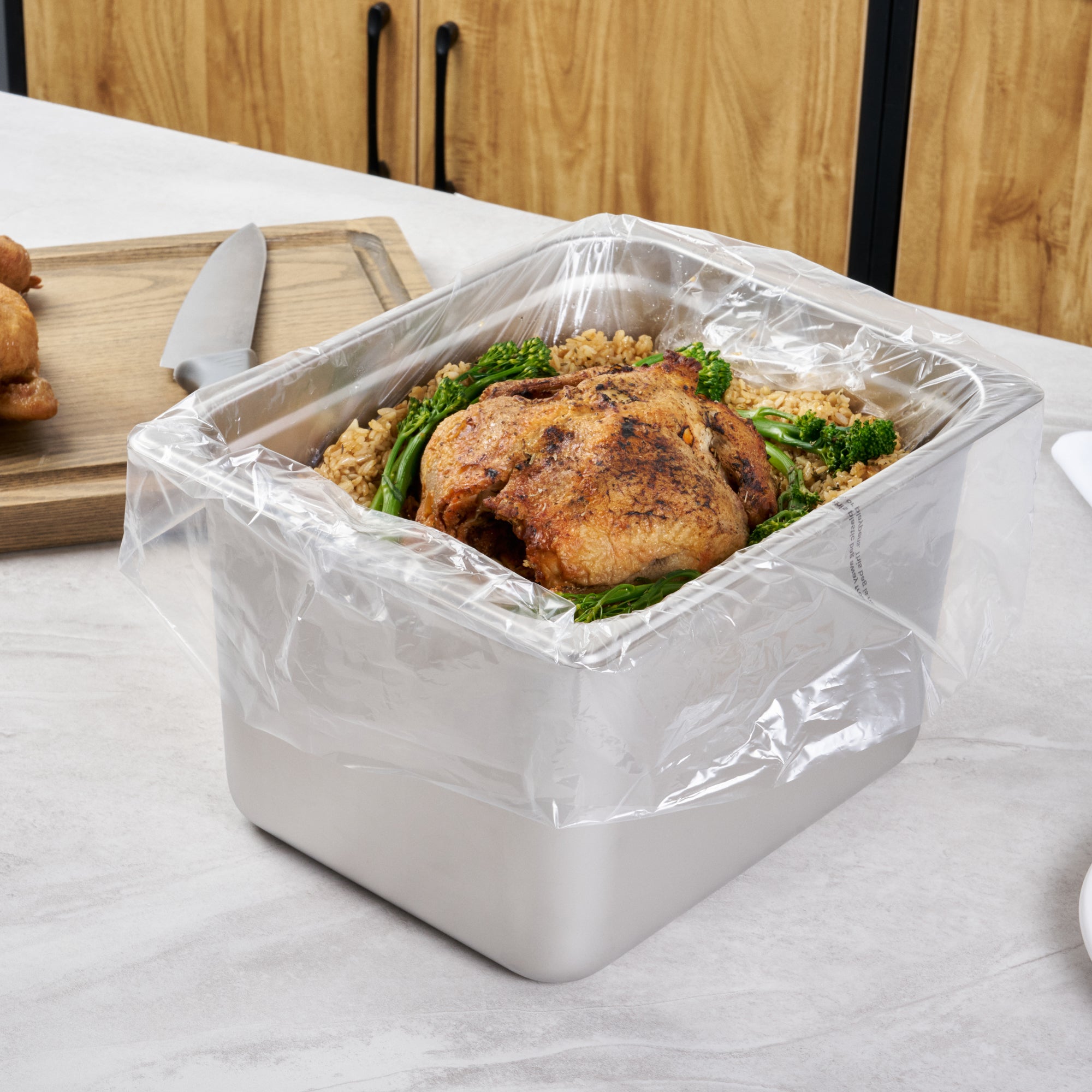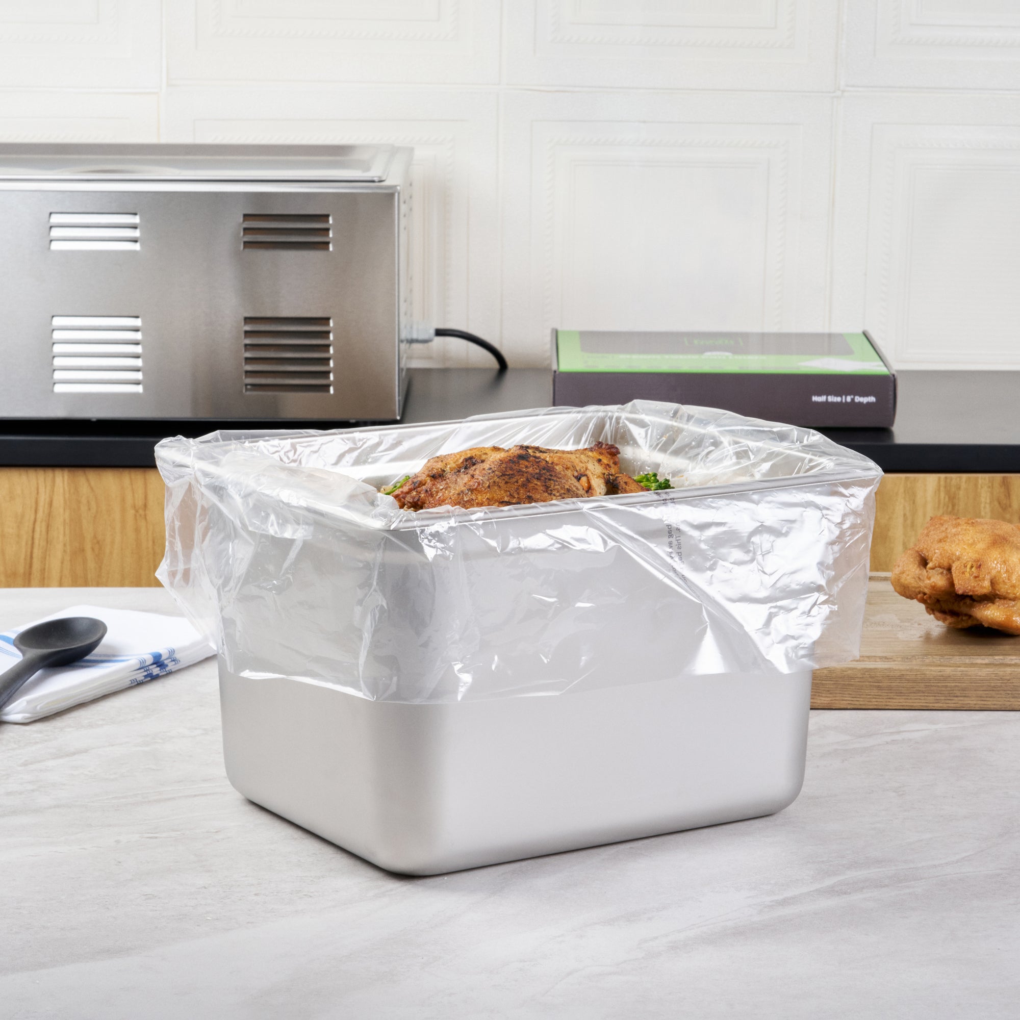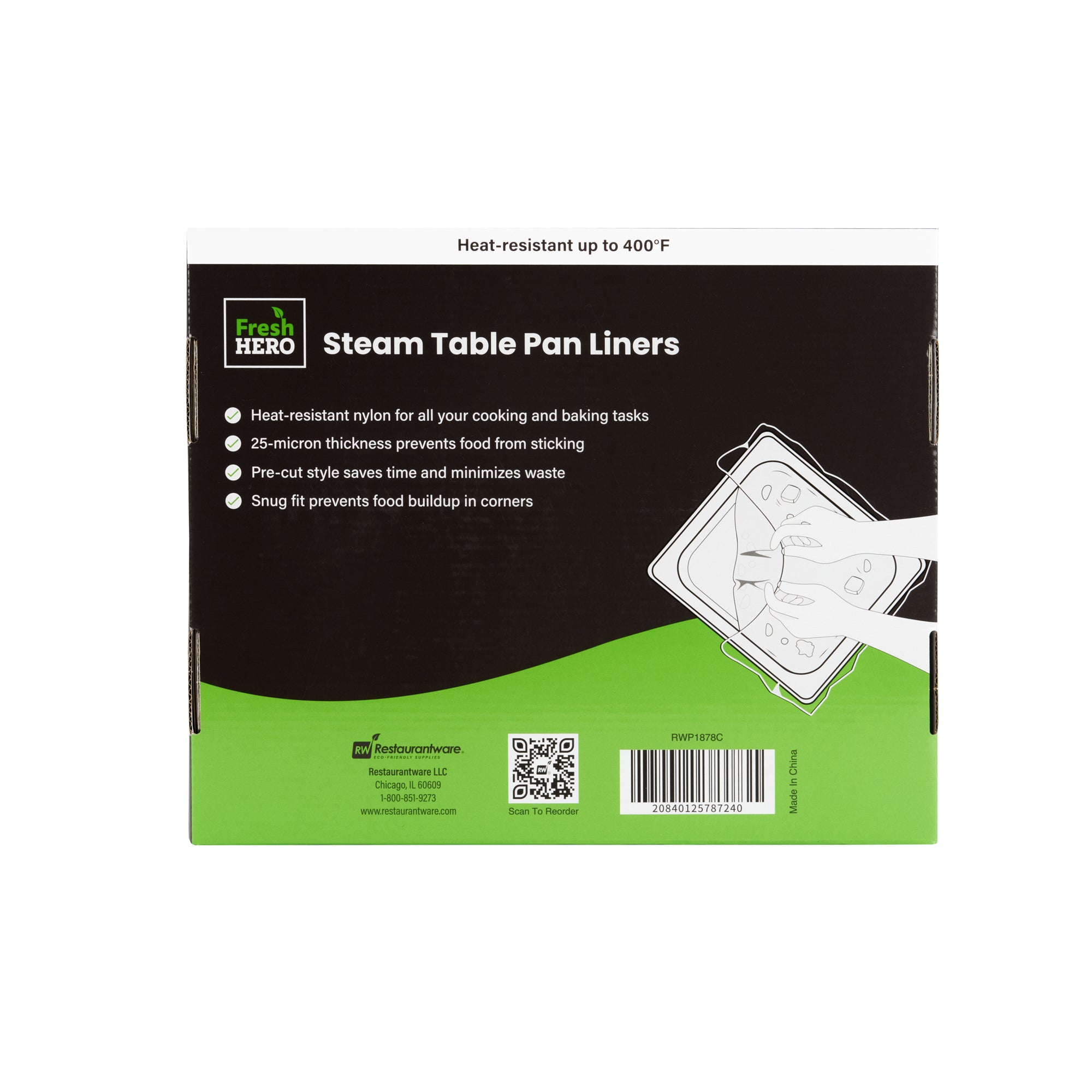 Maximize kitchen efficiency with easy-to-clean disposable steam pan liners. Fresh Hero Contour-Fit Disposable Steam Pan Liners are designed with Contour-Fit® technology, ensuring food doesn’t get lost in corners, which saves labor and time. The greaseproof surface eliminates the need for scrubbing, allowing for quick and easy cleanup, while the oven-safe design retains moisture to improve food quality. These versatile oven-safe pan liners, measuring 23 inches in length and 18 inches in width, are crafted from clear, durable plastic, making them both microwave-safe and freezer-safe. Additionally, they help increase food yield by preventing food from sticking to the surface, providing a reliable solution that enhances food safety by eliminating surface contamination risks. Reinforce your kitchen’s efficiency and reduce operating costs with these nylon pan liners. Each order includes 100 Fresh Hero Contour-Fit Disposable Steam Pan Liners.