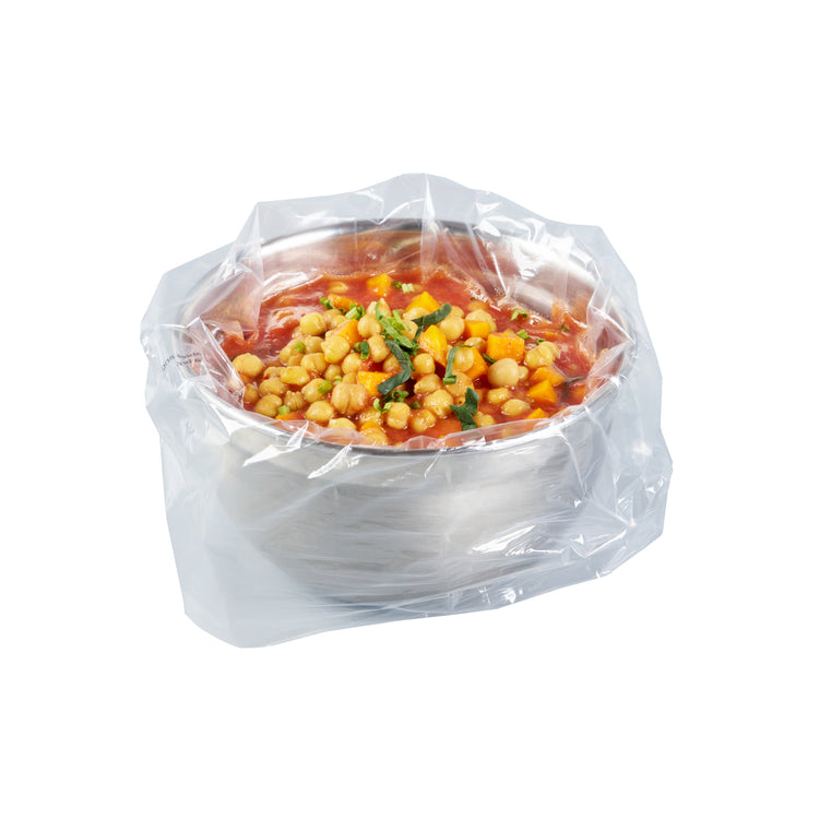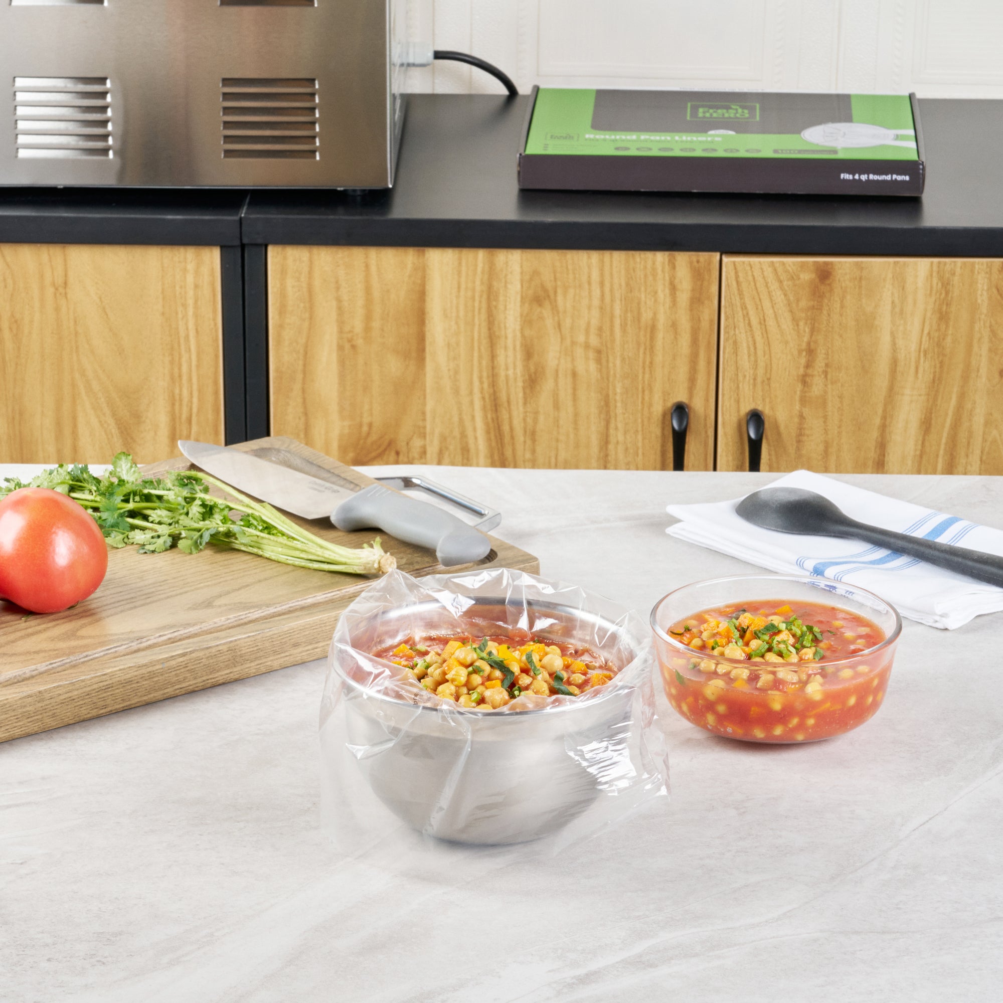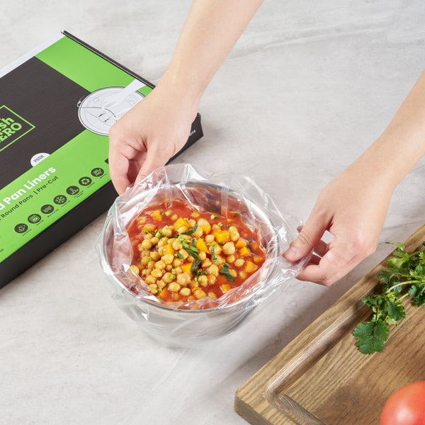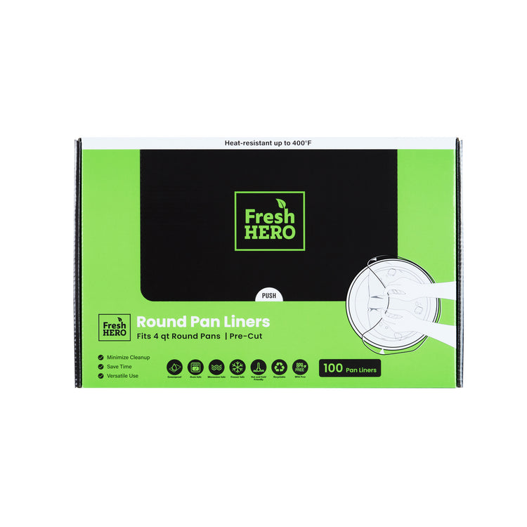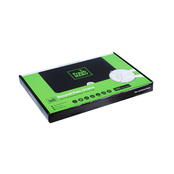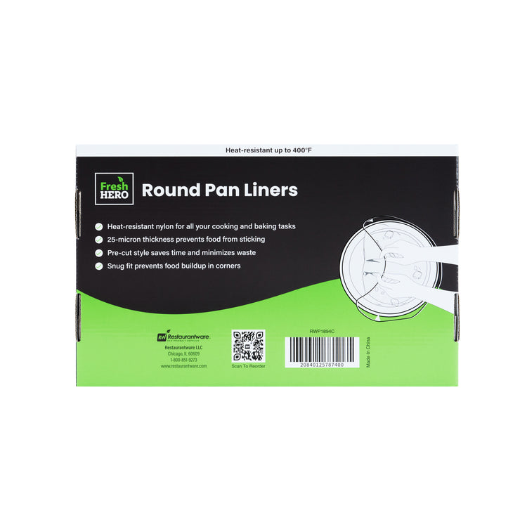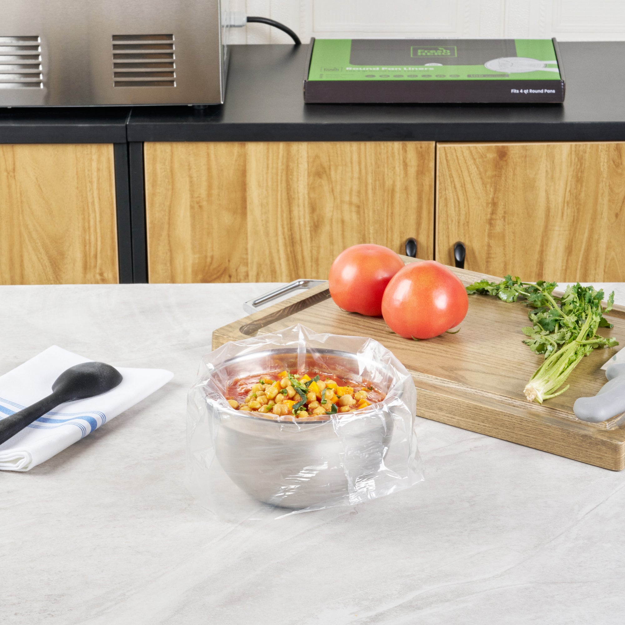 Ensure quick cleanup with high-performance disposable pan liners. Fresh Hero Contour-Fit Disposable Pan Liners are expertly designed to fit 4-quart round pans, preventing food from getting lost in liner corners and maximizing food yield. These non-stick pan liners feature a moisture-locking technology that retains the quality of soups and stews, ensuring your dishes remain flavorful and appealing. Made from nylon, these oven-safe pan liners withstand temperatures, making them ideal for rigorous commercial kitchens. The clear, 12-inch by 15-inch liners eliminate the need for scrubbing, streamlining your cleaning processes, and reducing labor costs. Their disposable nature not only promotes hygiene but also conserves water, further cutting operating expenses. Enhance operational efficiency and food quality with these indispensable kitchen tools. Each order includes 100 Fresh Hero Contour-Fit Disposable Pan Liners.