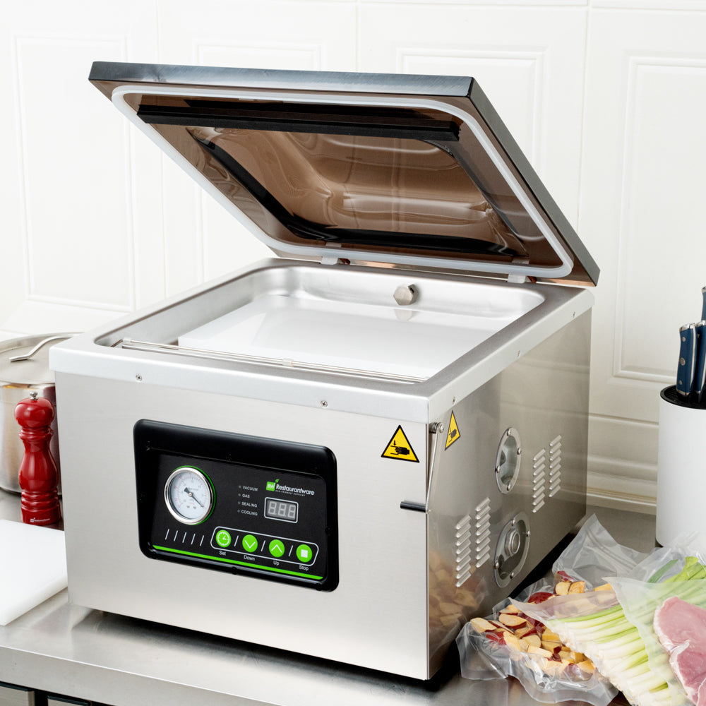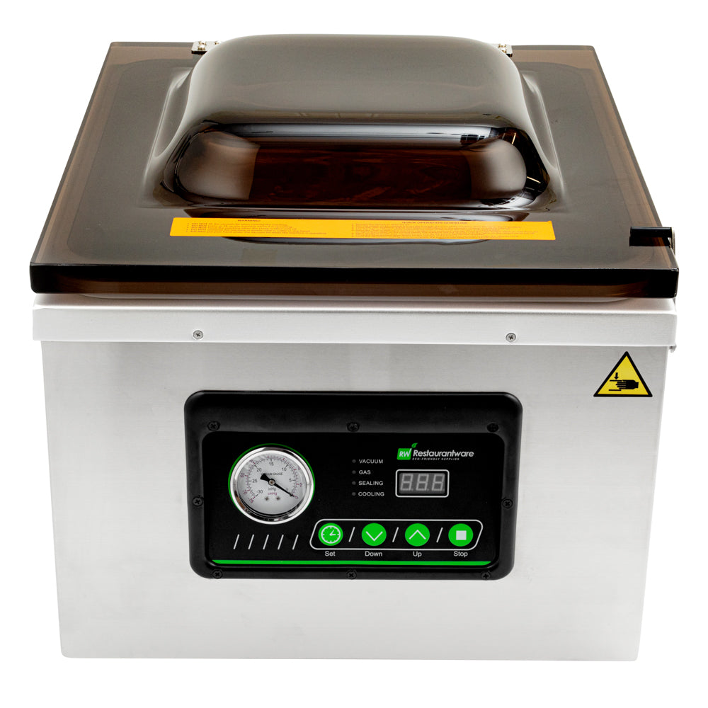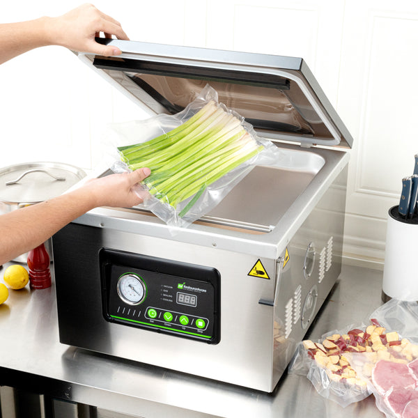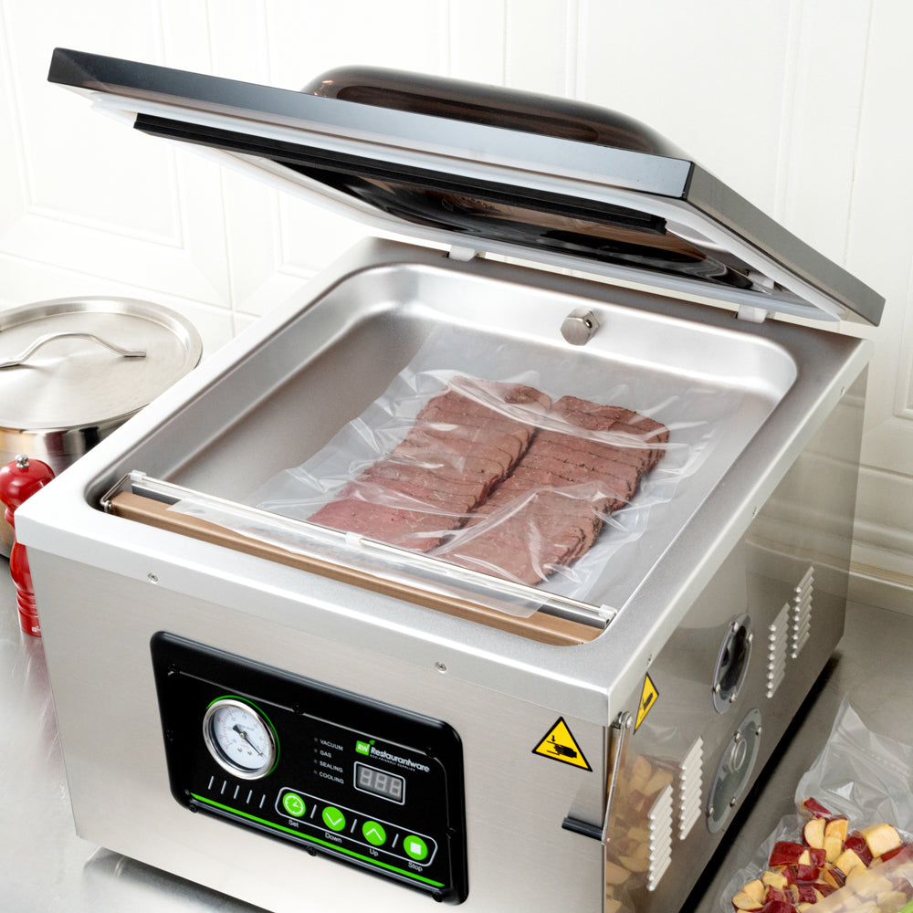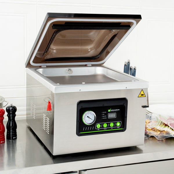 Prepare your food for sous vide cooking with our Fresh Hero Stainless Steel Chamber Vacuum Packaging Machine. Designed with a removable 16-inch seal bar, this vacuum food sealer removes up to 95% of air from food wrapped in our compatible Fresh Hero vacuum packaging bags. The oil pump of this vacuum sealing machine keeps the machine quiet when operating during service hours. With a built-in control panel, this food sealer machine is easy to use and allows you to seal in various foods without a hassle. Featuring a transparent lid, this commercial vacuum sealer allows you to check that food is being packaged properly. Built with a stainless steel body, this commercial vacuum cleaner is strong and sturdy to withstand constant uses over many years. Constructed with 120V and a NEMA 5-15P plug, this vacuum sealer matches standard U.S. power outlets. This chamber vacuum sealer measures 22.3 inches long by 19.5 inches wide by 19 inches tall and has 1 1/2 HP. Sold in a 1 count box. Fresh Hero vacuum packaging bags are available and sold separately.