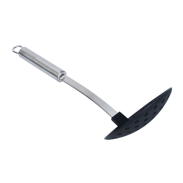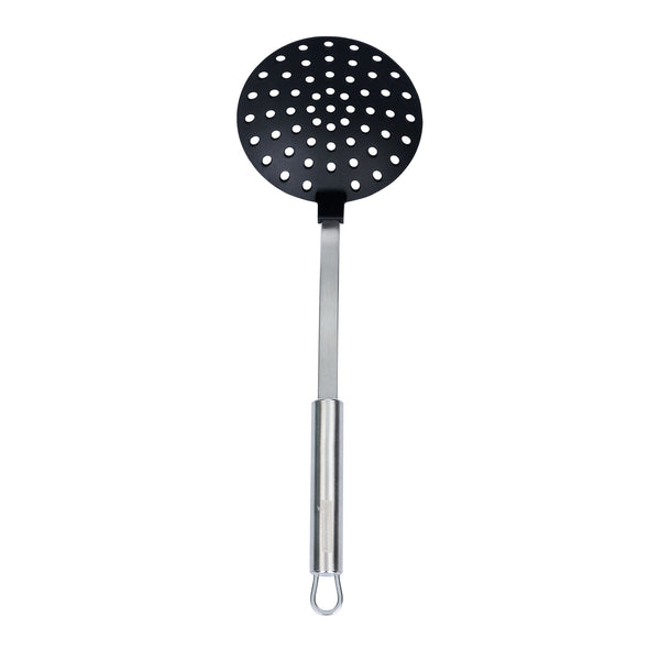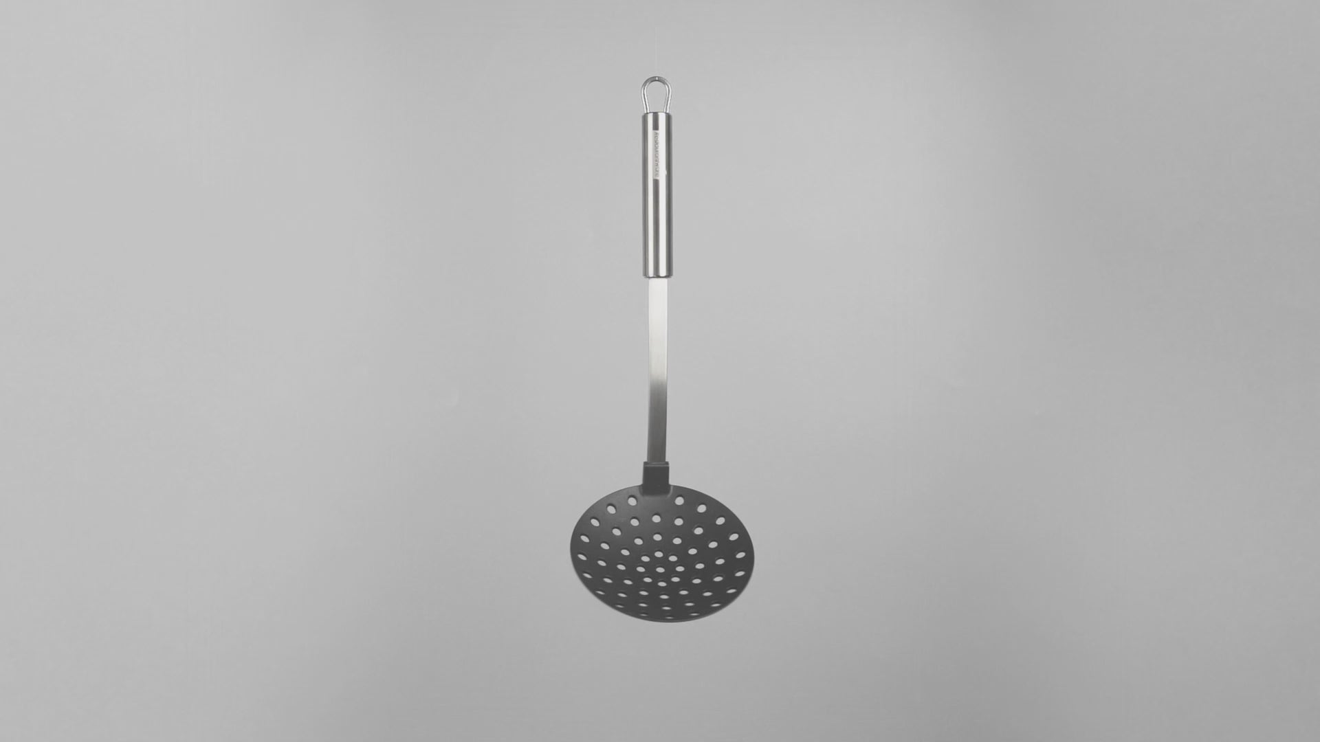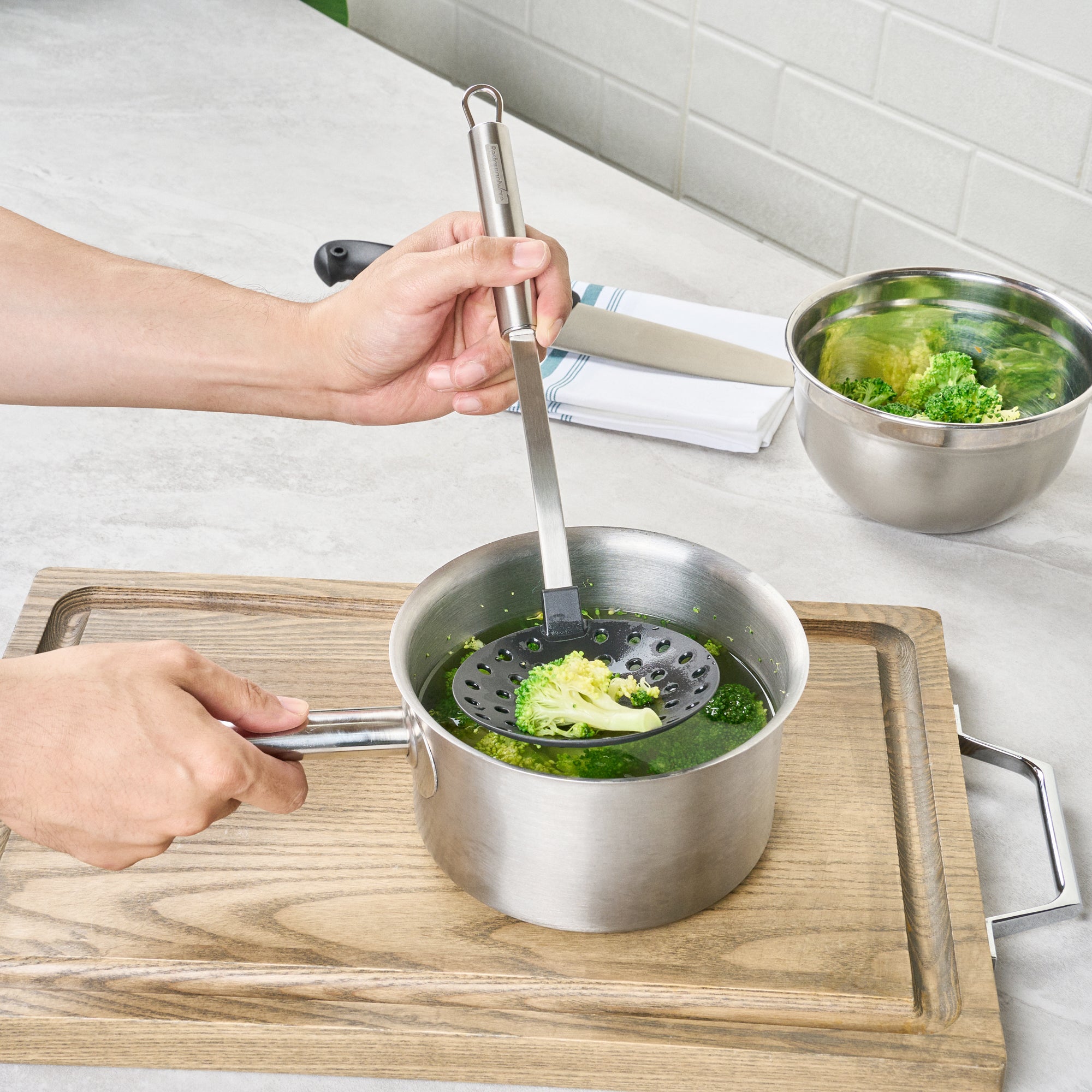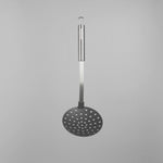 Achieve precise cooking results with ease. The German Standard Ergonomic Skimming Ladle features a slotted design that effectively drains excess oil, promoting healthier dishes and making it an essential skimming ladle in any professional kitchen. Its stainless steel handle provides an ergonomic grip, enhancing control and comfort during cooking, which is crucial in maintaining efficiency in a bustling foodservice environment. Constructed with heat-resistant nylon, this oil-draining spoon withstands temperatures, ensuring longevity and reliability. Measuring 12.8 inches in length, this ladle is crafted from rust-free, dishwasher-safe stainless steel with a partially matt finish. Elevate your kitchen operations with this versatile slotted skimmer, designed to meet the rigorous demands of culinary professionals. Each order includes 1 German Standard Ergonomic Skimming Ladle.
