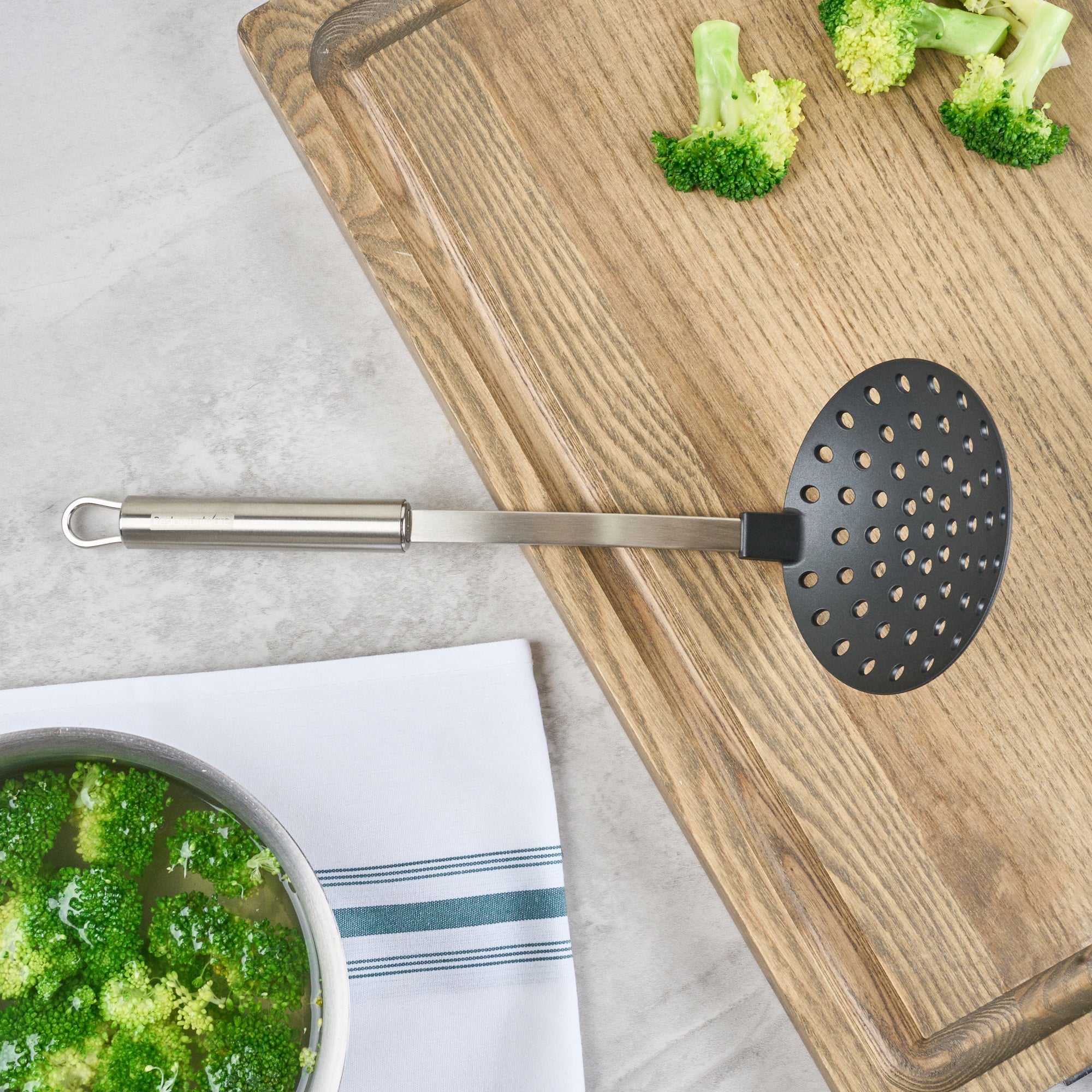 - Slotted design drains excess oil for healthier dishes