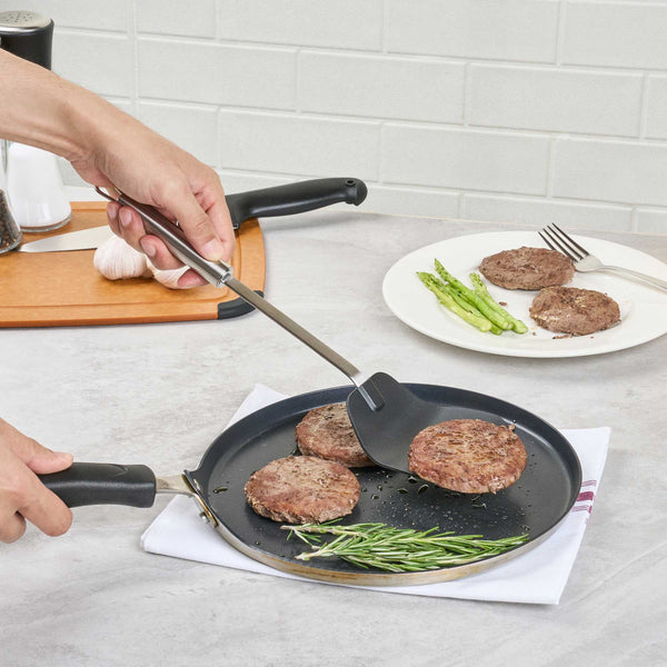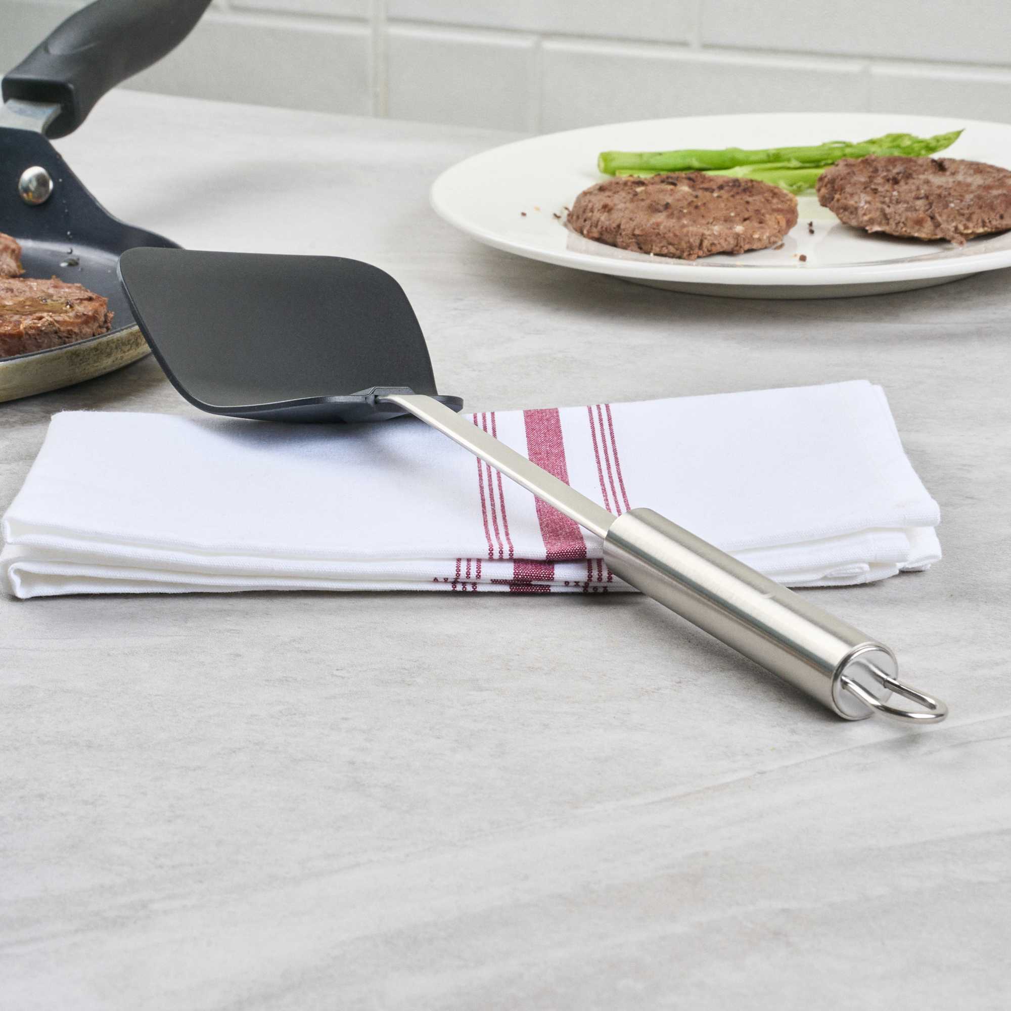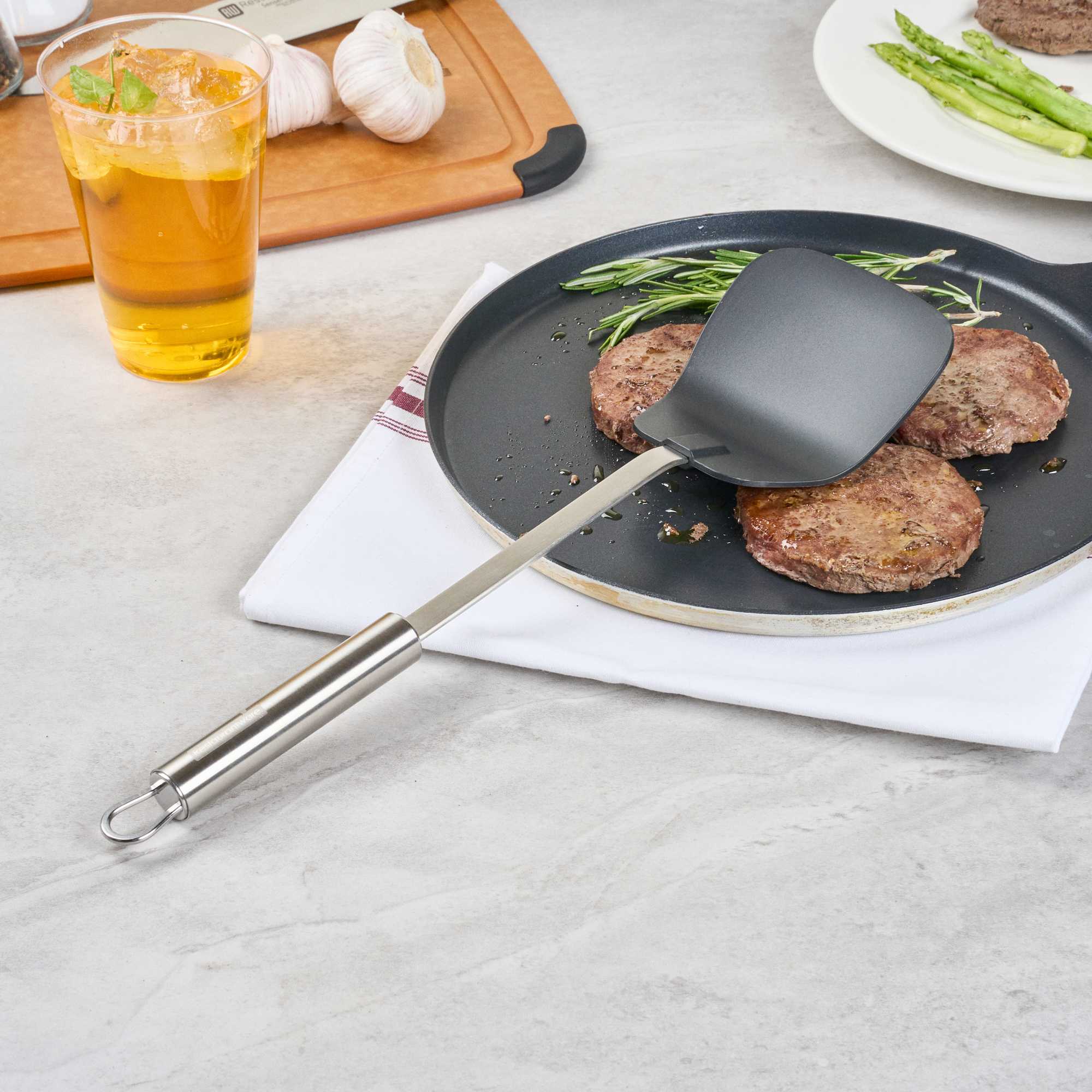 Enhance your kitchen operations with our versatile wok spatula. The German Standard Heat-Resistant Stainless Steel Wok Spatula – Ergonomic Grip, Black – 14.1 inches by 3.7 inches by 1.1 inches ensures safe and efficient cooking with its heat-resistant nylon head that withstands up to 446F, ideal for stir-frying in high-temperature conditions. Its stainless steel handle offers an ergonomic grip that enhances control and comfort, reducing hand fatigue during extended use. The long 14.1-inch length allows you to reach deep into large pots and pans, making it an essential tool for any commercial kitchen engaged in Asian cooking. Dishwasher safe, this spatula simplifies cleaning, improving kitchen efficiency. With a built-in eyelet hook for easy storage, it helps maintain an organized kitchen environment. Elevate your cooking techniques with this essential heat resistant spatula. Each order includes 6 German Standard Heat-Resistant Stainless Steel Wok Spatulas.