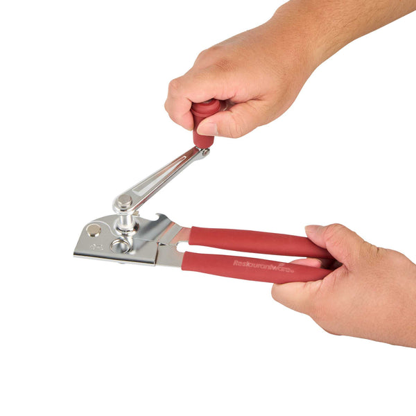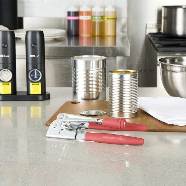 Streamline your kitchen operations with our German Standard Red Stainless Steel Handheld Crank Can Openers. Featuring a labor-saving magnetic lid-lifter that secures lids for safer handling, reducing spills and accidents in busy prep areas. This tin opener boasts an ergonomic design with extra-long handles, minimizing strain during high-volume shifts and ensuring comfort for chefs and kitchen staff. Made from durable iron, this ergonomic can opener withstands rigorous use, providing long-lasting reliability in demanding foodservice settings. Enhance your kitchen's efficiency and safety with this multifunctional tool. Its compact size, with dimensions of 8.8 inches in length, allows it to fit snugly in kitchen drawers, saving valuable space and keeping workstations organized. Sold in a 6 count box.