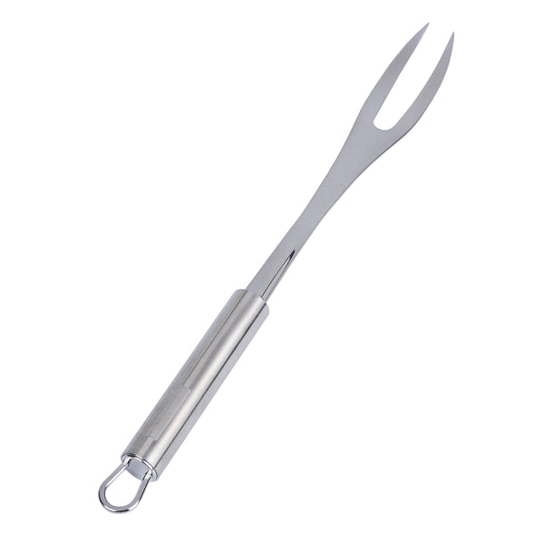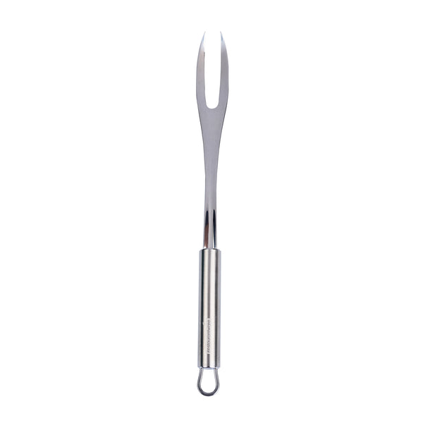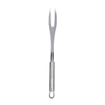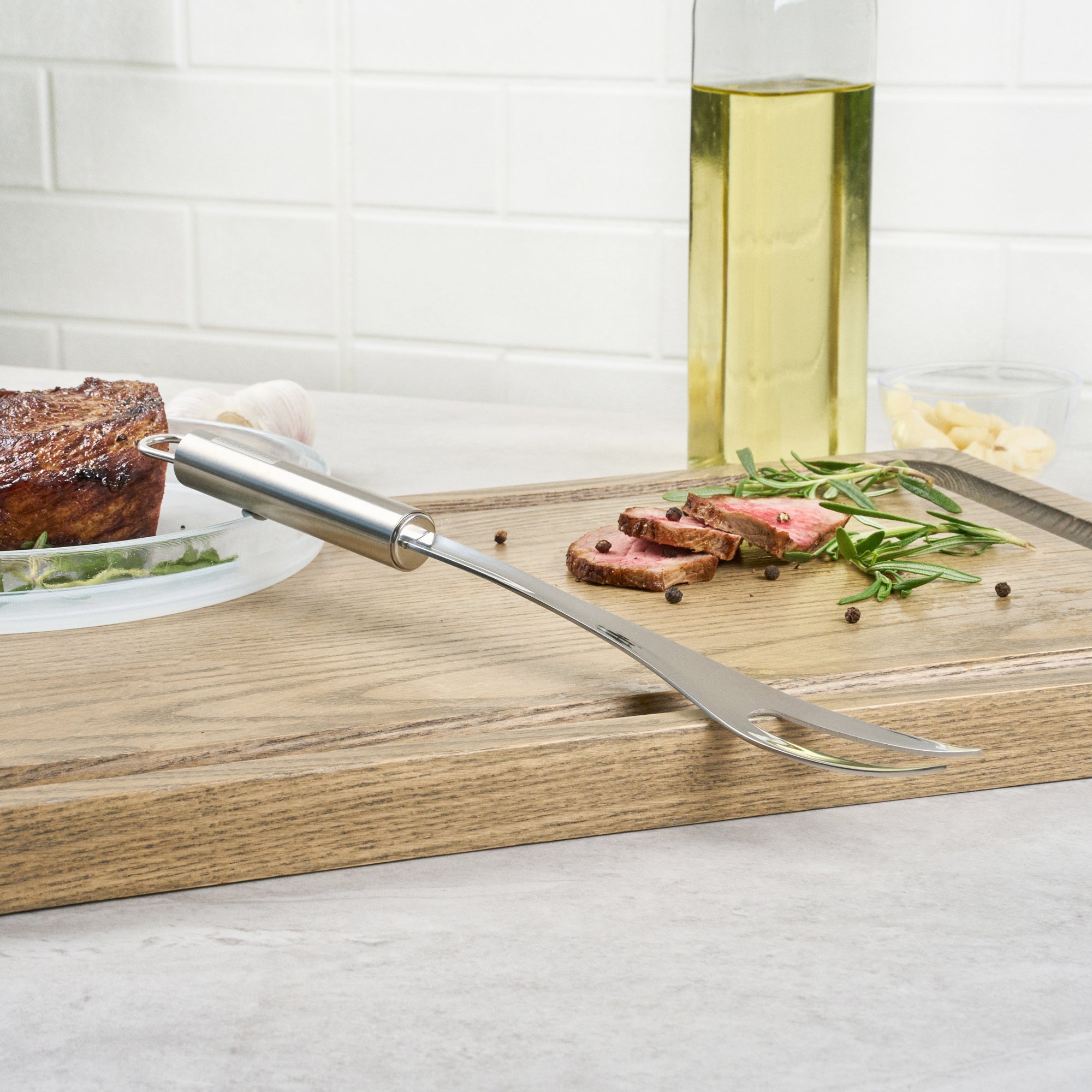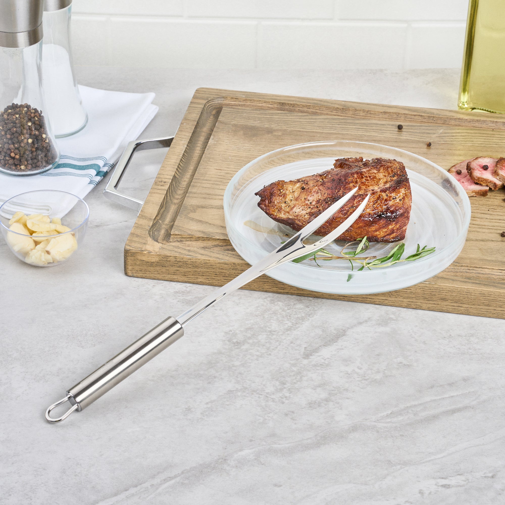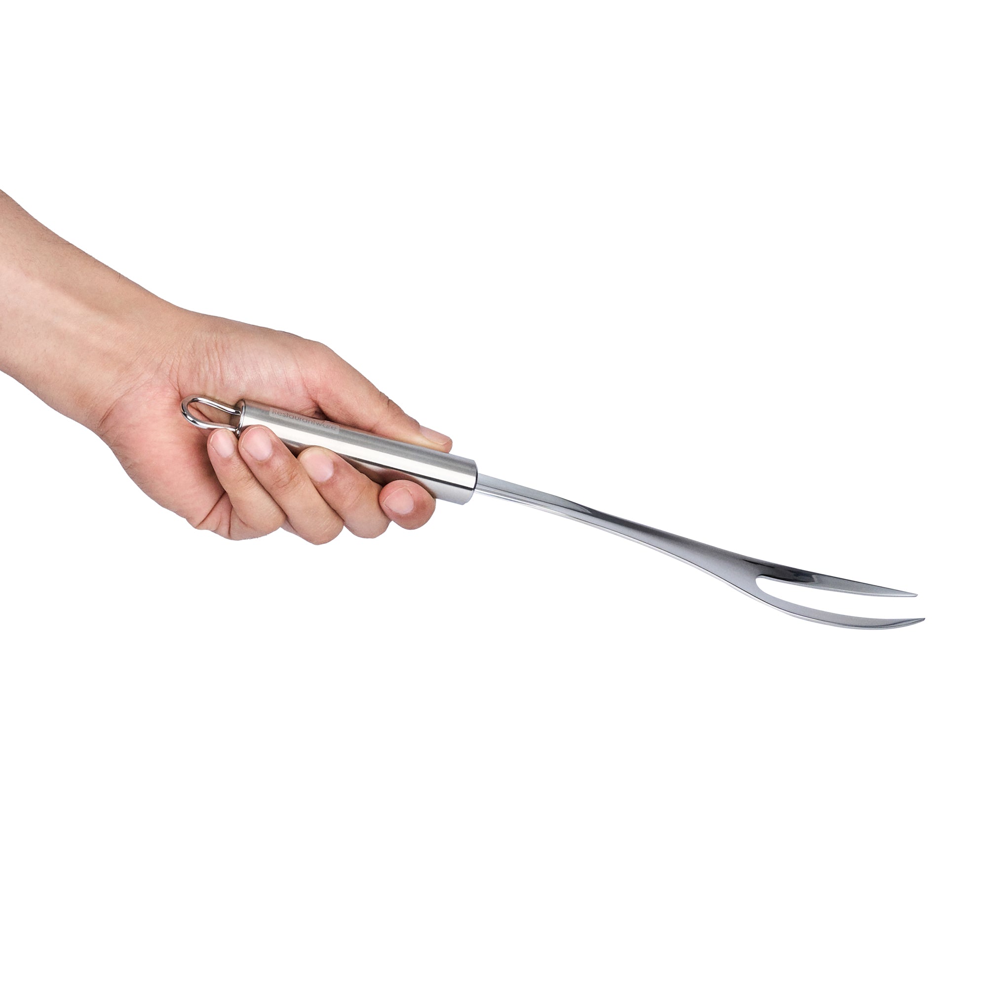 Effortlessly carve roasts with the German Standard Ergonomic Stainless Steel Carving Fork. This stainless steel carving fork features elongated tines that provide secure meat handling and lifting, ensuring precision when serving prime cuts. The ergonomic handle reduces hand fatigue, offering enhanced control for chefs using a meat holding fork during high-volume service. With a dishwasher-safe design, this long tines fork simplifies post-service cleanup, allowing your staff to focus on customer satisfaction. The fork's dimensions, 12.7 inches in length, 1.2 inches in width, ensure a comfortable fit and ease of use. Enhance your kitchen's efficiency and elevate your service with this indispensable tool. Each order includes 1 German Standard Ergonomic Stainless Steel Carving Fork.