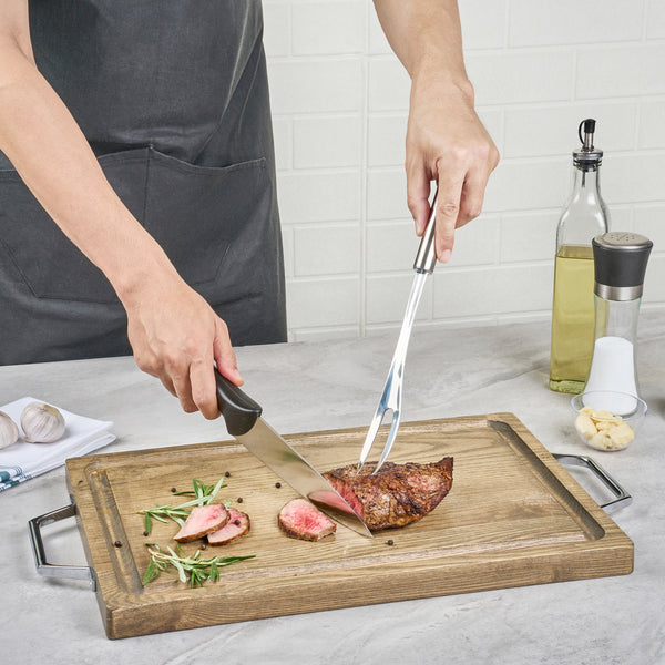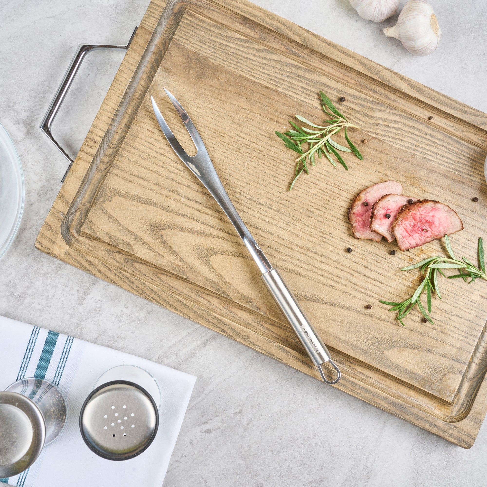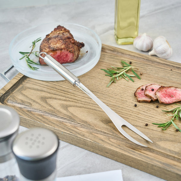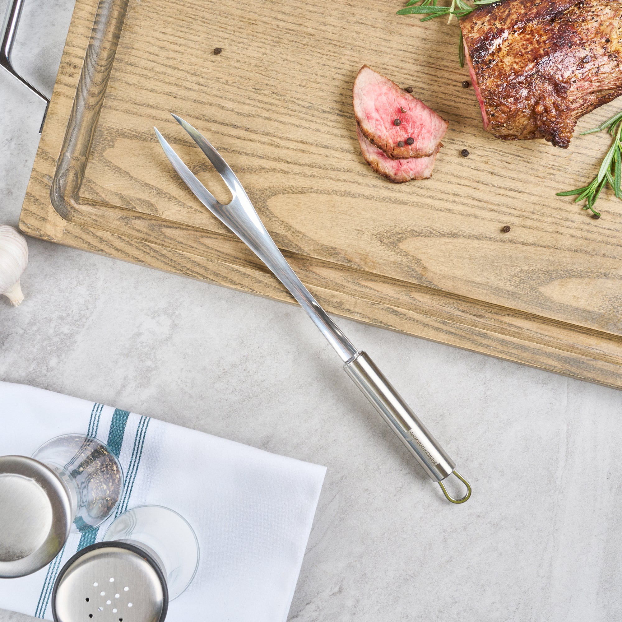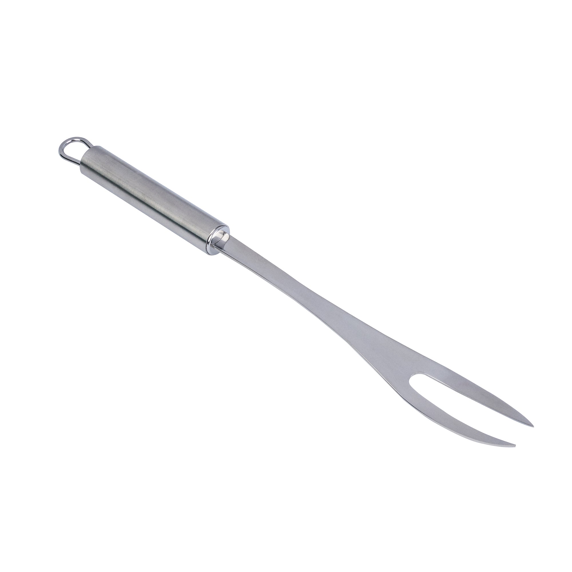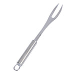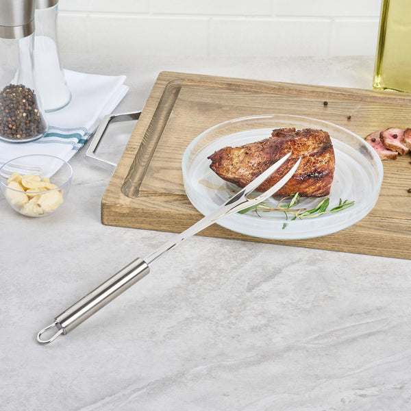 Effortlessly carve roasts with the German Standard Ergonomic Stainless Steel Carving Fork. This stainless steel carving fork features elongated tines that provide secure meat handling and lifting, ensuring precision when serving prime cuts. The ergonomic handle reduces hand fatigue, offering enhanced control for chefs using a meat holding fork during high-volume service. With a dishwasher-safe design, this long tines fork simplifies post-service cleanup, allowing your staff to focus on customer satisfaction. The fork's dimensions, 12.7 inches in length, 1.2 inches in width, ensure a comfortable fit and ease of use. Enhance your kitchen's efficiency and elevate your service with this indispensable tool. Each order includes 1 German Standard Ergonomic Stainless Steel Carving Fork.