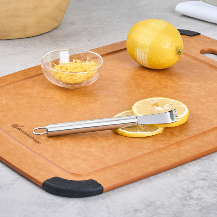 Elevate your food preparation process with our German Standard Stainless Steel Citrus Zester. This lime zester has small, sharp cutting blades that efficiently strip away the zest from citrus fruits, ensuring you only get the flavorful outer layer without the bitter white pith. The ergonomic handle of this lemon zester for a firm grip and precise control, reducing hand fatigue. Crafted from stainless steel, this citrus zester is durable and ensure long-lasting use and consistent performance. This citrus zester tool has a built-in hook and allows easy storage, keeping your kitchen space organized. For swift cleanup, this orange zester is dishwasher-safe and ideal for busy kitchens. This lemon grater measures 5.7 inches in length and offer a perfect balance of size and performance. Sold in a 1 count box.