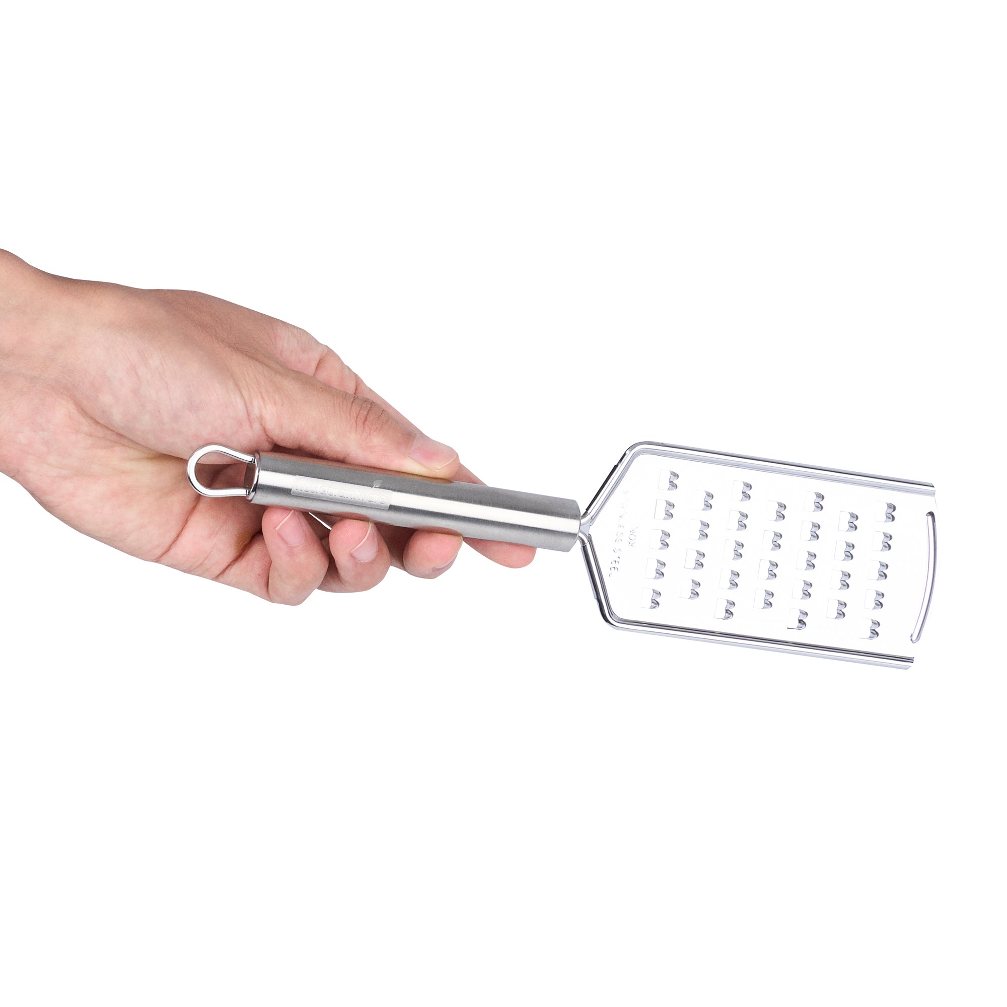 Enhance your kitchen efficiency with a reliable stainless steel grater. The German Standard Ergonomic Stainless Steel Grater boasts a robust construction that ensures durability and resistance to corrosion, perfect for heavy-duty use in commercial kitchens. Its sharp blades deliver effortless, precise grating, making it an exceptional cheese grater for delicious meal garnishes. The ergonomic handle is designed to provide a comfortable grip, significantly reducing hand fatigue during prolonged use, a crucial benefit for busy chefs using a vegetable grater. Measuring 10 inches in length, this grater provides ample surface area, allowing for quick and effective ingredient preparation. Its dishwasher-safe design simplifies post-service cleanup, ensuring hygiene and convenience in bustling foodservice environments. Optimize your kitchen operations with this indispensable tool for preparing ingredients in restaurants, catering services, and pizzerias. Sold in a 6 count box.