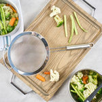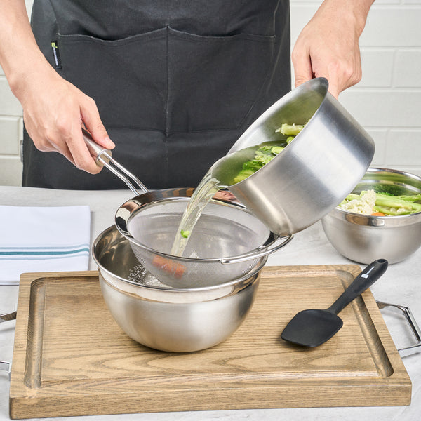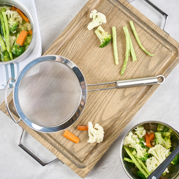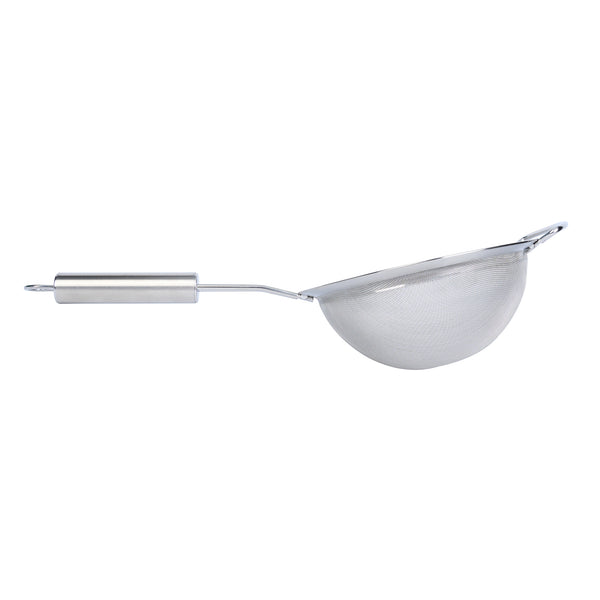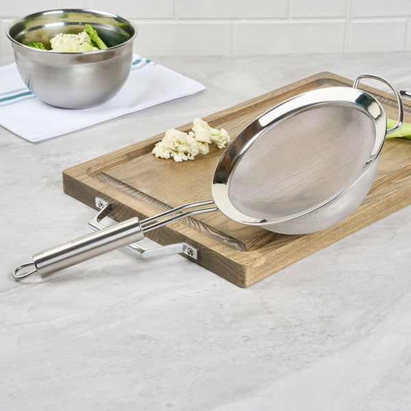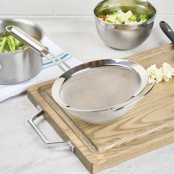 Discover the versatility of our German Standard Stainless Steel Fine Mesh Strainer. This metal strainer is designed with fine mesh and offers exceptional filtration, which is ideal for creating flavorful soup stocks or straining a variety of ingredients. The sturdy mesh design of this fine mesh strainer can withstand the pressure exerted by wooden spoons when filtering soups or stocks, ensuring your strainer maintains its shape and function. This stainless steel strainer is versatile and ideal for sifting flour or sugar. The ergonomically designed handle on this fine mesh sieve ensures a comfortable and secure grip, reducing hand fatigue and providing optimal control. This metal sieve has an attached hook that can be balanced on the pot’s rim for hands-free use. Crafted from stainless steel, this fine strainer mesh ensures robust performance and longevity in your kitchen. The convenient eyelet hook of this mesh strainer allows for easy storage, keeping your kitchen organized. For quick and easy cleaning experience, this strainer mesh is dishwasher-safe and suitable for busy kitchens. This stainless mesh strainer measures 16.8 inches in length by 7.9 inches in width by 3.3 inches in height, perfectly sized for a variety of kitchen tasks. Sold in a 1 count box.