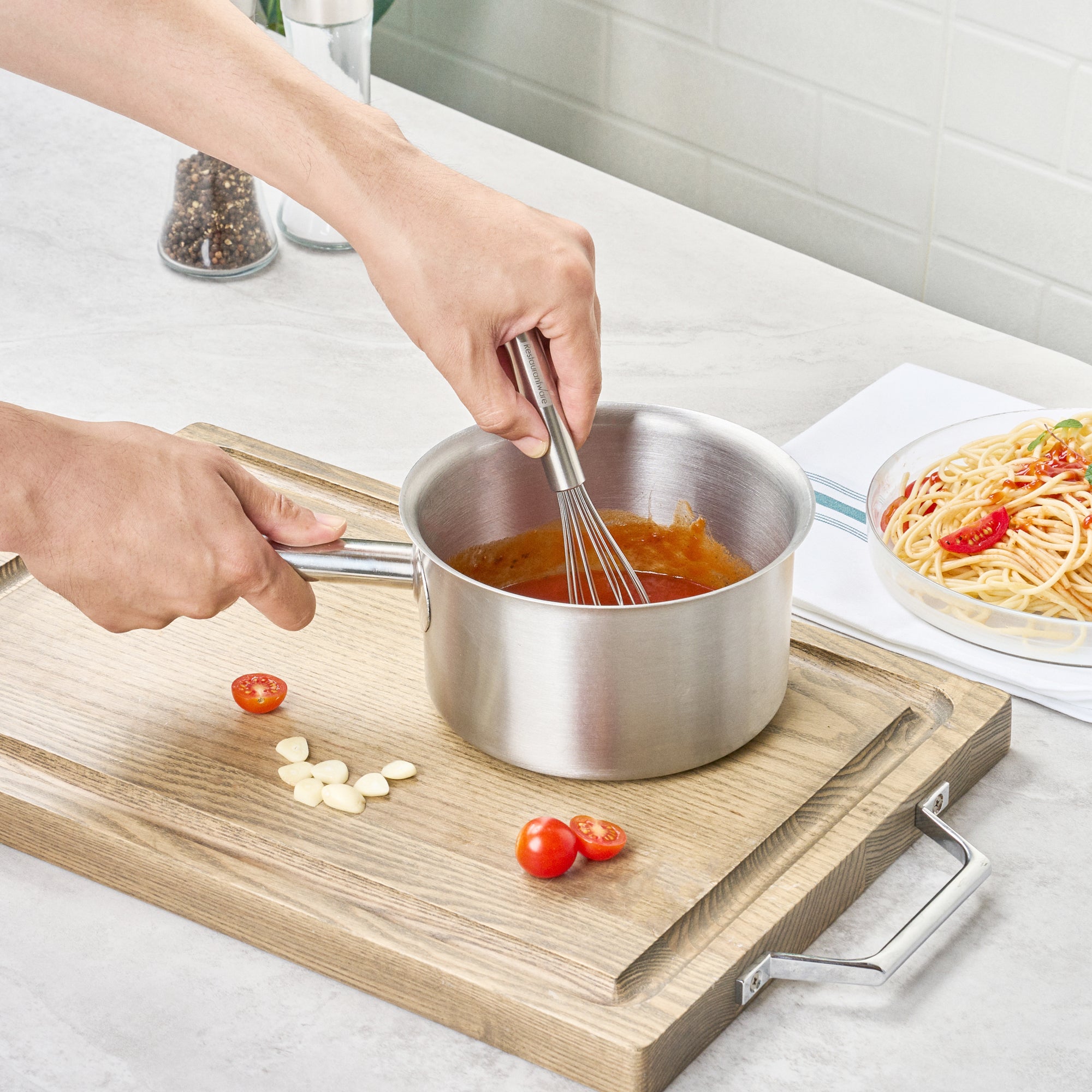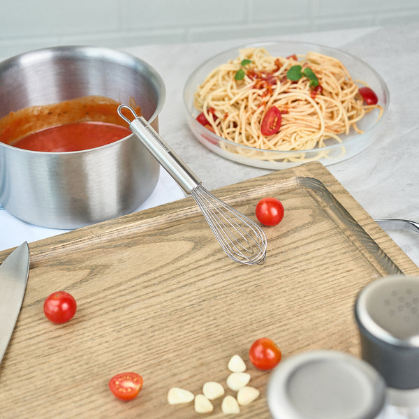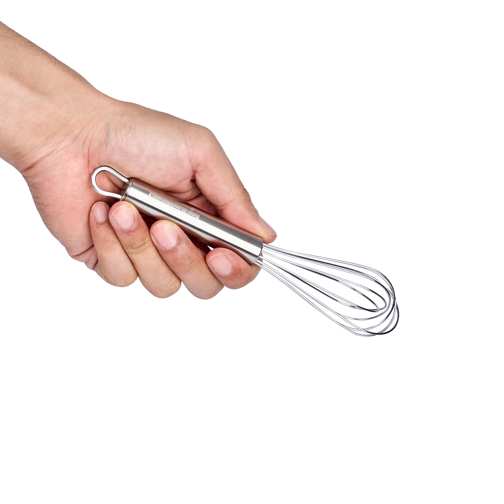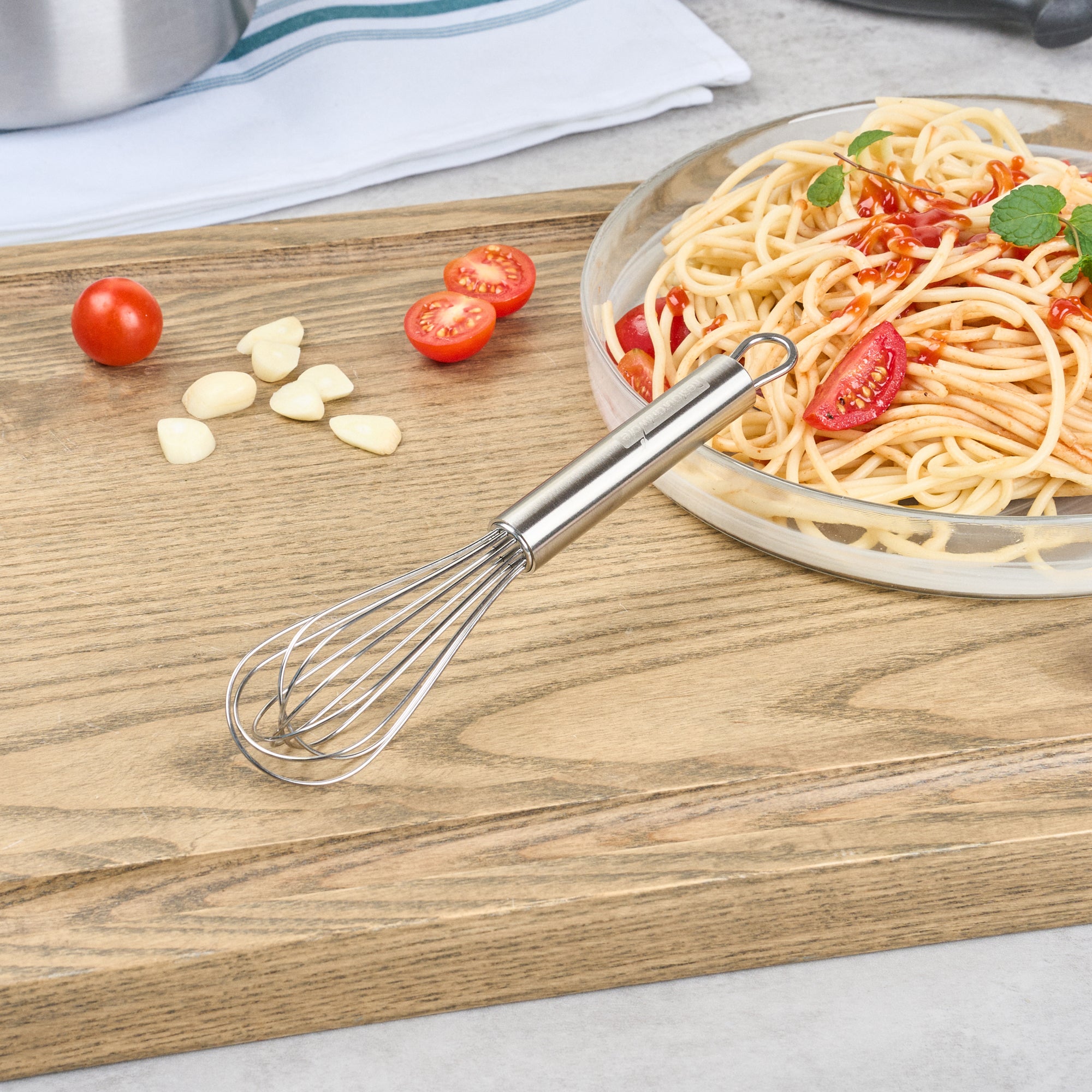 Mix ingredients with precision using a whisk built for durability. The German Standard Stainless Steel Whisk boasts a 7.25-inch length, making it perfect for mixing in small bowls and enhancing precision in culinary tasks. Crafted from high-quality stainless steel, this cooking whisk offers exceptional resistance to corrosion, ensuring long-lasting performance in busy kitchen settings. The French whisk design optimizes aeration and blending, making it an ideal whisk for whipping cream or emulsifying sauces with ease. Featuring an ergonomically designed handle, it reduces hand fatigue during extended use, while the built-in eyelet hook enables organized kitchen storage. Its dishwasher-safe construction simplifies cleanup, fostering hygiene in food preparation areas. Enhance your culinary efficiency with this versatile whisk that combines functionality and comfort. Each order includes 24 German Standard Stainless Steel Whisks.