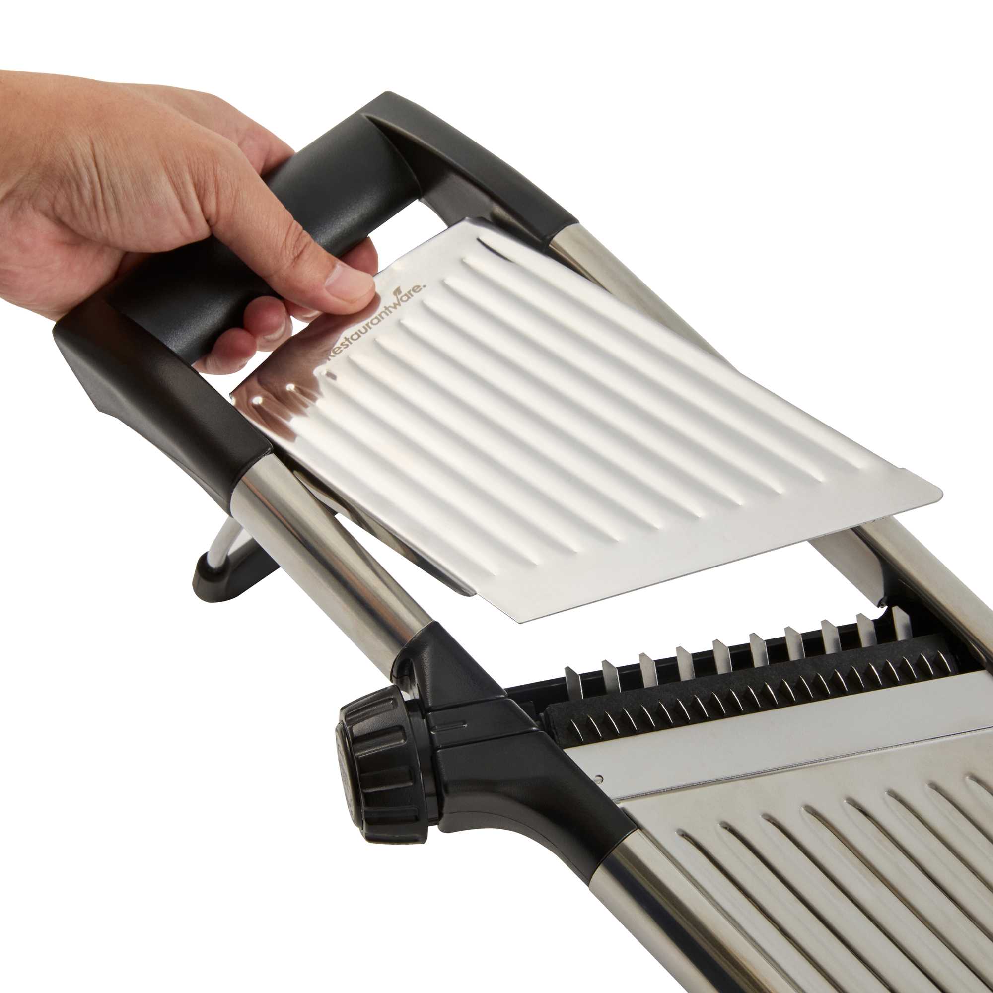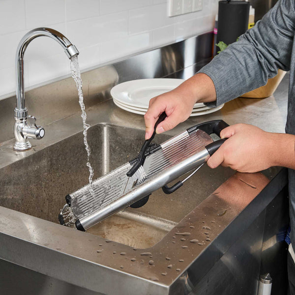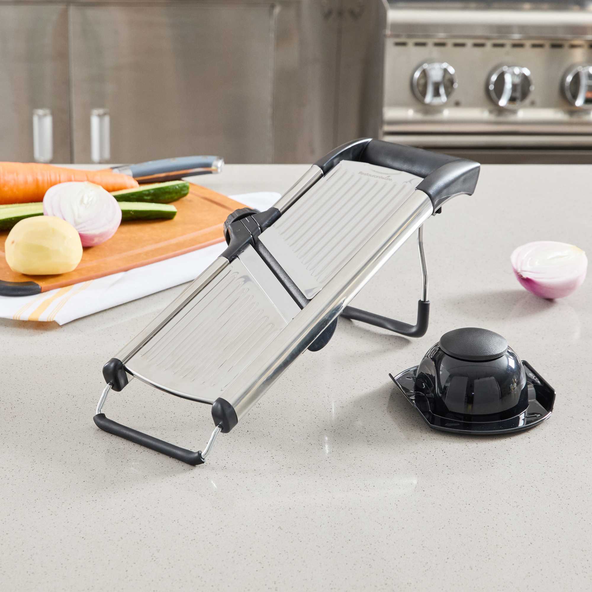 Streamline food prep with our German Standard Stainless Steel Heavy-Duty Adjustable Mandoline Slicer. Engineered for precision and durability, this heavy-duty slicer features an adjustable thickness setting that allows chefs to produce uniform slices quickly, ideal for high-volume commercial kitchens. Equipped with a built-in julienne blade, it’s perfect for crafting consistent vegetable cuts and elegant garnishes that elevate plate presentation. Constructed from stainless steel, this mandoline slicer is dishwasher safe and designed with a compact footprint measuring 16.4 inches by 5.3 inches, ensuring effortless cleanup and efficient storage. To prioritize safety, it includes a pair of cut-resistant gloves, a blade guard, and a cleaning brush, making it a dependable, professional-grade slicing solution. Sold in a 1 count box.