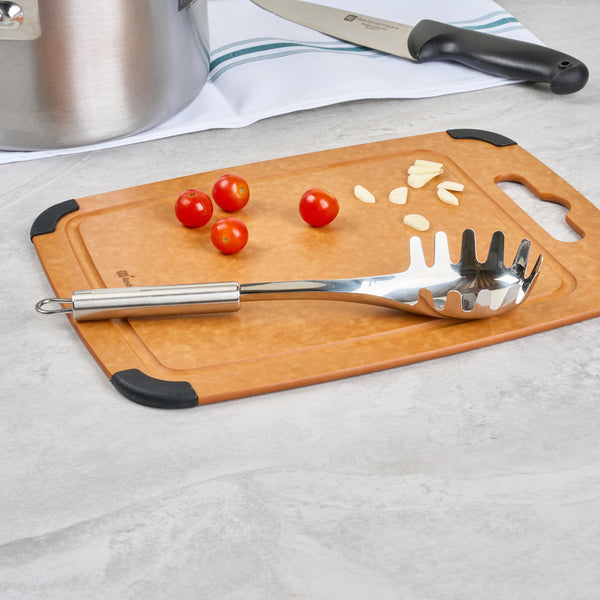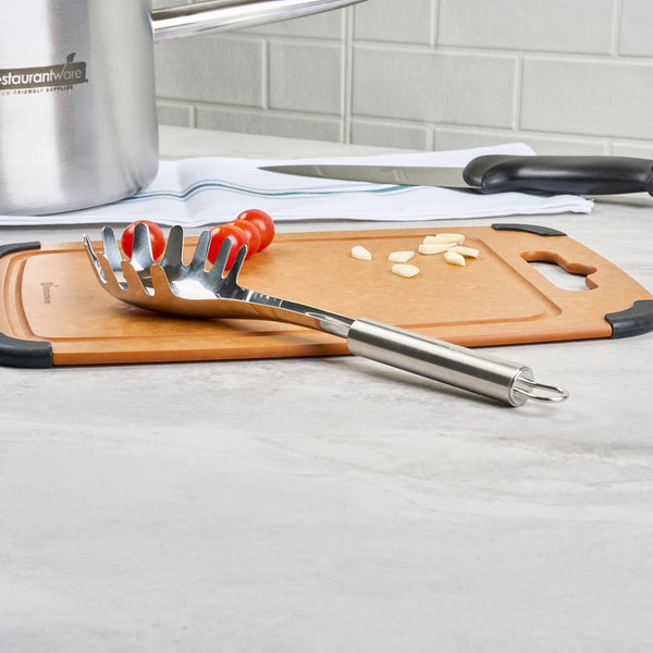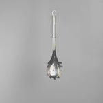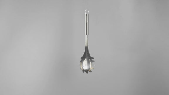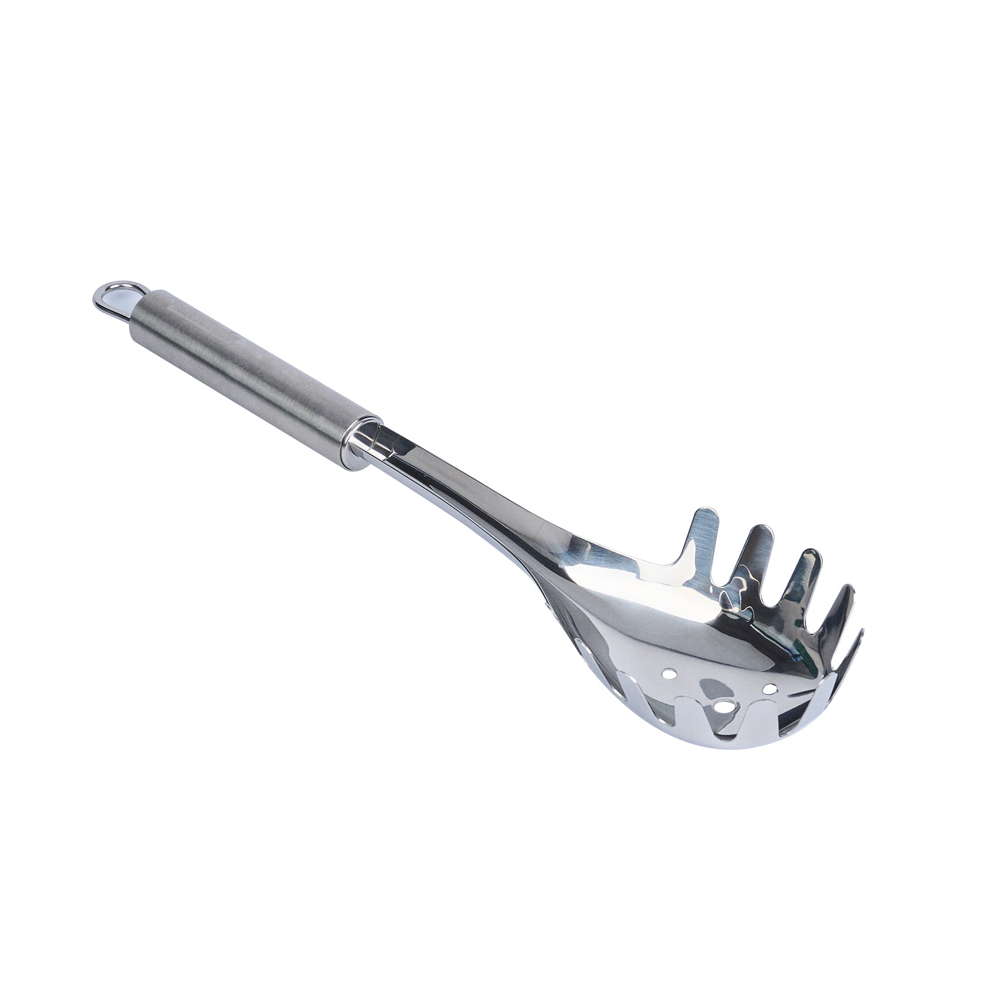 Upgrade your pasta serving game with our German Standard Stainless Steel Pasta Fork. This pasta fork for plating boasts a large slotted bowl, making it easy to scoop up noodles and sauce without excess liquid. The long ergonomic handle of this pasta serving spoon provides a comfortable grip and ample reach and leverage in deep pots. Crafted from durable stainless steel, this spaghetti server can withstand frequent use and ensures lasting performance in your kitchen. For added convenience, the built-in eyelet hook of this pasta server spoon allows for easy storage when not in use. To provide a quick and efficient cleanup, this pasta server is dishwasher-safe and ideal for busy kitchens. This stainless steel pasta fork measures 12.5 inches in length by 2.8 inches in width. Sold in a 1 count box.