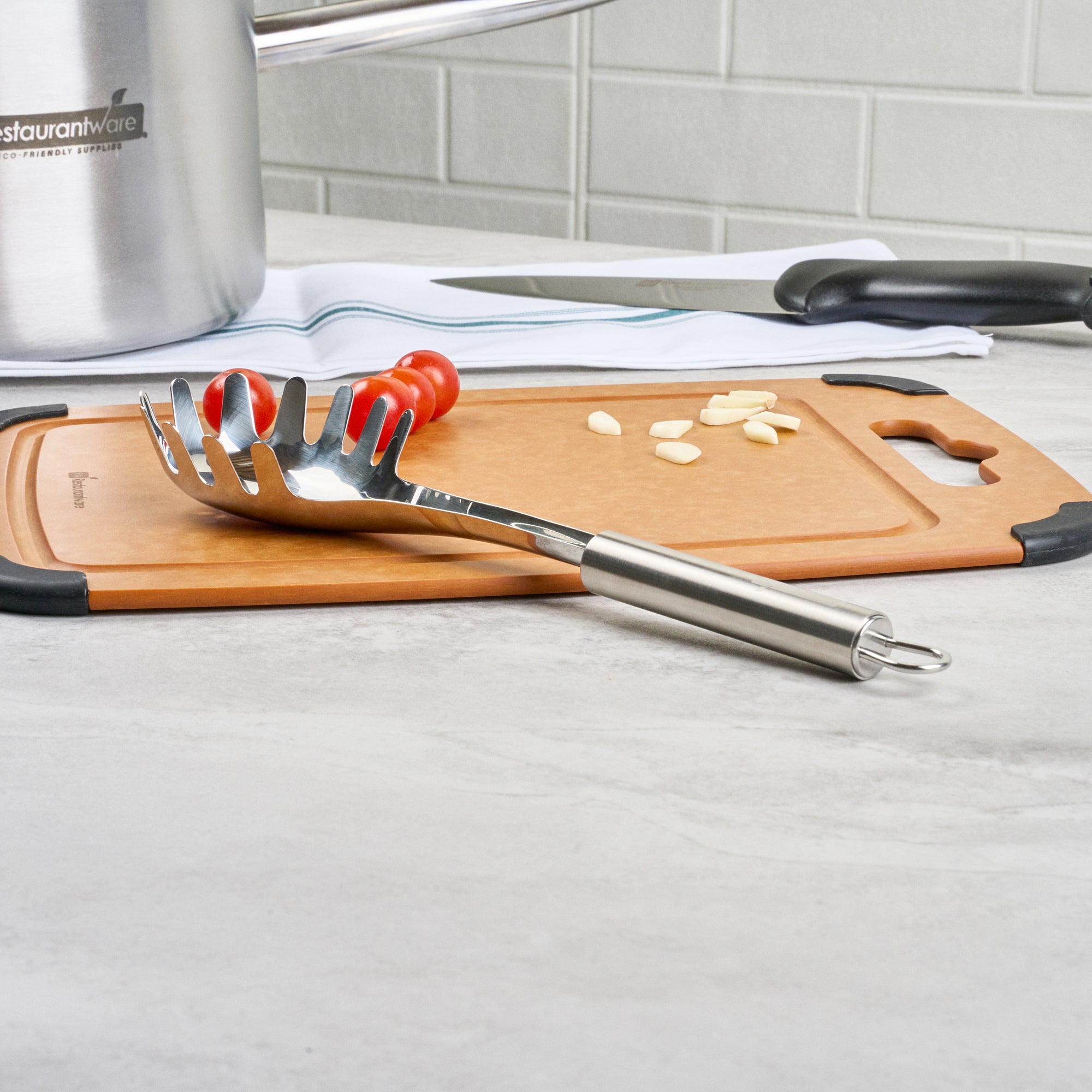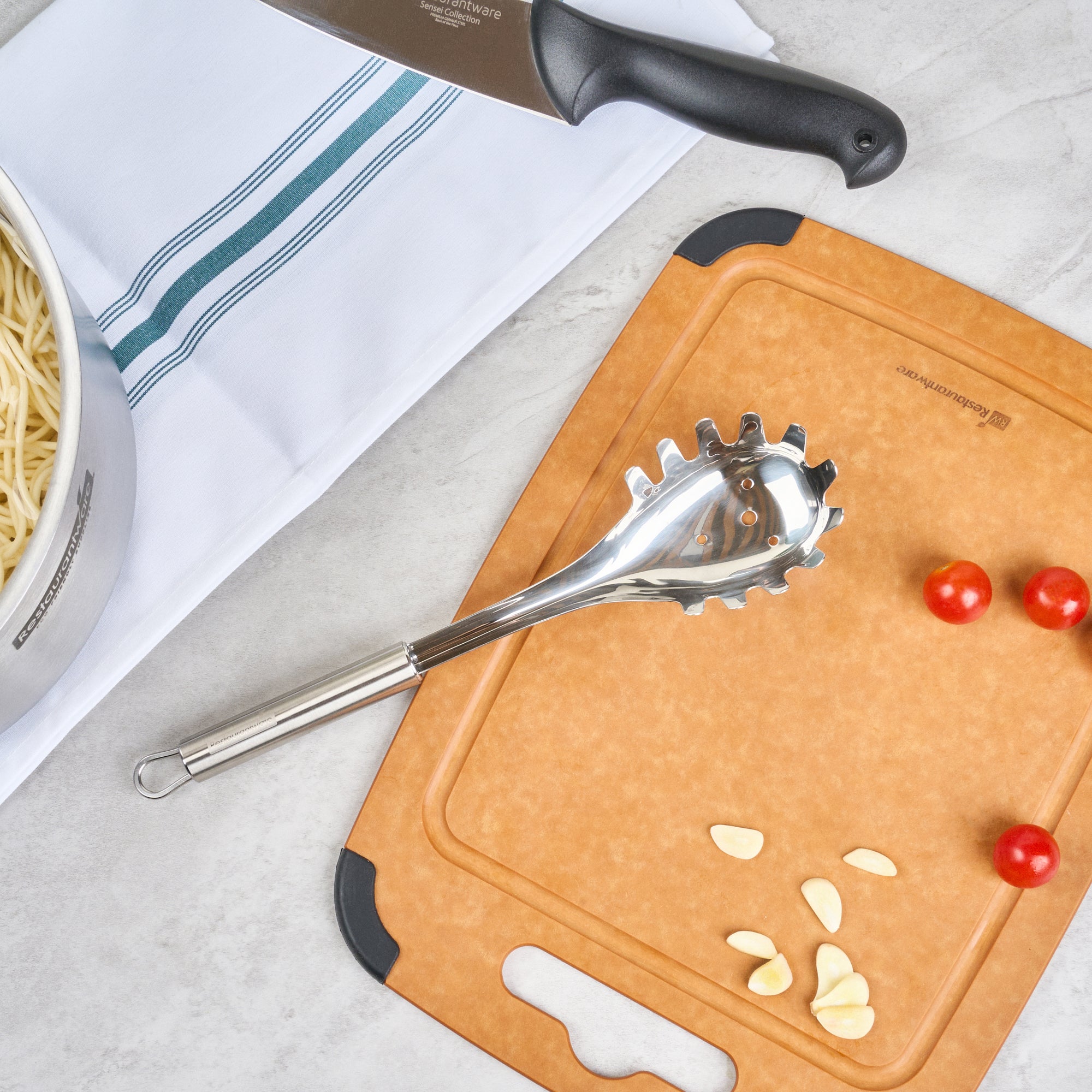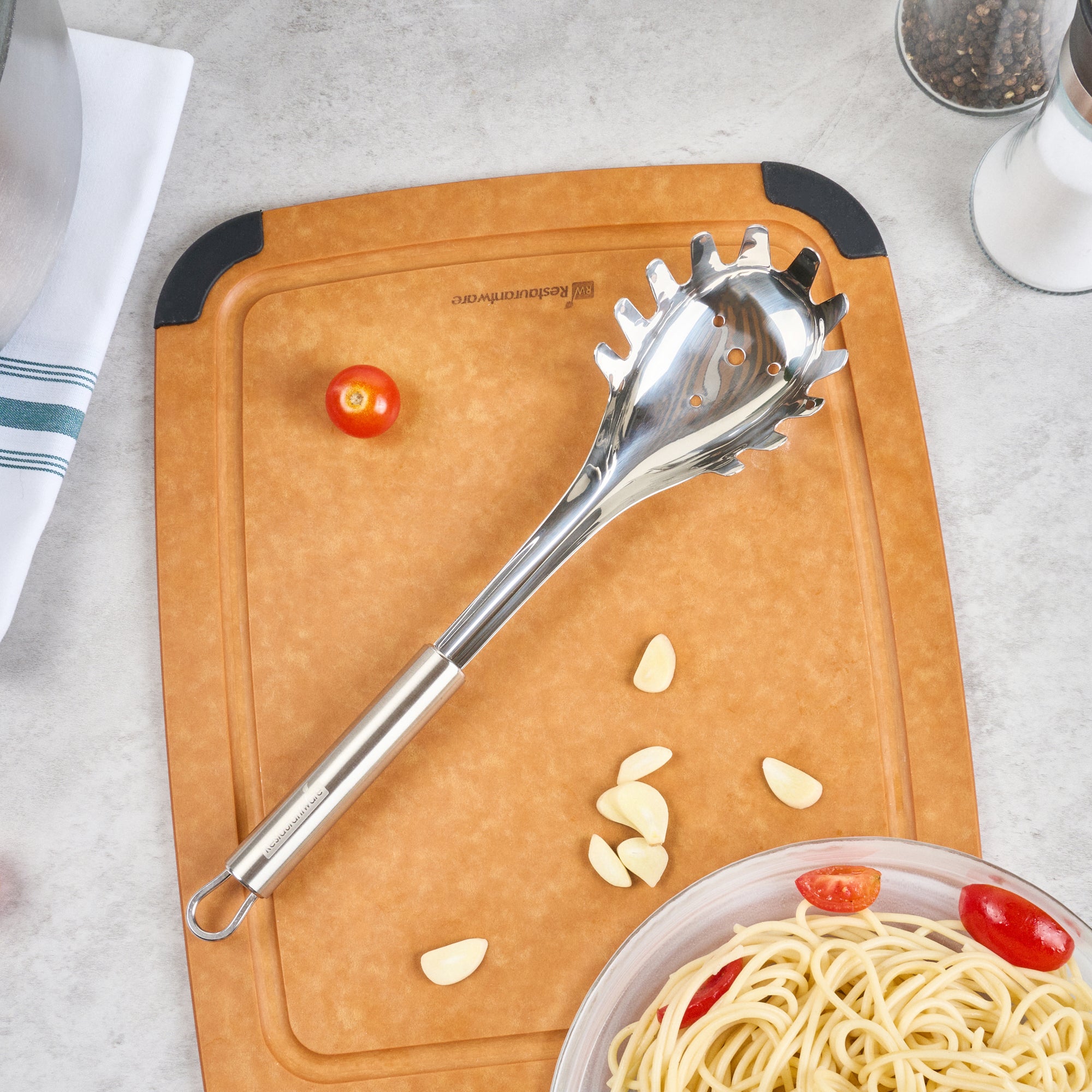 - Large, slotted bowl scoops and drains pasta efficiently for perfect servings