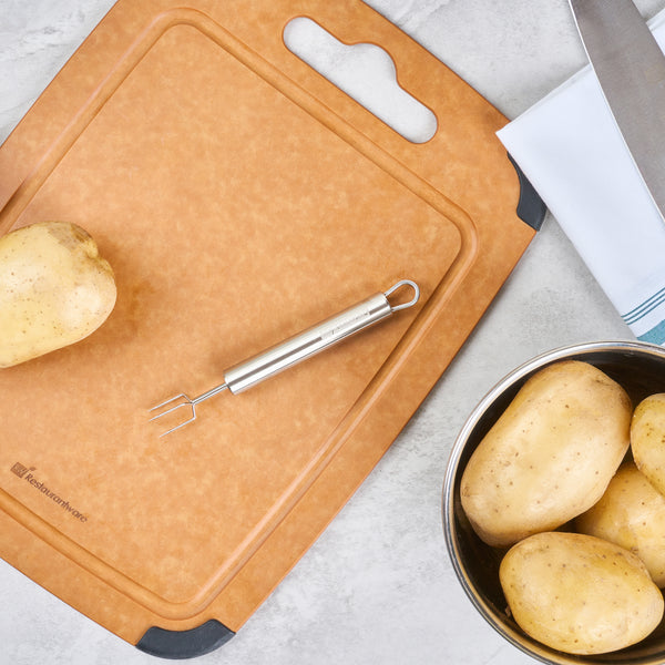 Simplify potato preparation with our ergonomic kitchen tool. The German Standard Ergonomic Potato Peeler Fork, made from stainless steel, combines a sturdy yet comfortable design to elevate your kitchen efficiency. Its durable tines effortlessly pierce the tough skin of hard vegetables, ensuring your potato peeler fork performs seamlessly even in demanding environments. With a heatproof front end, this stainless steel potato fork withstands temperatures, offering safe handling of hot potatoes. Its ergonomic handle reduces hand fatigue, providing enhanced control during long kitchen shifts. Plus, it's dishwasher safe, ensuring quick cleanup in busy kitchens, adding to your operational efficiency. Measuring 6.1 inches in length, this heatproof potato fork is perfect for any busy catering or restaurant setting. Experience the perfect blend of style and functionality in your kitchen. Each order includes 1 German Standard Ergonomic Potato Peeler Fork.