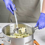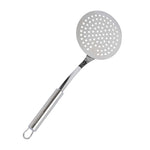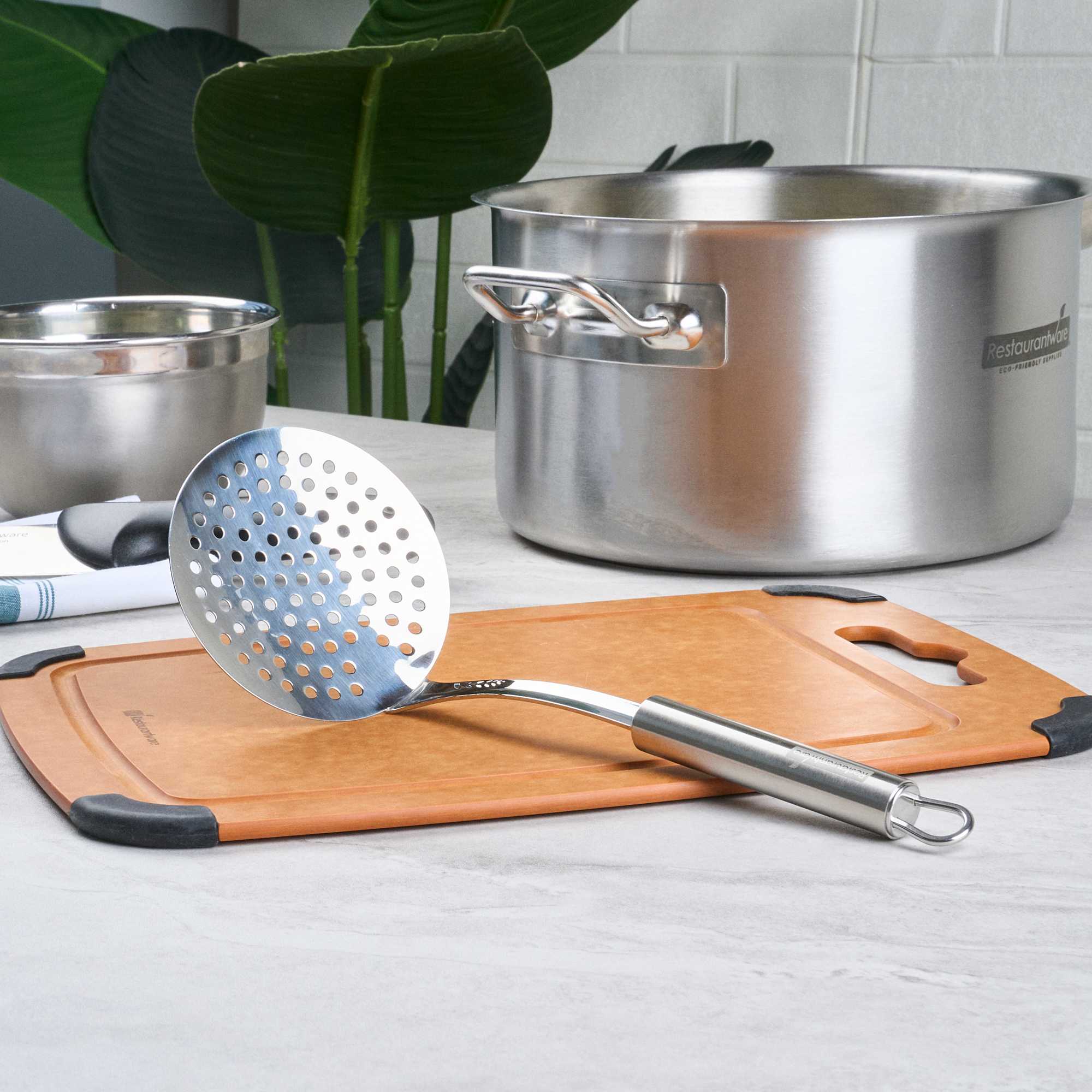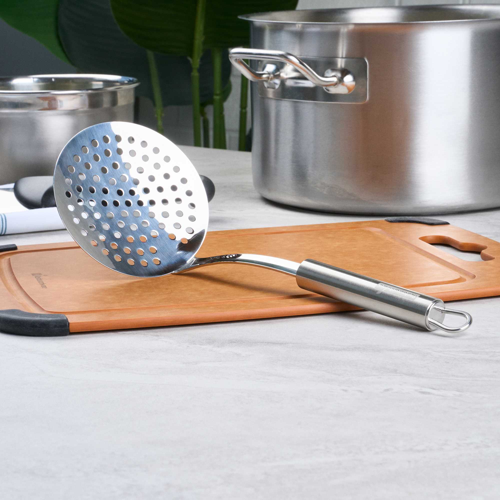 Experience the utmost in culinary efficiency with our German Standard Stainless Steel Skimmers. Featuring a concave head with precision perforated holes, these stainless steel skimmers effortlessly scoop food from hot liquids while retaining the liquid within the pan. Featuring an ergonomic long handle, these slotted spoon ensures a firm grip while retrieving food from liquids or sauces. These skimmer spoons are made from premium stainless steel for robust durability and long-lasting performance in your kitchen. The built-in eyelet hook of these frying spoons allows convenient storage when not in use. For quick and easy cleanup, these fryer spoons are dishwasher-safe and ideal for busy kitchens. These stainless steel skimmer spoons measure 12.1 inches in length by 4.3 inches in width. Sold in a 36 count box.