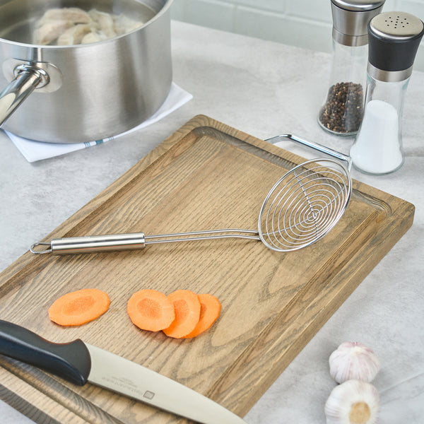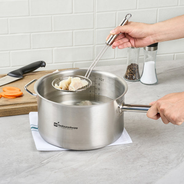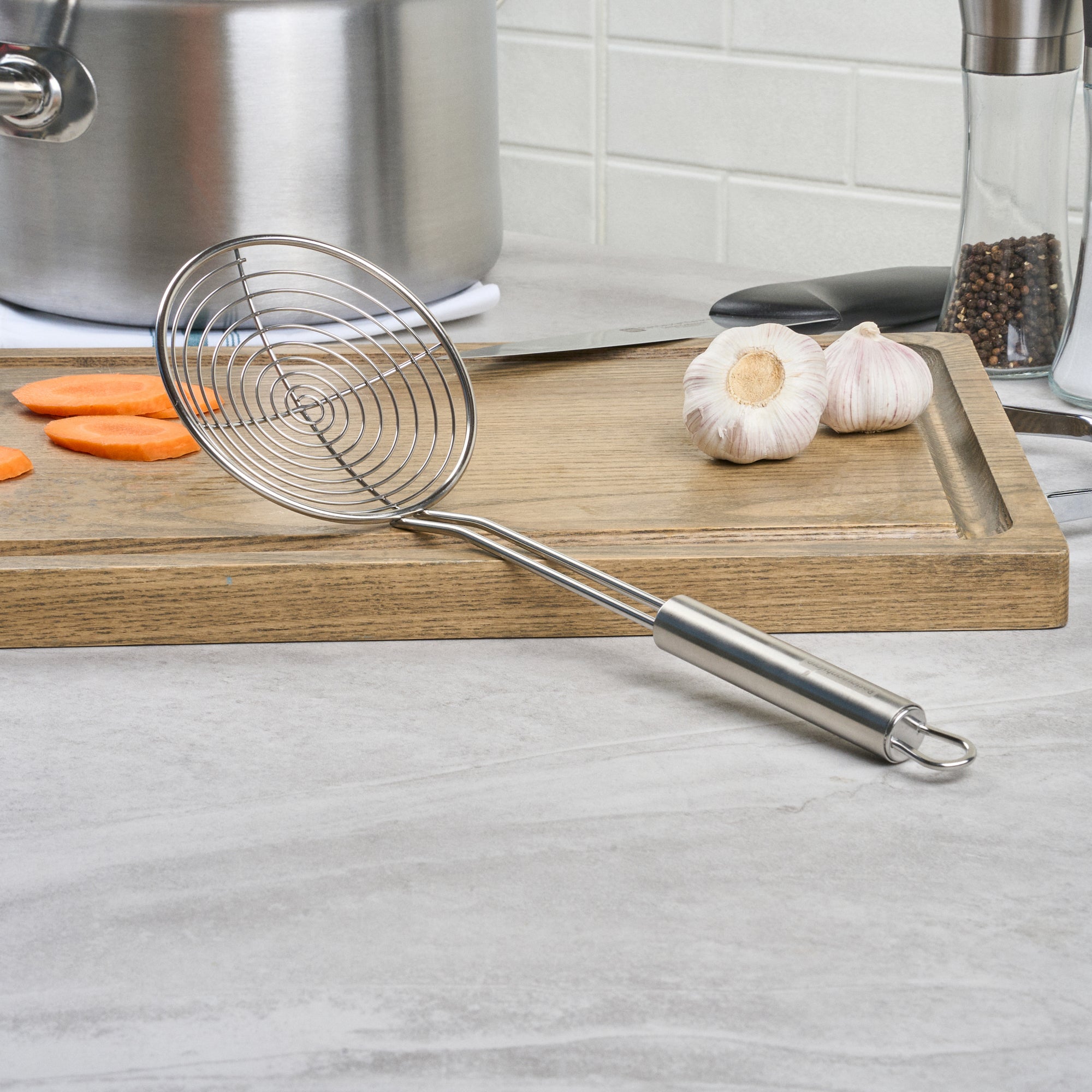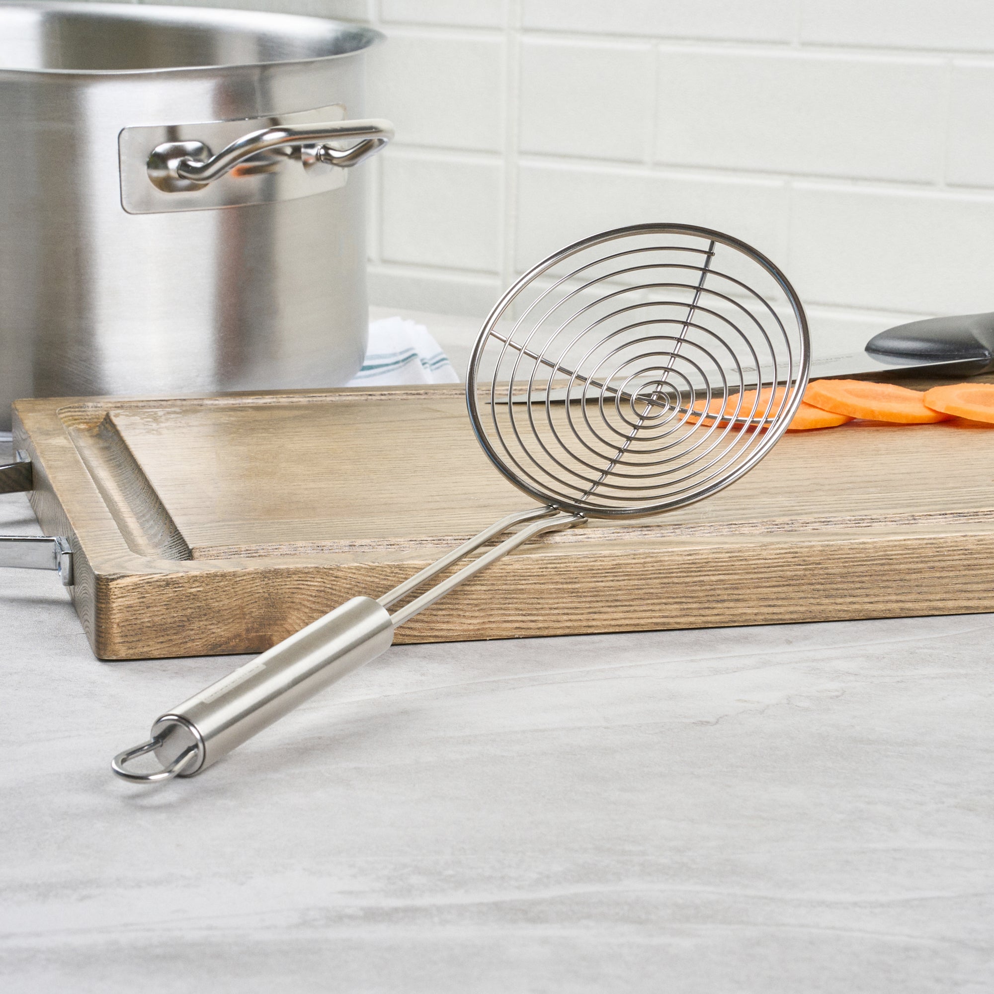 Ensure efficient food preparation with our German Standard Strainer. This stainless steel skimmer features a spiral wire design that facilitates effortless scooping and draining, making it an essential tool for busy kitchens handling deep fryer skimmer tasks. Its durable construction withstands frequent use, ensuring reliable performance in high-volume environments. With an ergonomic handle, this strainer reduces hand fatigue during prolonged use, enhancing worker comfort and safety. The strainer measures 13.9 inches in length with a 4.8-inch diameter head, providing ample reach and surface area, ideal for retrieving blanched vegetables or skimming impurities from broths. Made from corrosion-resistant stainless steel, this skimmer is built to last, maintaining its integrity after repeated exposure to hot liquids. Equip your kitchen with this indispensable tool for streamlined operations. Each order includes 6 German Standard Strainers.