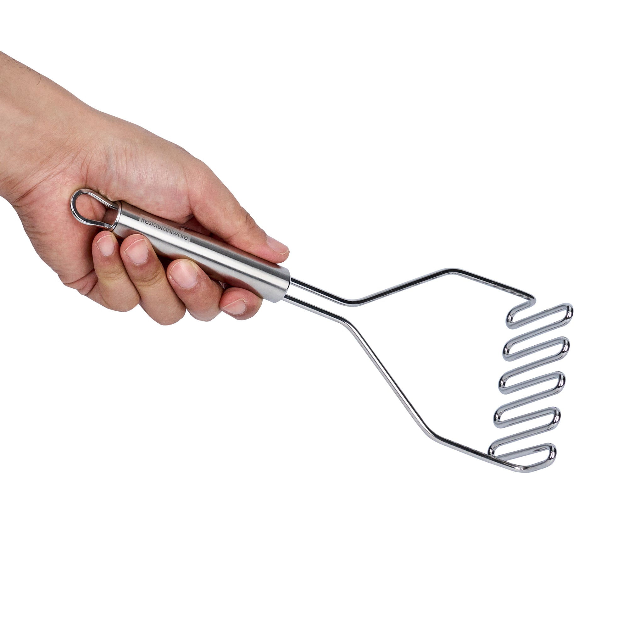 Efficiently mash potatoes and beans with ease. The German Standard Stainless Steel Square-Faced Potato / Bean Masher features a durable stainless steel construction, ensuring resistance to corrosion and ideal performance for heavy-duty use in commercial kitchens. Its unique square-faced design allows this stainless steel masher to provide efficient mashing, reducing preparation time and improving kitchen workflow. Ergonomically designed, the handle offers a comfortable grip, minimizing hand fatigue, and making it an excellent bean masher for extended use. Dishwasher safe, this vegetable masher simplifies kitchen cleanup while maintaining hygiene standards. Enhance your kitchen's efficiency by integrating this reliable mashing tool into your routine. Measuring 11 inches in length by 4.3 inches in width, the square-faced masher makes for a versatile addition to any kitchen. Sold in a 6 count box.