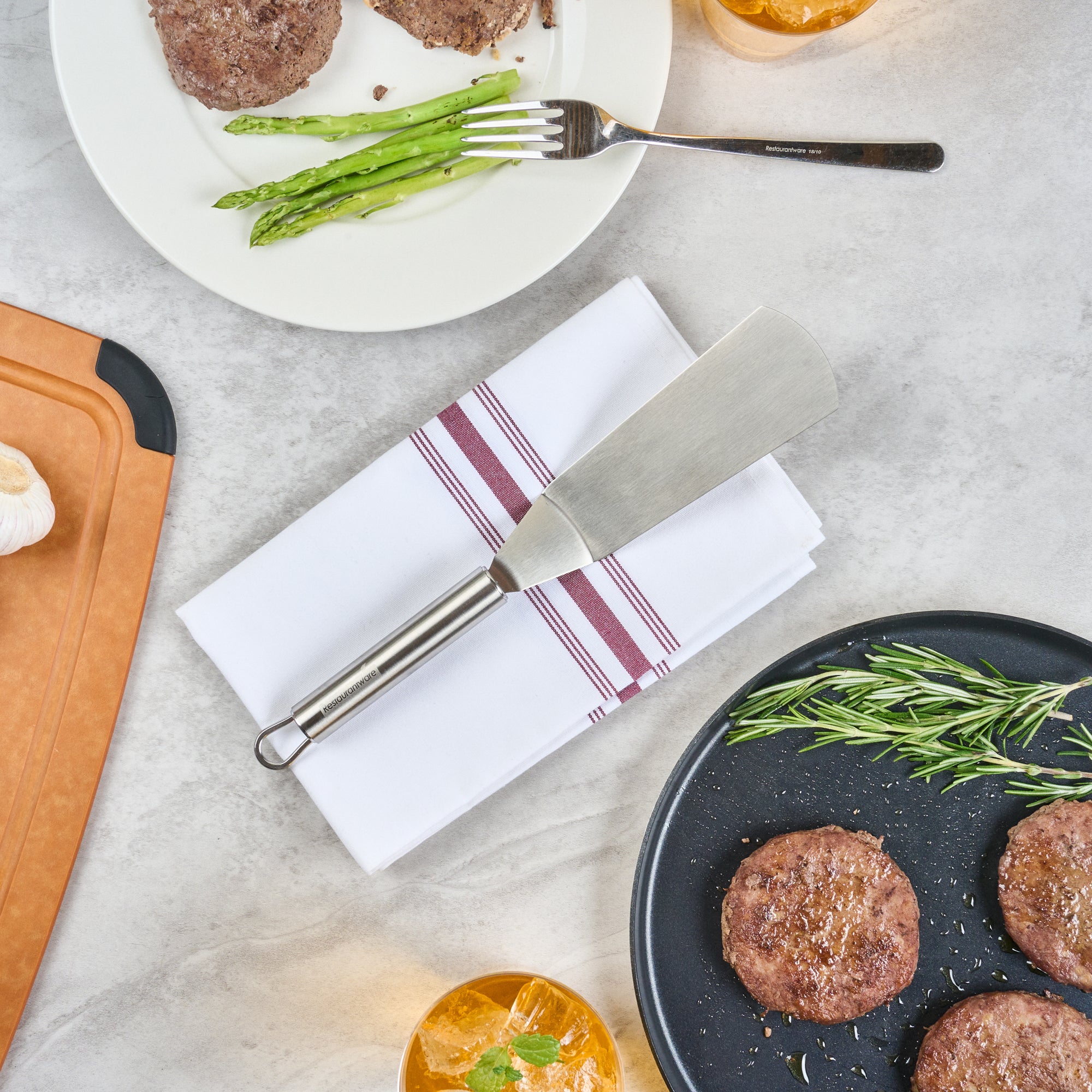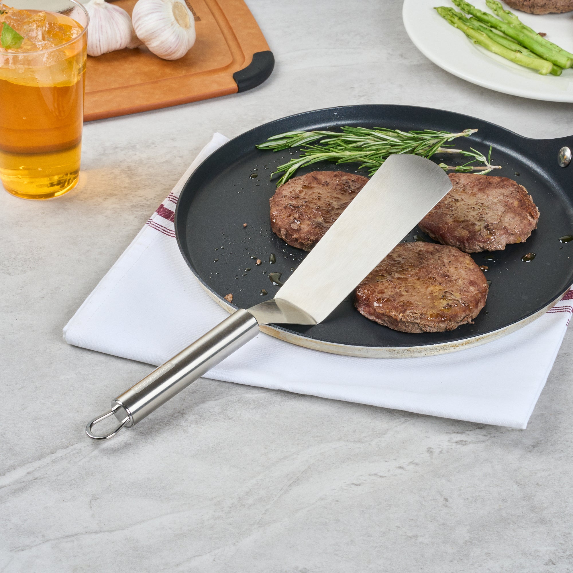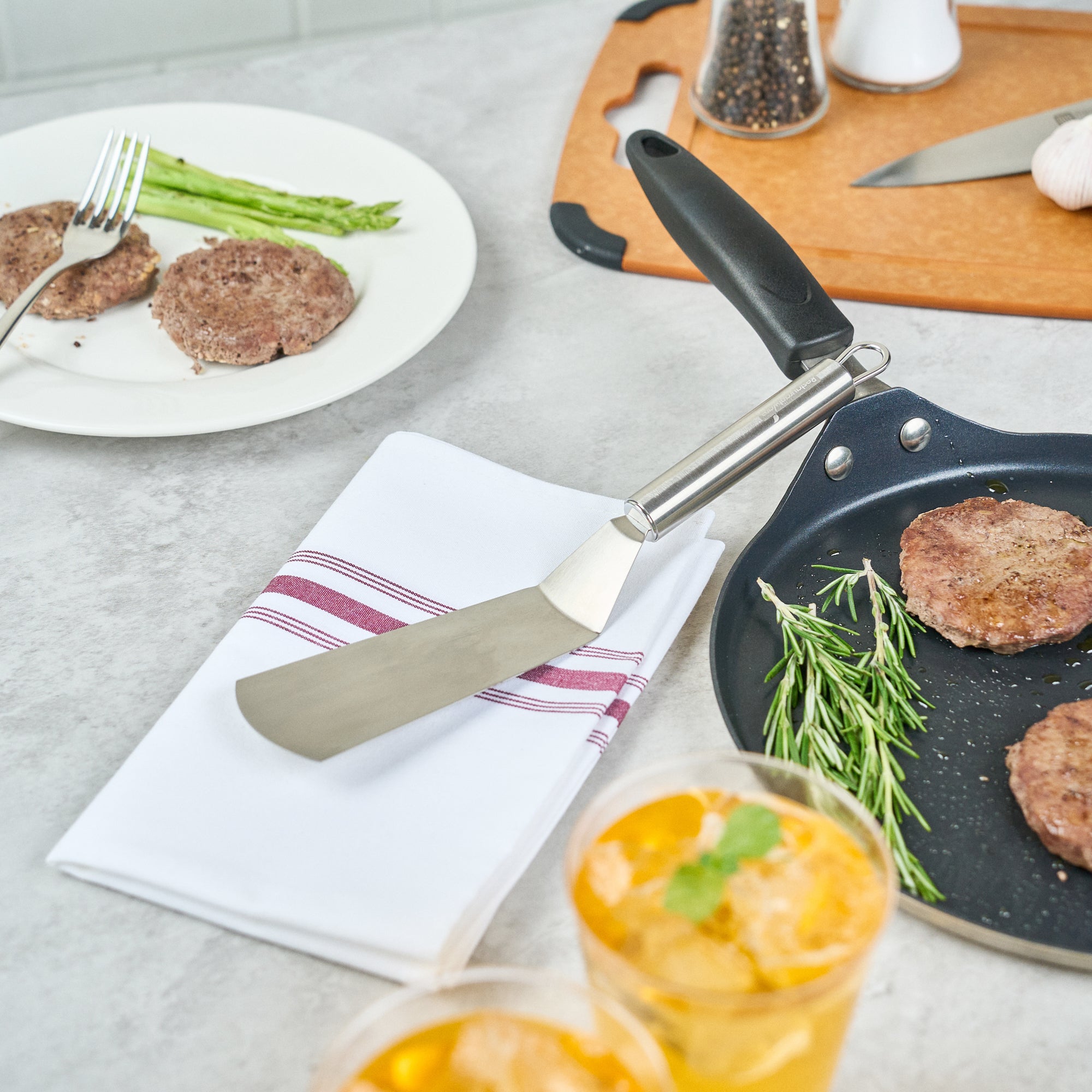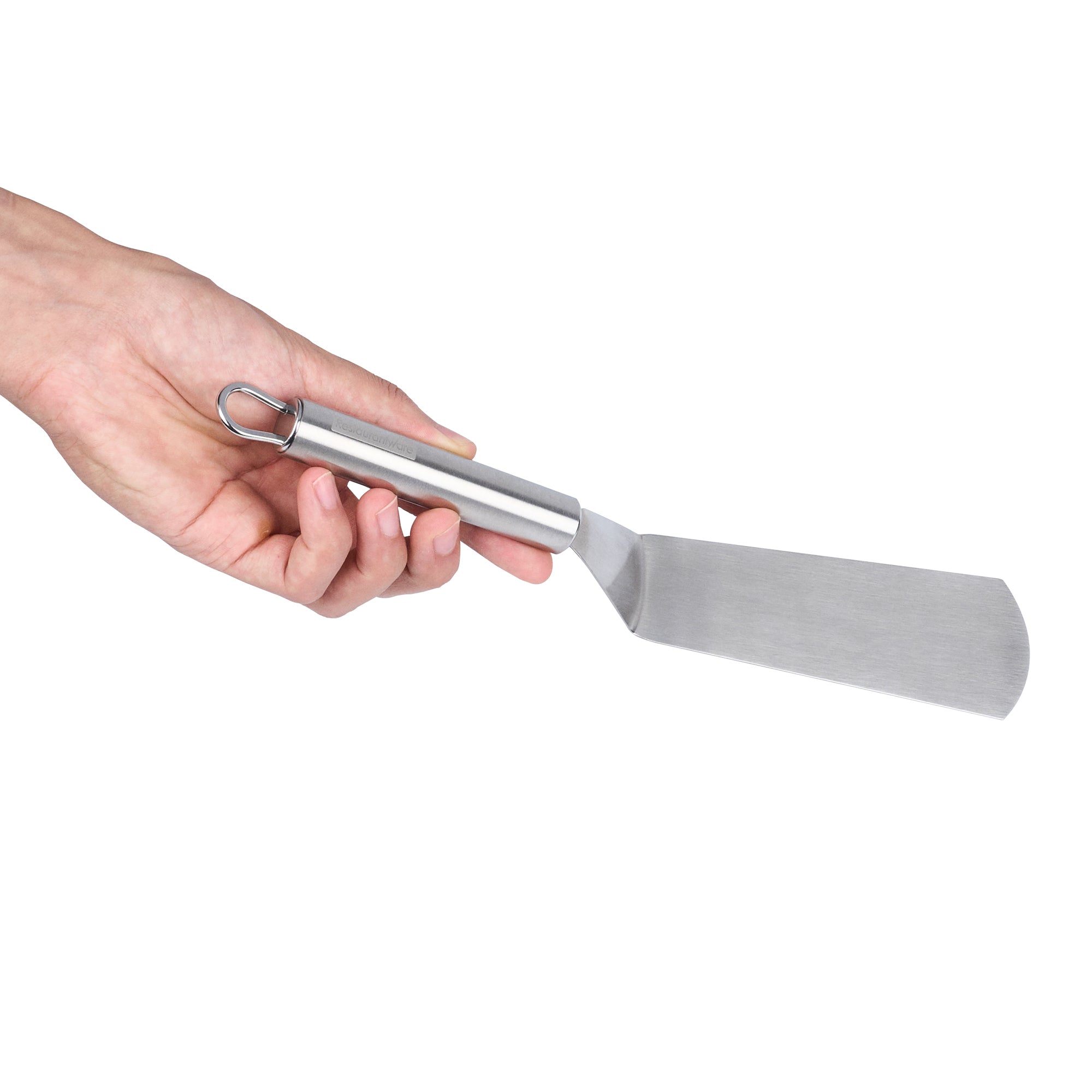 Enhance kitchen efficiency with precision-engineered tools. The German Standard Metal Spatula features robust stainless steel construction that withstands the rigors of frequent use, ensuring long-lasting reliability in restaurants and catering events. With an 11-inch length, this heavy-duty stainless steel spatula provides optimal reach and control, making it ideal for flipping burgers or pancakes. The flat, wide blade of this pancake flipper allows for effortless flips, impressing clients with your culinary skill. An ergonomically designed handle offers a comfortable grip, reducing hand fatigue during extended use and enhancing the productivity of chefs in busy kitchens. Its heat-resistant feature allows safe handling of hot foods, while dishwasher-safe properties facilitate easy cleaning, maintaining hygiene standards effortlessly. Elevate your kitchen operations with this versatile tool perfect for commercial foodservice settings. Each order includes 6 German Standard Metal Spatula.