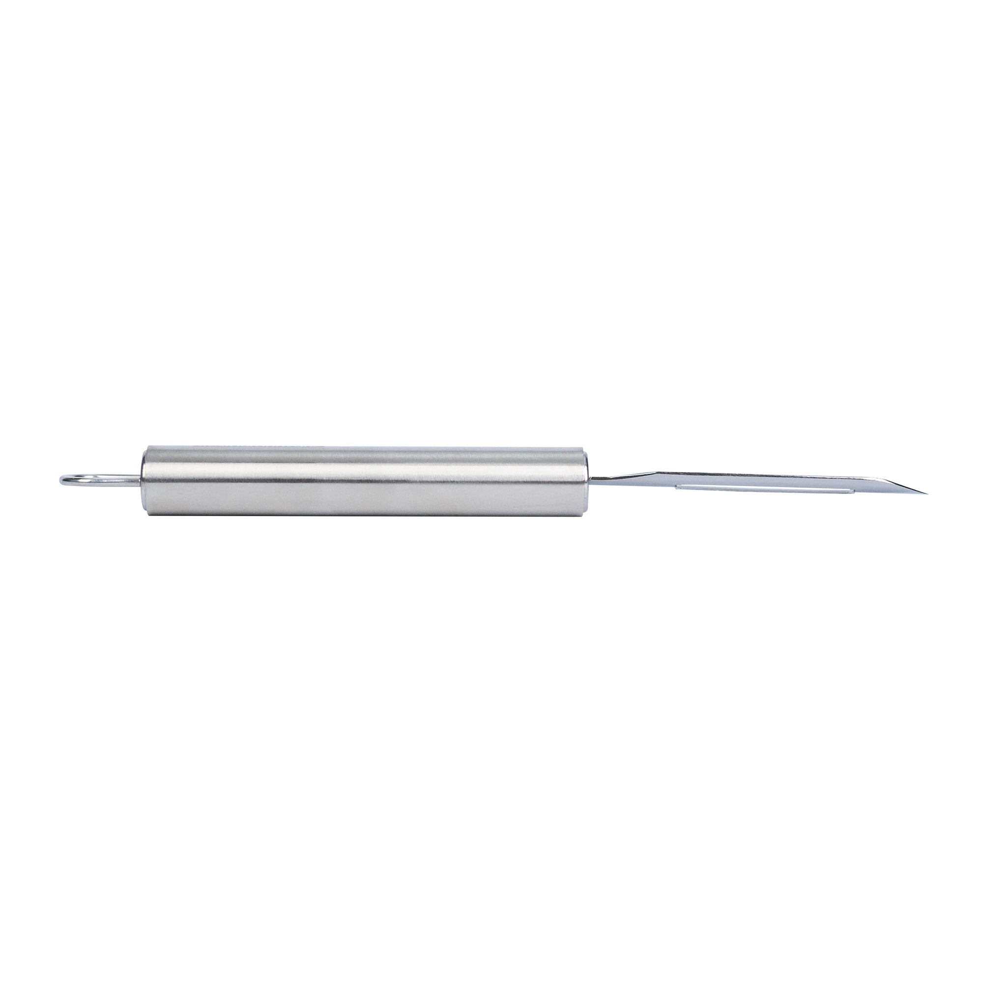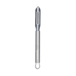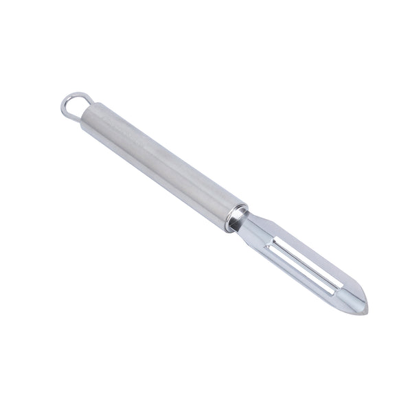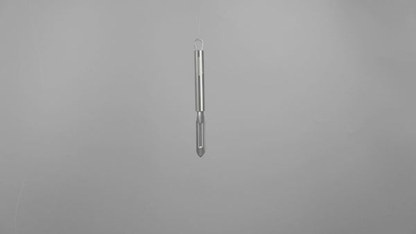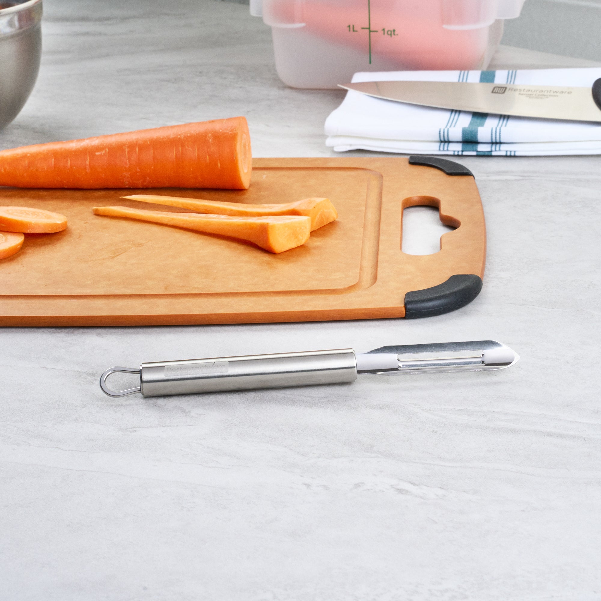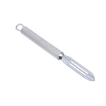 Experience the ease and precision of our German Standard Stainless Steel Vegetable Peeler. The double-edged blade in this vegetable peeler facilitates peeling in both forward and backward motions, offering increased speed and efficiency during food preparation. This potato peeler features a sharp blade that effectively removes the skin from any vegetable, streamlining kitchen tasks and boosting cooking efficiency. Ergonomically designed, the handle of this cucumber peeler ensures a comfortable and secure grip, reducing hand fatigue and providing optimal control during use. Made from stainless steel, this carrot peeler ensures robust performance and longevity in your kitchen. The built-in hook of this peeler for carrot ensures easy storage when not in use. This stainless steel vegetable peeler is dishwasher-safe, offering a quick and efficient cleanup. Measuring 7.6 inches in length, this stainless steel peeler is a compact yet essential tool in your kitchen. Sold in a 1 count box.
