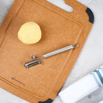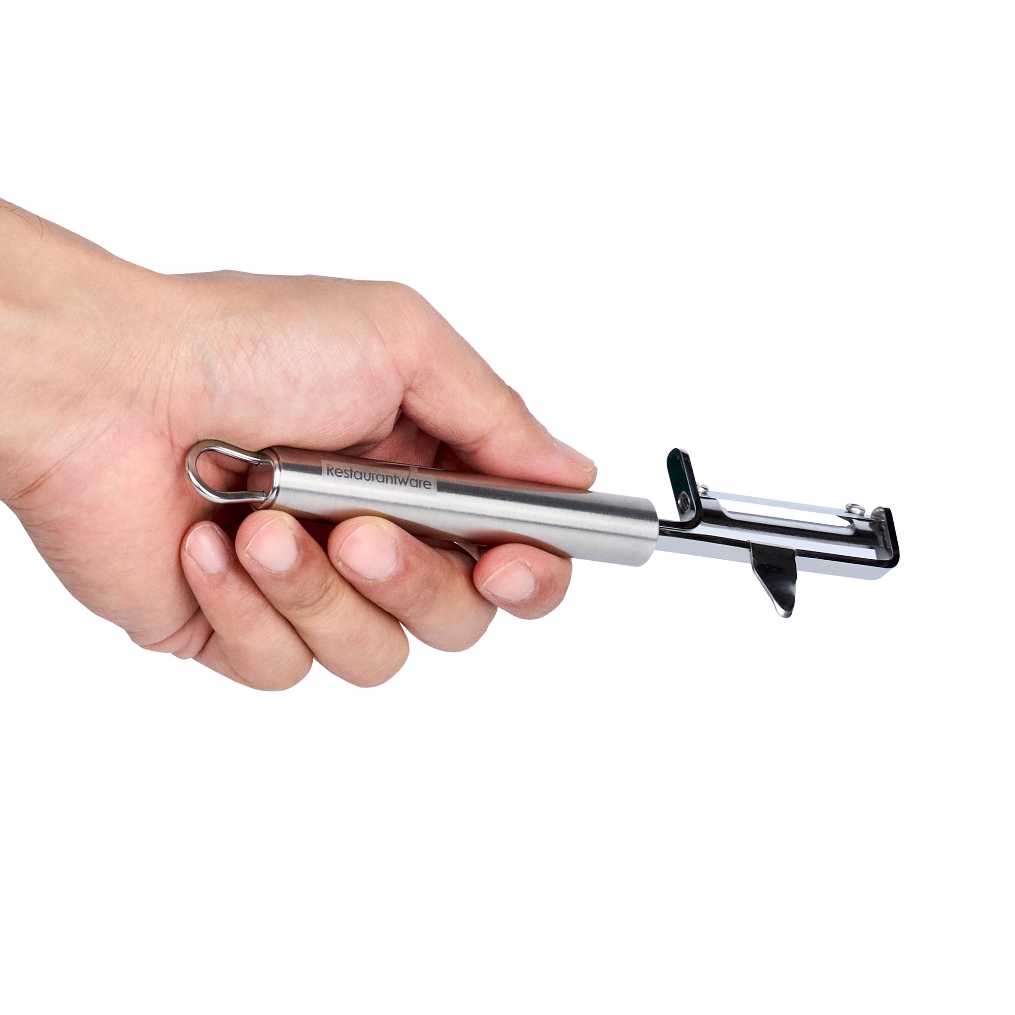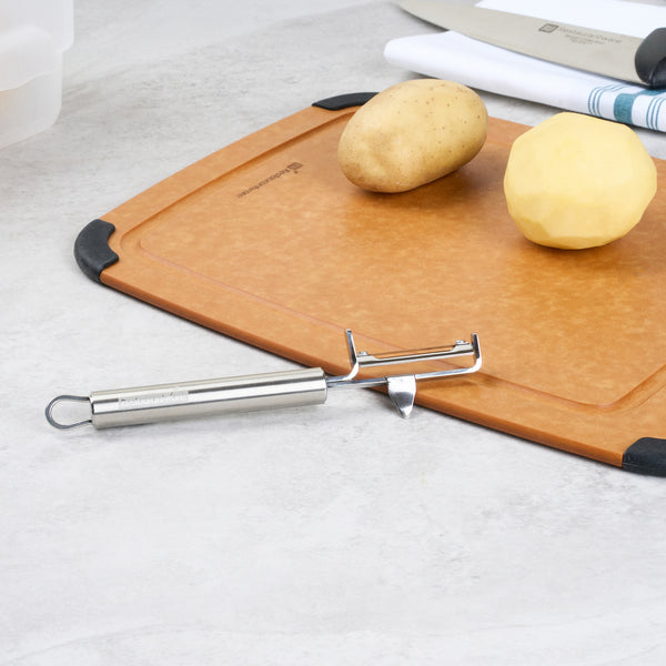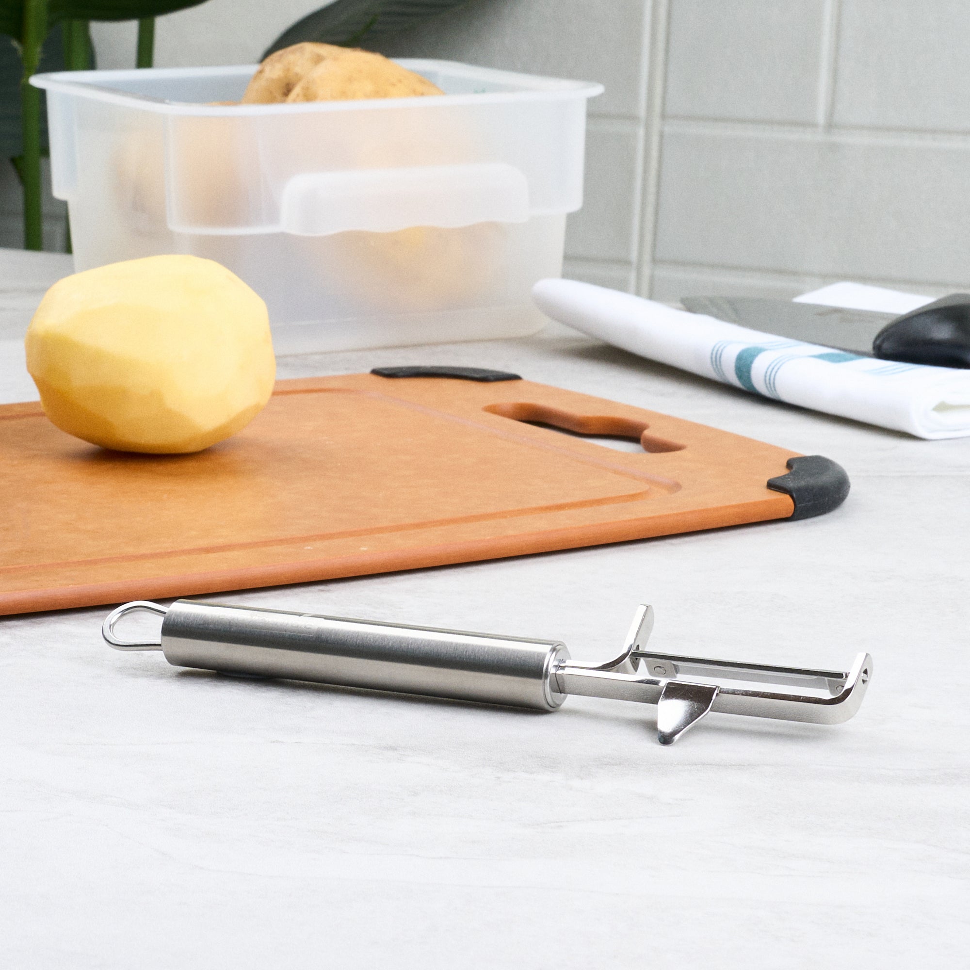 Experience efficient peeling with our German Standard Stainless Steel Vegetable Peeler. Equipped with a swivel blade, this vegetable peeler offers enhanced maneuverability, allowing you to peel fruits and vegetables from various angles. The built-in potato eye remover of this carrot peeler effectively removes unwanted blemishes or sprouts from potatoes. This potato peeler has an ergonomic handle and provides a secure grip, reducing hand fatigue for optimal control. Crafted from stainless steel, this cucumber peeler ensures robust performance and longevity in your kitchen. The integrated hook of this stainless steel peeler provides convenient storage options, allowing you to hang it up for easy access in your kitchen. This stainless steel vegetable peeler is dishwashable for quick and efficient cleanup, making it ideal for busy choices. Measuring 7.4 inches in length, this peeler for carrot is a reliable tool for effortless peeling in the kitchen. Sold in a 1 count box.