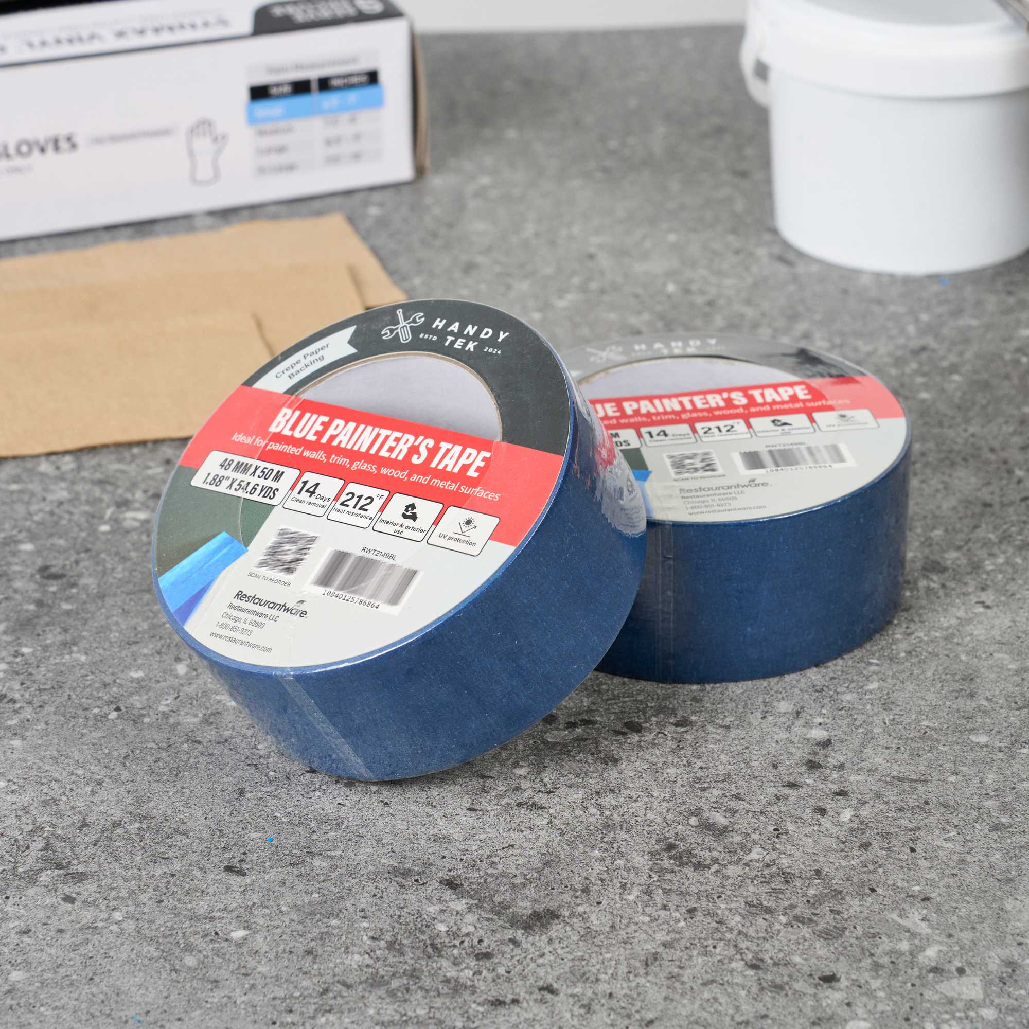Achieve flawless painting results with our Handy Tek Blue Painter's Tape. This versatile masking tape bonds well to metal, glass, wood, making it ideal for a range of painting tasks. Designed to resist moisture and heat, this painter’s tape ensures clean edges and reliable performance. Its flexible crepe paper backing and rubber adhesive allow the adhesive tape to stretch and conform to curves and corners with ease. Hand-tearable and easy to position, this labeling tape simplifies prep and speeds up application. With 6 day clean removal, this painter's tape peels away without residue, making it suitable for indoor use. Measuring 2 inches in width, this painters tape roll features a total length of 54 yards. Sold in a 72 count box.