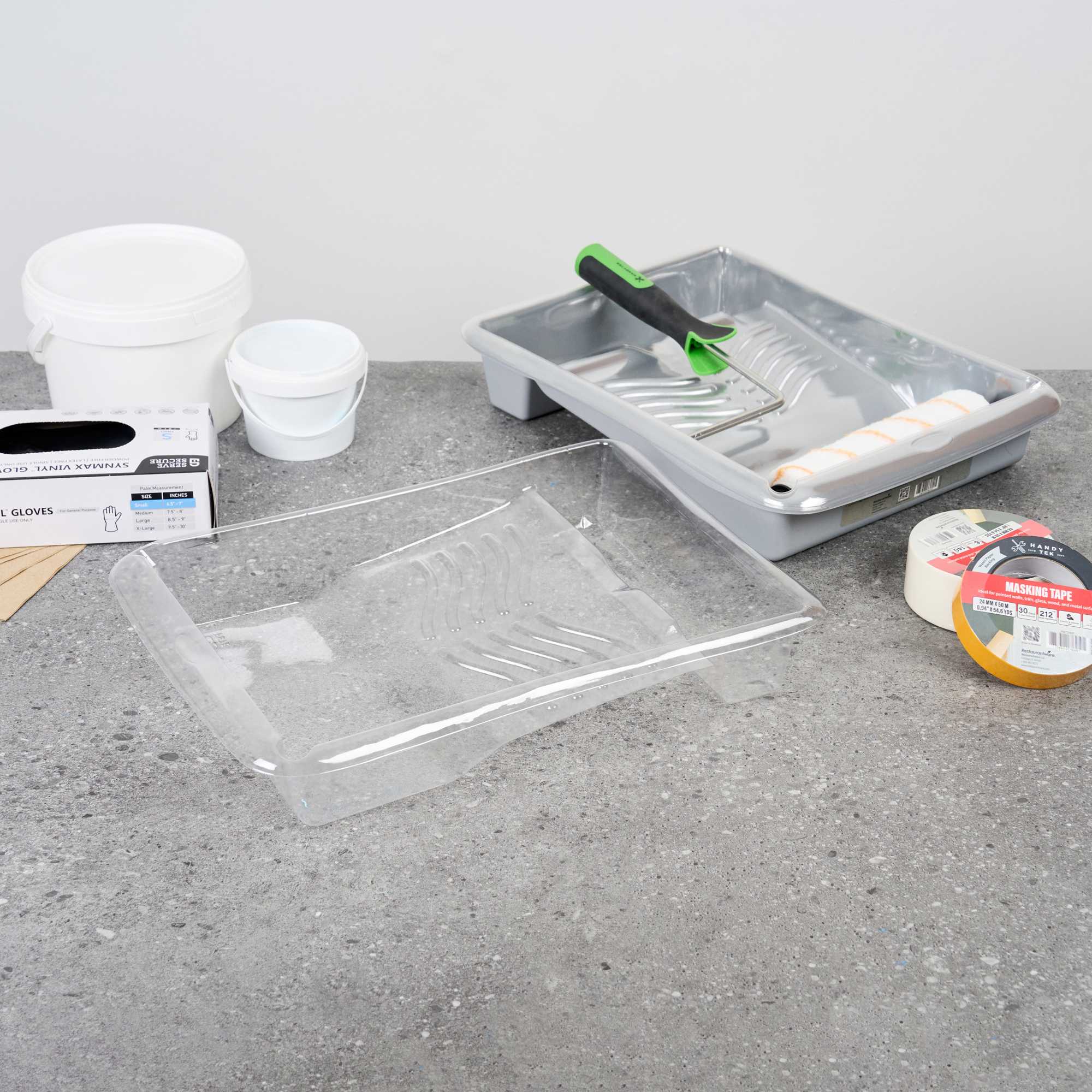 Make painting projects easier, cleaner, and more efficient with our Handy Tek Clear Plastic Paint Tray Liners. These painting tray inserts are designed to fit snugly into our Handy Tek paint tray (SKU: RWT2133GR), preventing slipping or shifting during use. Plastic tray liners like these are great for small-area applications such as trim, edges, and touch-ups. Made from tear-resistant material, these paint tray liners securely hold paint without leaking or tearing, even during heavy use. For added convenience, these paint liners are disposable, making cleanup a breeze and reducing mess on every project. Each paint roller tray liner has a capacity of 6.28 quarts and measures 17.8 inches in length by 12.99 inches in width by 2.95 inches in height. Sold in a 60 count box.