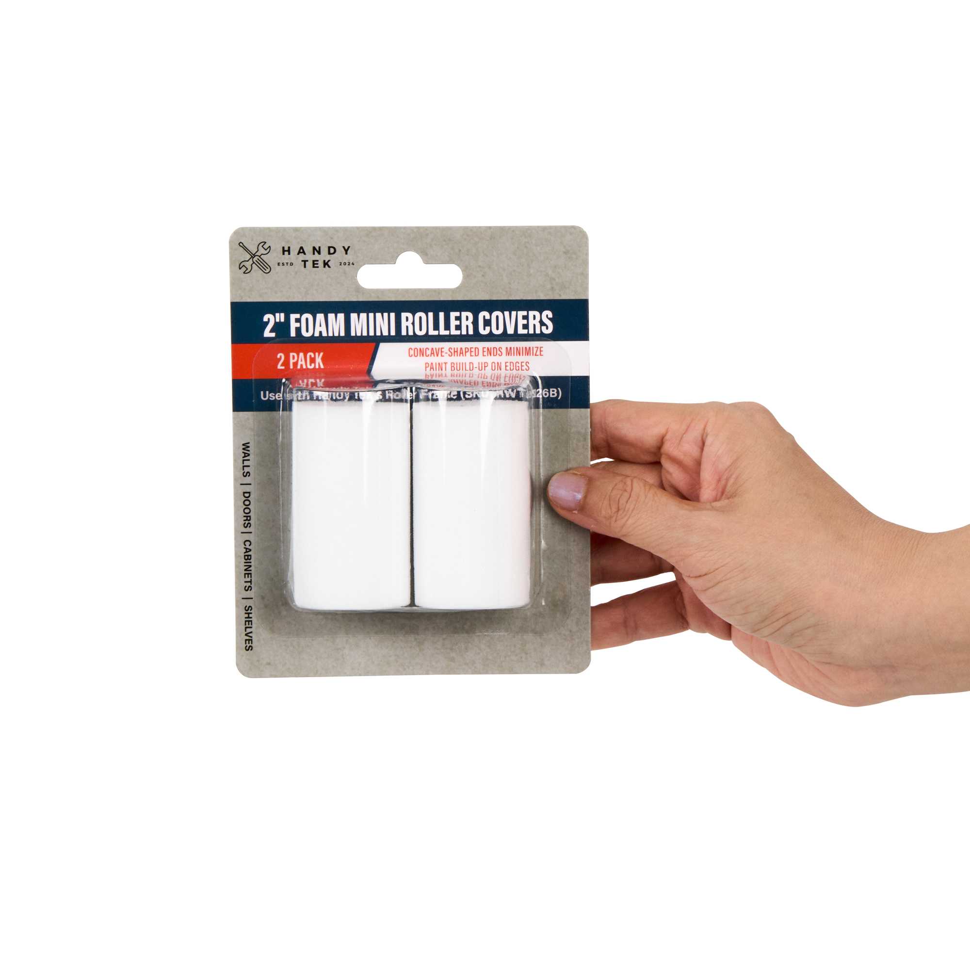 Our Handy Tek Foam Mini Roller Covers are the ultimate solution for achieving a flawless finish on your painting projects. These dense foam roller sheaths deliver a smooth, even result with minimal bubbles, making them excellent for high-gloss and semi-gloss paints. These paint roller covers pair seamlessly with the roller frame (SKU: RWT2126B) for easy and efficient application. The absorbent foam design allows these wall paint rollers to hold more paint, ensuring even coverage with fewer strokes. The concave-shaped ends of these roller covers ensure precise coverage in corners and edges. Reusable and easy to clean, these painting tools offer lasting performance and value. Measuring 2.36 inches in length by 1.38 inches in width by 1.38 inches in height, these paint roller covers are compact yet versatile. Sold in a 48 count box.