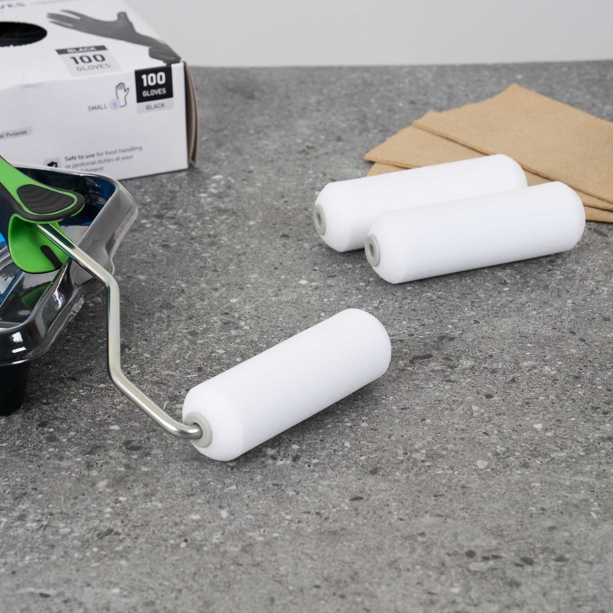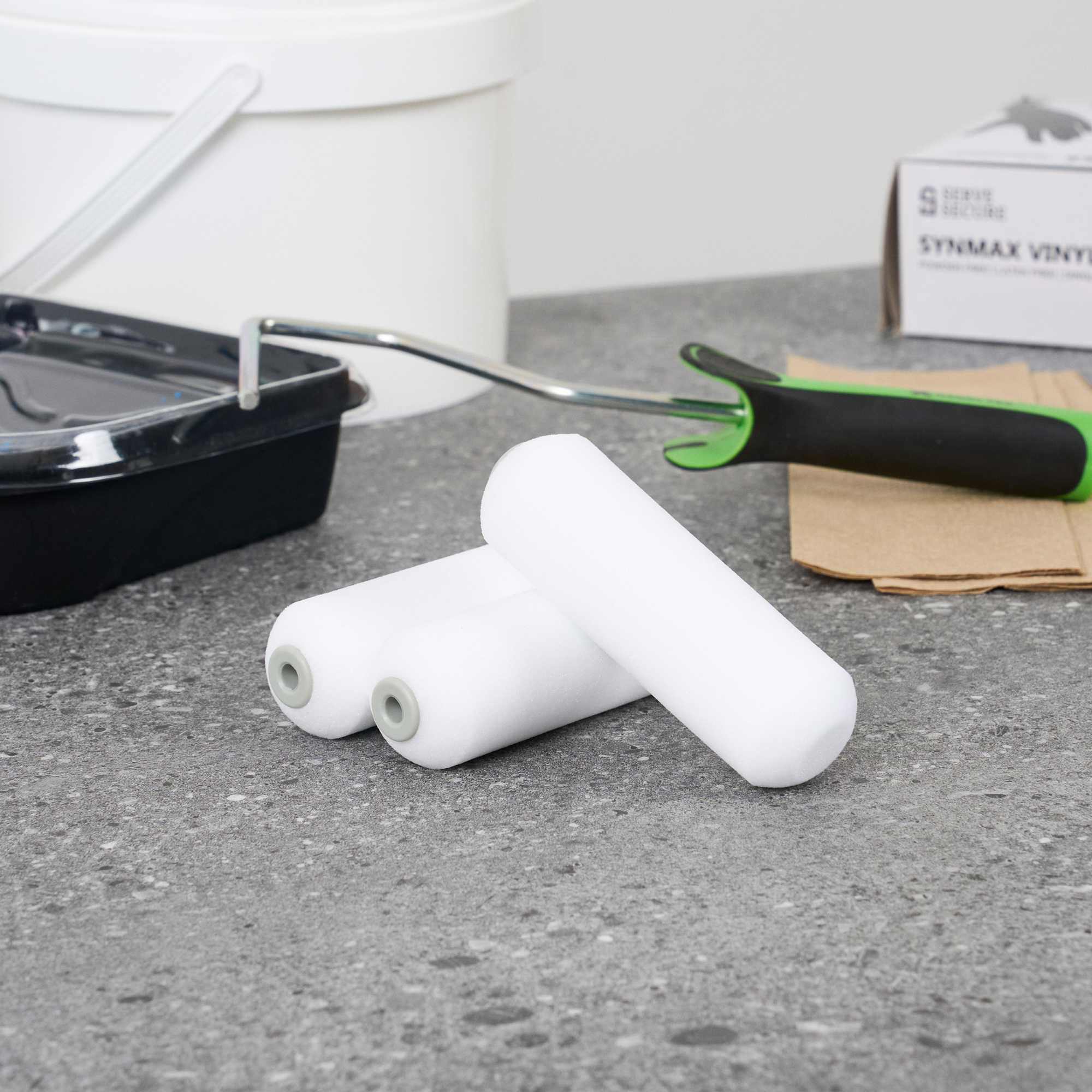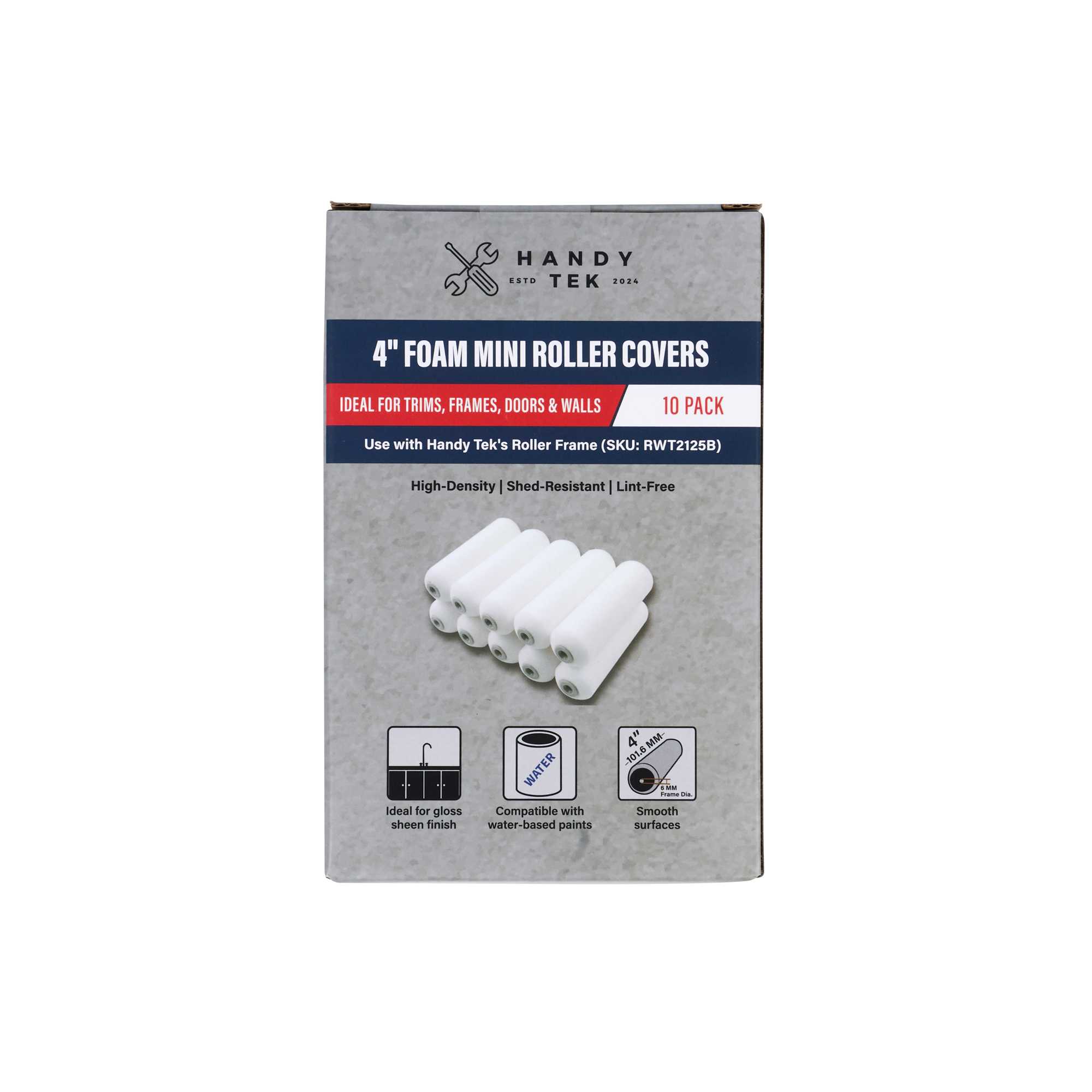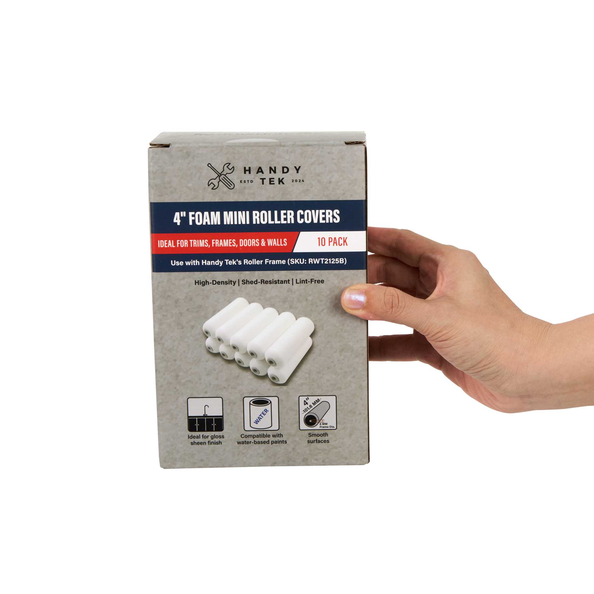 Achieve a smooth, even finish on any surface using our Handy Tek Foam Mini Roller Covers. High-density foam roller covers deliver a spray-like finish with minimal bubbles, ideal for high-gloss and semi-gloss paints. A lint-free, shed-resistant design ensures each foam roller cover applies cleanly without imperfections. Thermo-bonded design helps the paint roller cover maintain shape and consistent performance. Pair the foam paint roller cover with our roller frame (SKU: RWT2125B) for quick and secure setup. Absorbent roller sheaths hold more paint to reduce streaks and cut down on touch-ups. Solvent-resistant wall paint roller covers work with both oil- and water-based paints for added versatility. Perfect for trims, frames, doors, and walls, each foam applicator cover offers reliable precision. Measuring 4.33 inches in length by 1.34 inches in width by 1.34 inches in height, each paint roller cover is compact and efficient. Sold in a 240 count box.