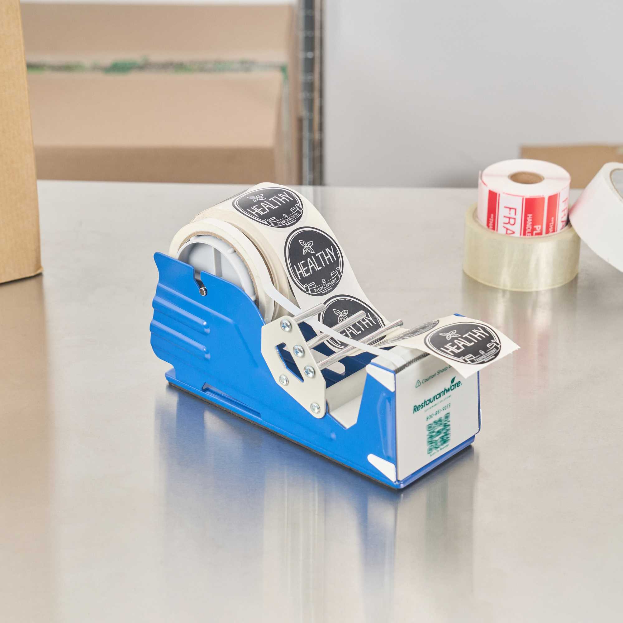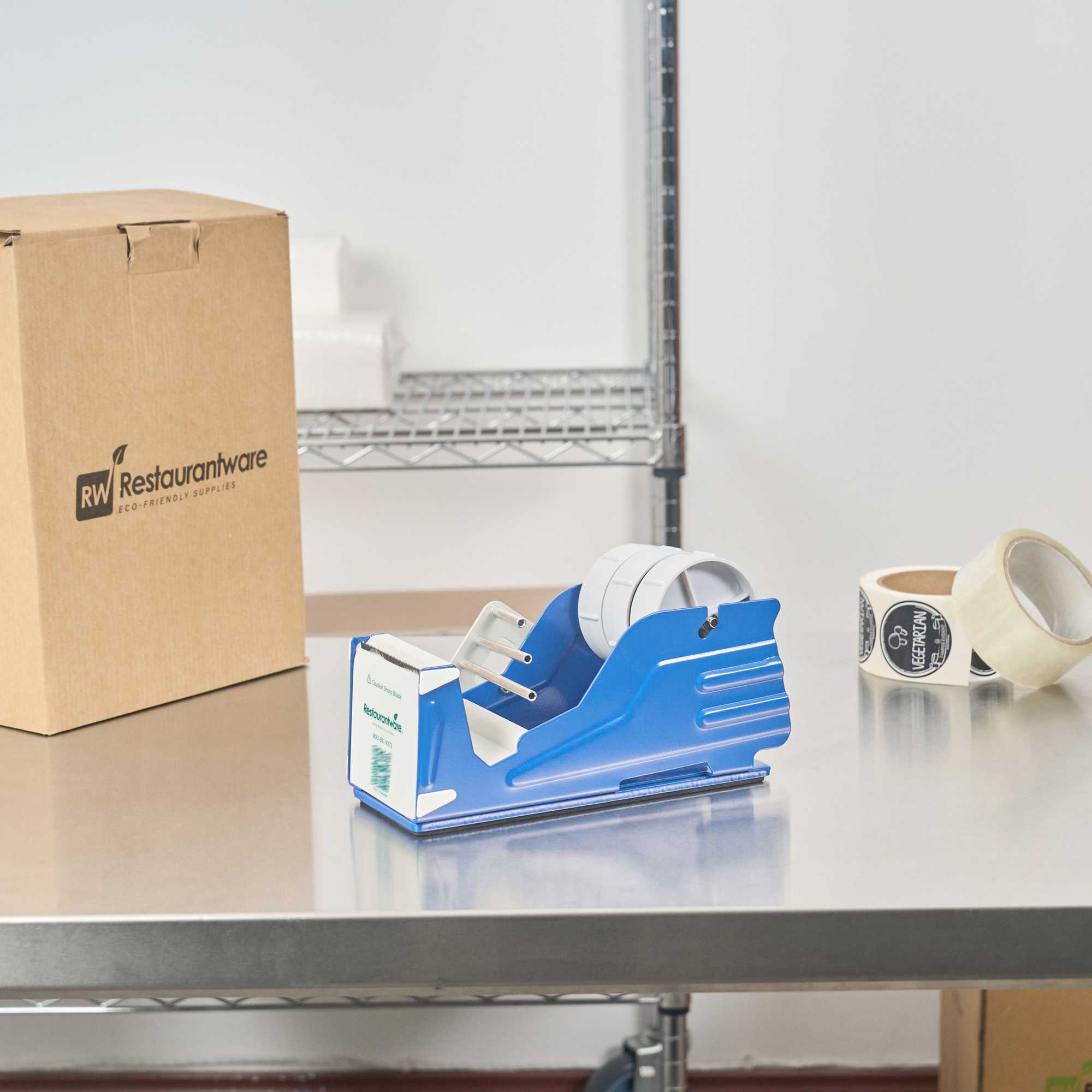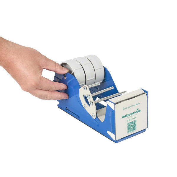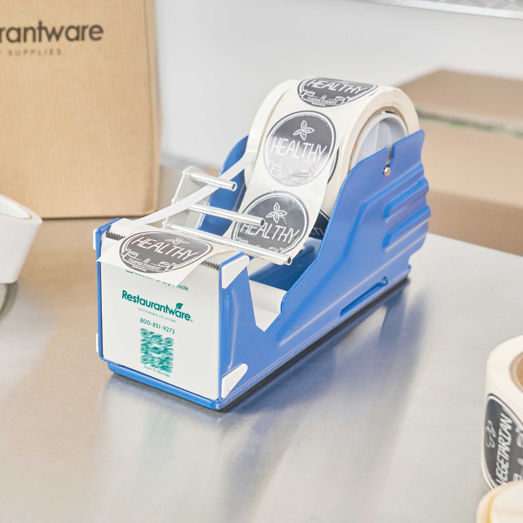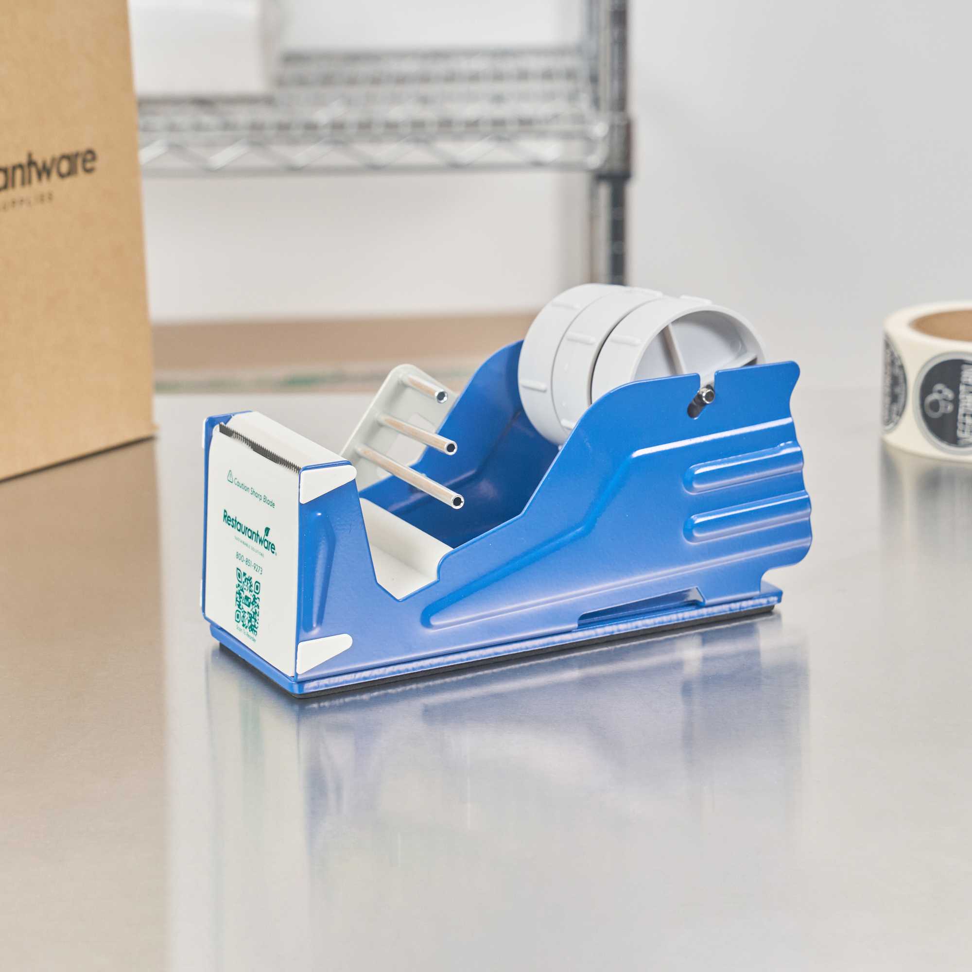 Boost your packaging efficiency with the Handy Tek Manual Multi-Roll Tape and Label Dispenser. This multi-roll tape dispenser accommodates three 1-inch rolls, reducing the need for frequent refills and streamlining your workflow. Designed for stability, its non-skid base ensures that the dispenser remains secure on any desktop, making it ideal for high-volume use. The dispenser's ability to fit 3-inch wide rolls is perfect for labeling products, providing a versatile solution for organizing your inventory. Constructed from durable steel, this packaging tape dispenser stands up to the demands of a fast-paced foodservice environment. At 9.37 inches in length, 3.94 inches in width, and 5.24 inches in height, it fits comfortably on any workstation, offering both functionality and convenience. The blue finish adds a professional touch, while the tiered metal bars efficiently guide and separate rolls for effortless dispensing. Sold in a 6 count box.