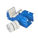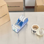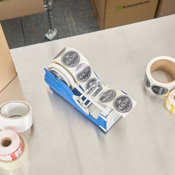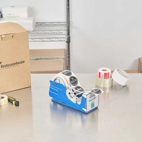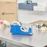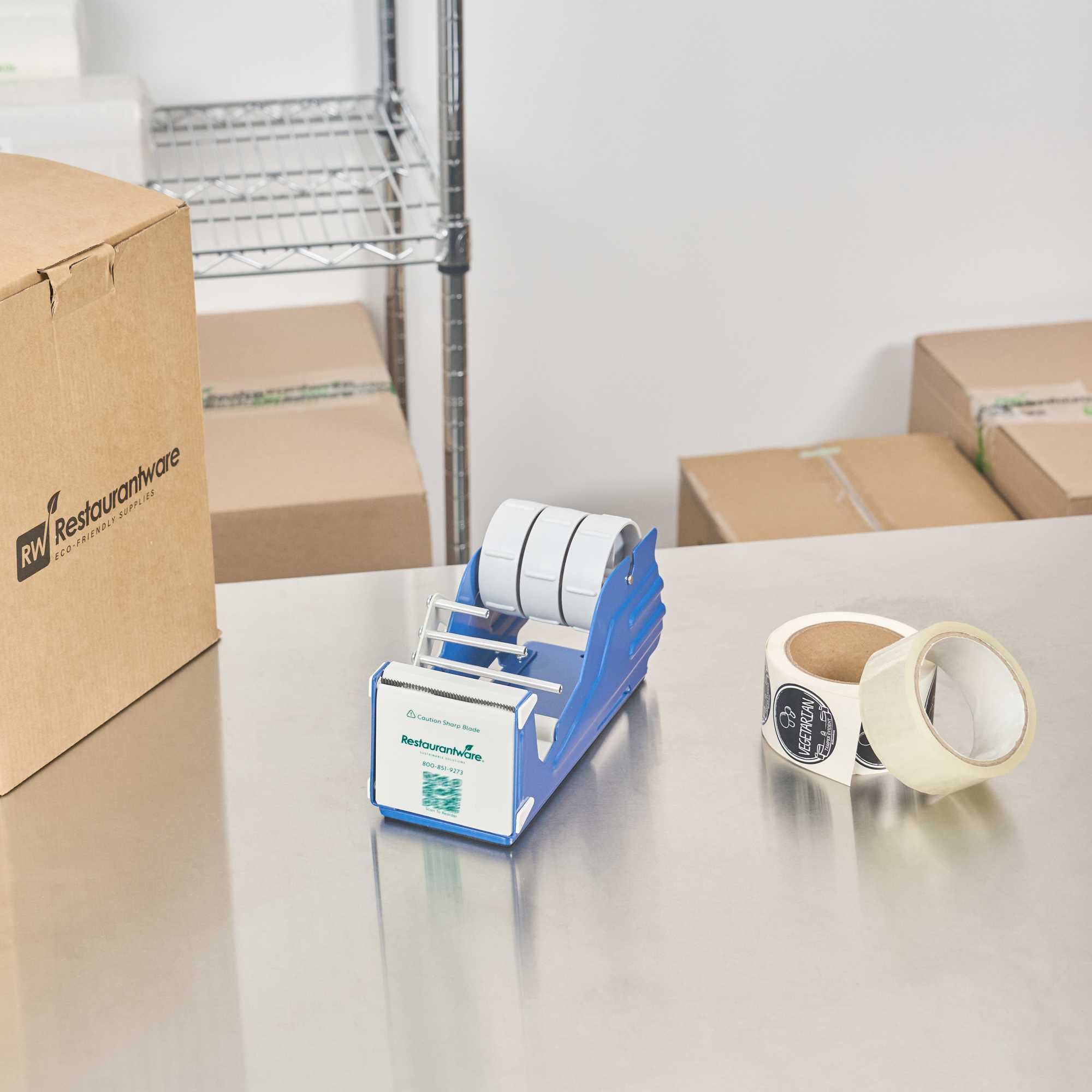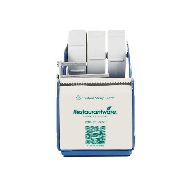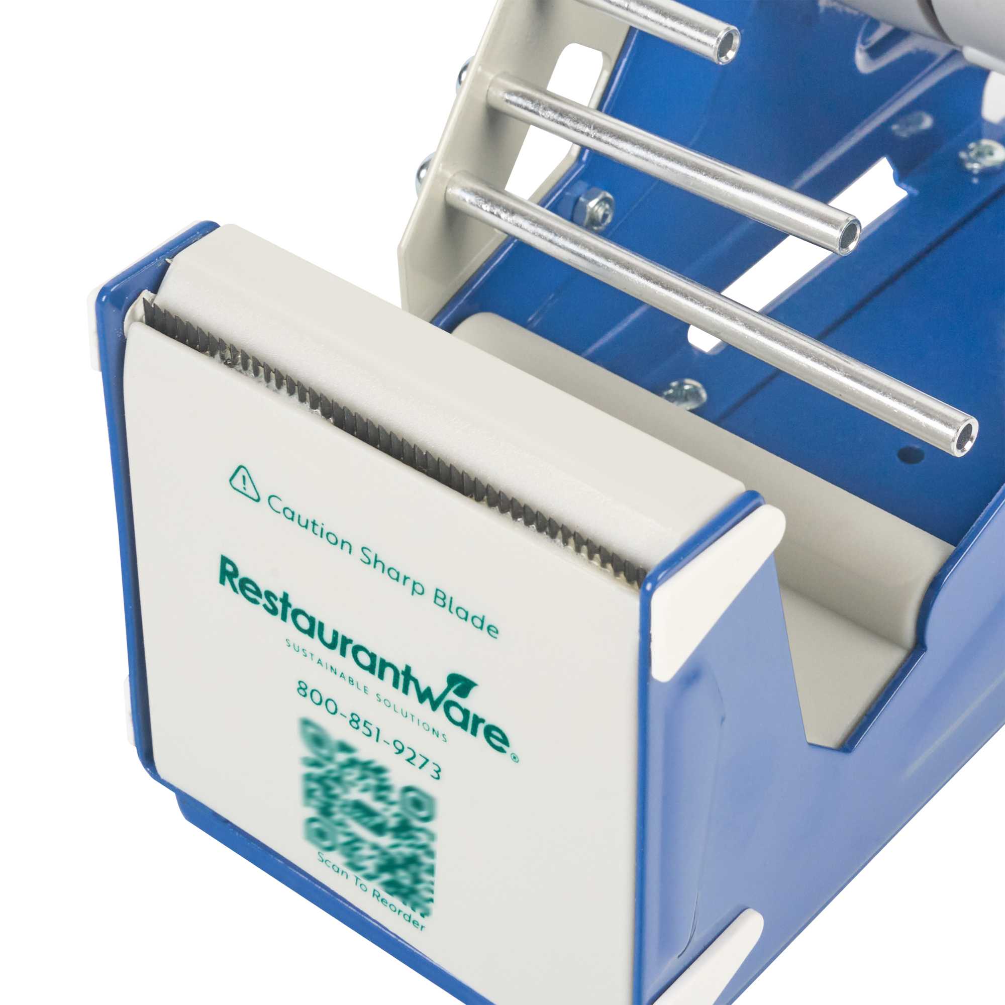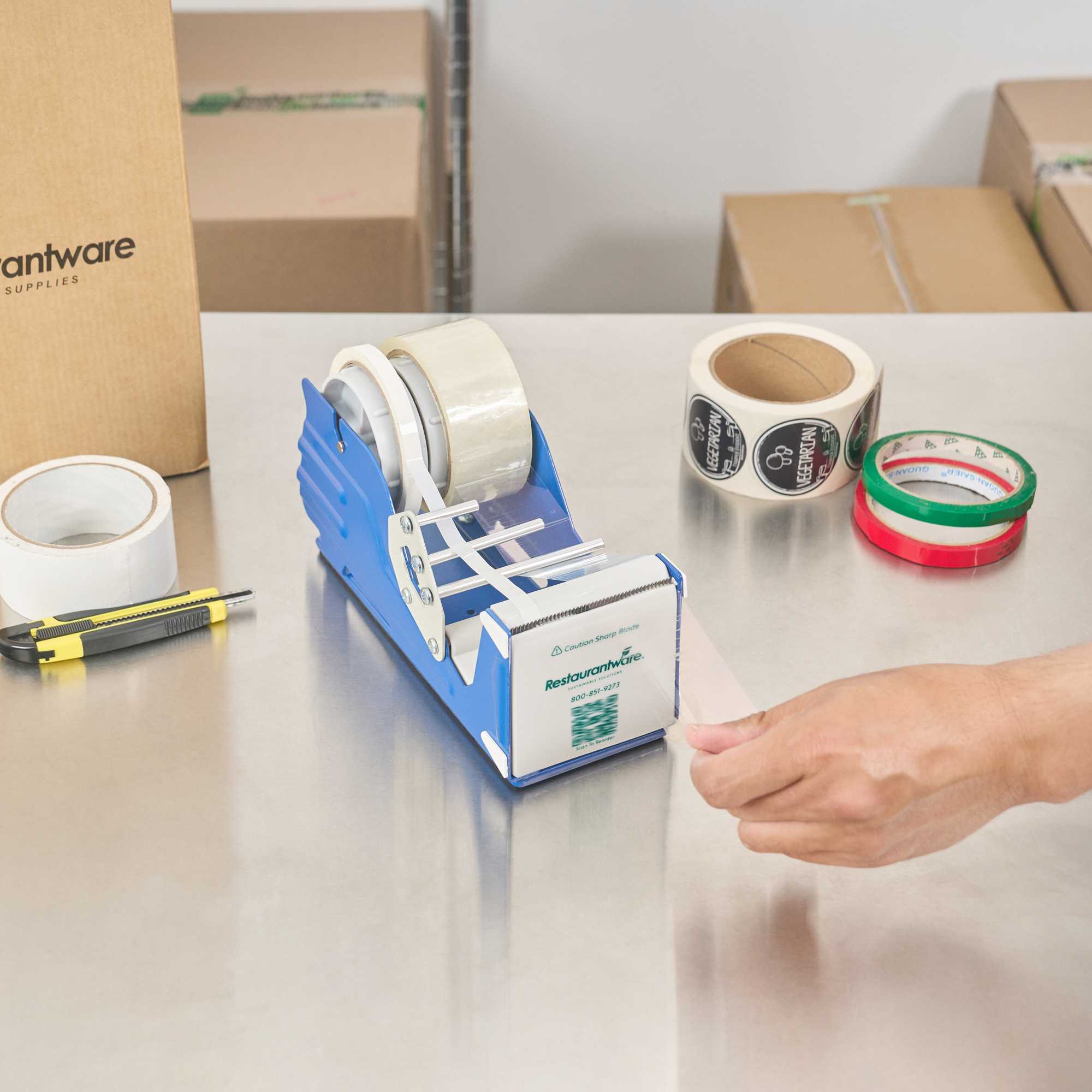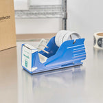 Boost your packaging efficiency with the Handy Tek Manual Multi-Roll Tape and Label Dispenser. This multi-roll tape dispenser accommodates three 1-inch rolls, reducing the need for frequent refills and streamlining your workflow. Designed for stability, its non-skid base ensures that the dispenser remains secure on any desktop, making it ideal for high-volume use. The dispenser's ability to fit 3-inch wide rolls is perfect for labeling products, providing a versatile solution for organizing your inventory. Constructed from durable steel, this packaging tape dispenser stands up to the demands of a fast-paced foodservice environment. At 9.37 inches in length, 3.94 inches in width, and 5.24 inches in height, it fits comfortably on any workstation, offering both functionality and convenience. The blue finish adds a professional touch, while the tiered metal bars efficiently guide and separate rolls for effortless dispensing. Sold in a 6 count box.