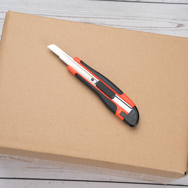 Allow your warehouse workers or maintenance staff to easily cut cardboard or paper using our Handy Tek Orange Snap Off Blade Knives. With a 9 millimeter blade, these retractable utility knives can be extended to the length you need to cut or trim thick materials. These orange box knives have a locking mechanism that secures the blade stays in place for optimal safety. Featuring a razor-sharp blade, these snap off knives are perfect for cleanly cutting materials without having to use unnecessary force. The blade of these maintenance knives can be snapped off, allowing you to conveniently replace the cutting edge at any time. Measuring 5.25 inches long by 1.2 inches wide, these warehouse knives can be stored in your tool belt or pocket for easy access. Shipped in a 4 count box.