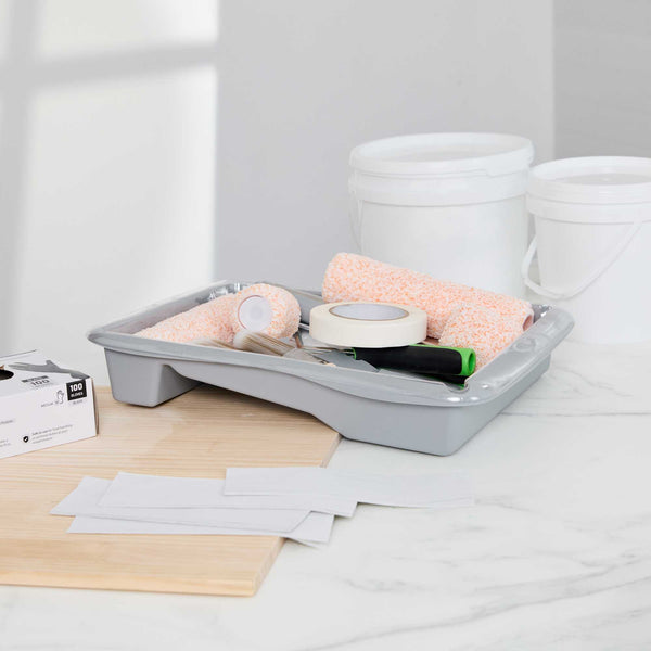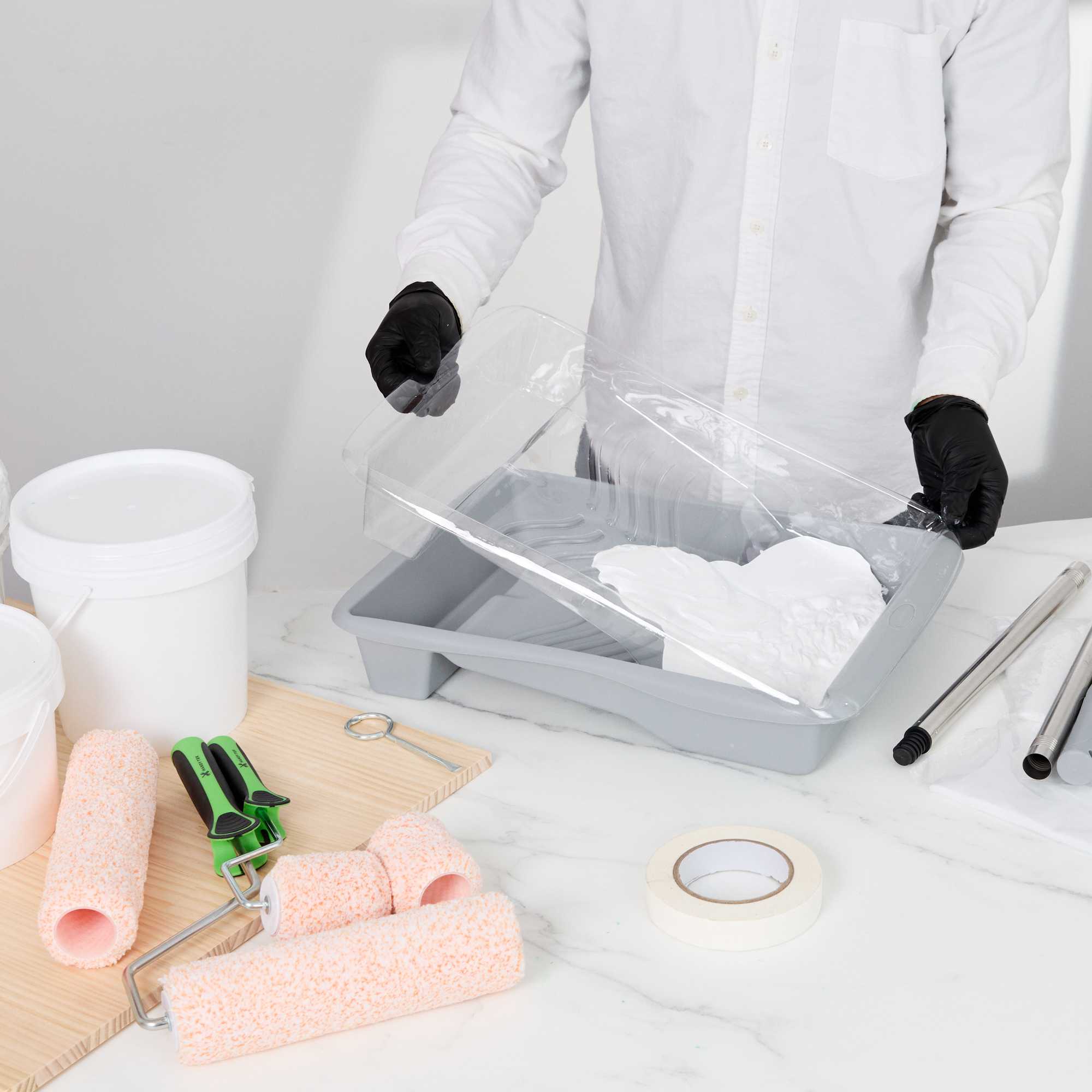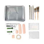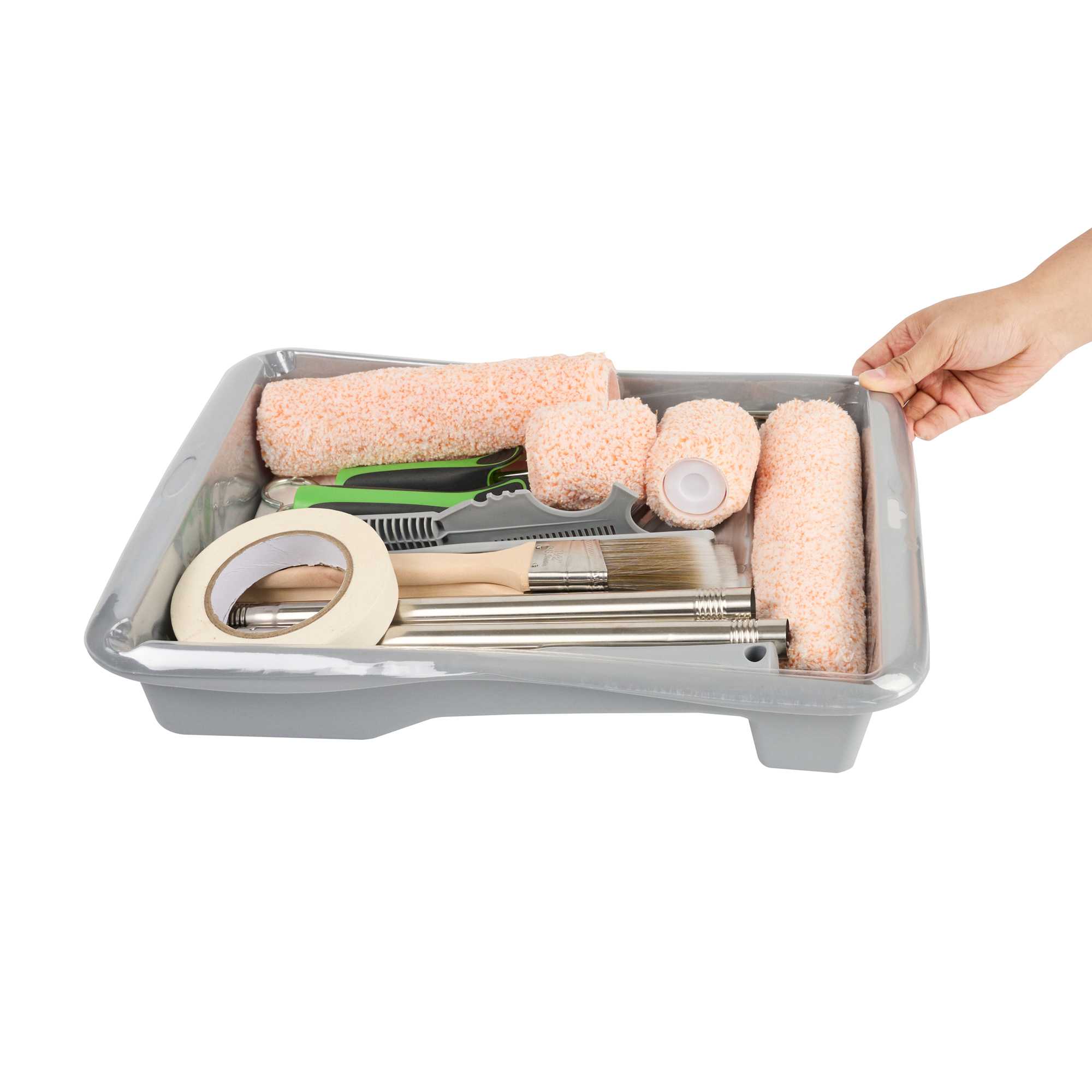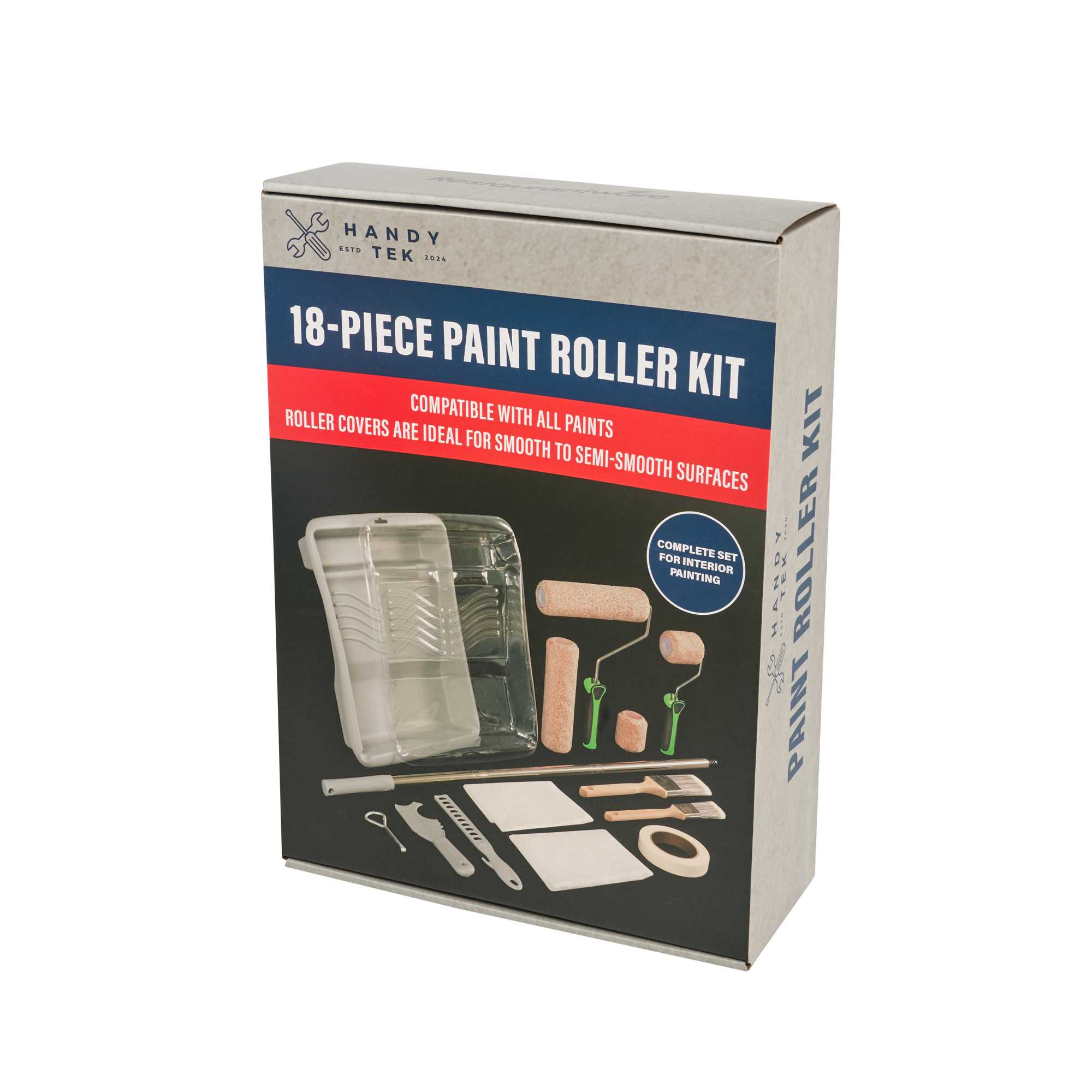 Tackle painting projects with ease using our Handy Tek Paint Roller Kit. Designed to handle large surfaces, the kit includes two 9-inch microfiber roller covers for smooth, even application, along with two 3-inch covers for corners and trim. For steady coverage and detailed work, it features a 9-inch roller frame and a 3-inch mini frame. Create sharp lines and precise edges using the 1.5-inch angled brush, while the 2.5-inch brush works well for wider strokes and baseboards. Reach tall walls without a ladder using the included 3-foot extension pole. Keep painting sessions efficient with a 9-inch heavy-duty tray and two disposable liners for quick cleanup. Protect floors and furniture using two plastic drop cloths, each measuring 9 feet by 12 feet. Ensure clean edges with a 1-inch masking tape roll, mix paint thoroughly with a stir bar, and maintain tools with the brush and roller cleaner. A paint can opener is also included for quick, no-mess access.