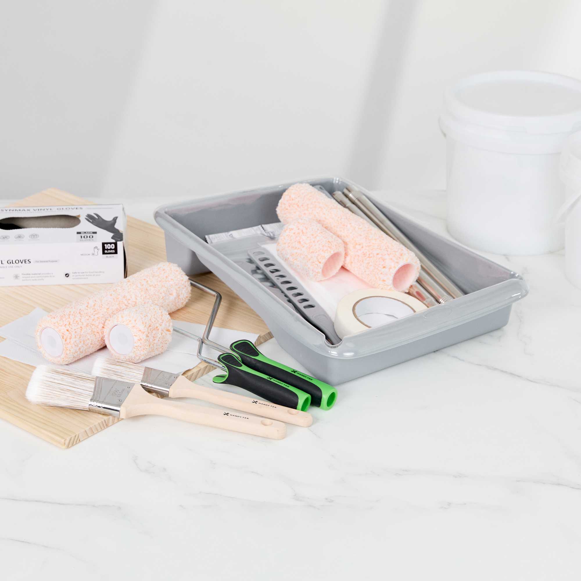 Tackle painting projects with ease using our Handy Tek Paint Roller Kit. Designed to handle large surfaces, the kit includes two 9-inch microfiber roller covers for smooth, even application, along with two 3-inch covers for corners and trim. For steady coverage and detailed work, it features a 9-inch roller frame and a 3-inch mini frame. Create sharp lines and precise edges using the 1.5-inch angled brush, while the 2.5-inch brush works well for wider strokes and baseboards. Reach tall walls without a ladder using the included 3-foot extension pole. Keep painting sessions efficient with a 9-inch heavy-duty tray and two disposable liners for quick cleanup. Protect floors and furniture using two plastic drop cloths, each measuring 9 feet by 12 feet. Ensure clean edges with a 1-inch masking tape roll, mix paint thoroughly with a stir bar, and maintain tools with the brush and roller cleaner. A paint can opener is also included for quick, no-mess access. Sold in a 6 count box.