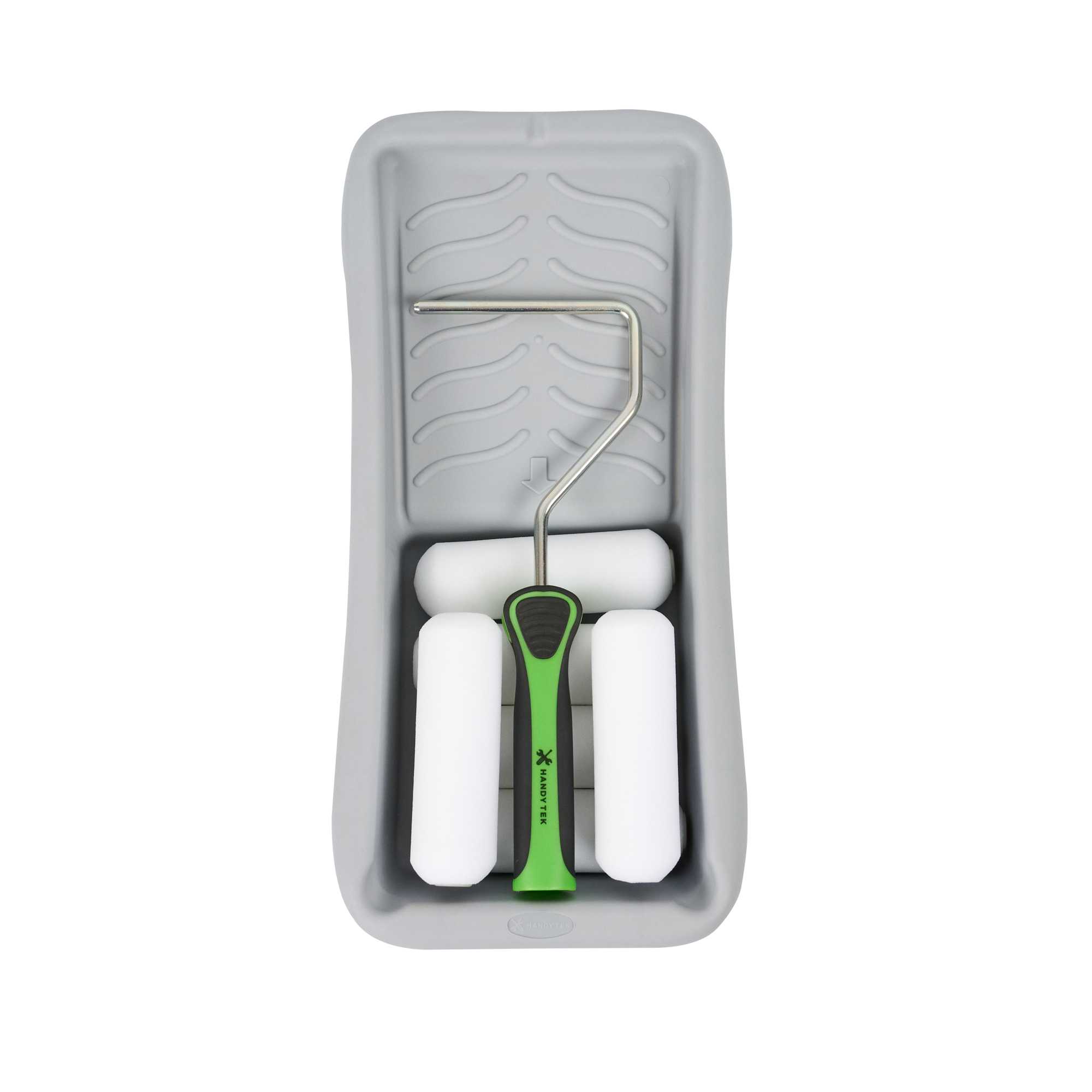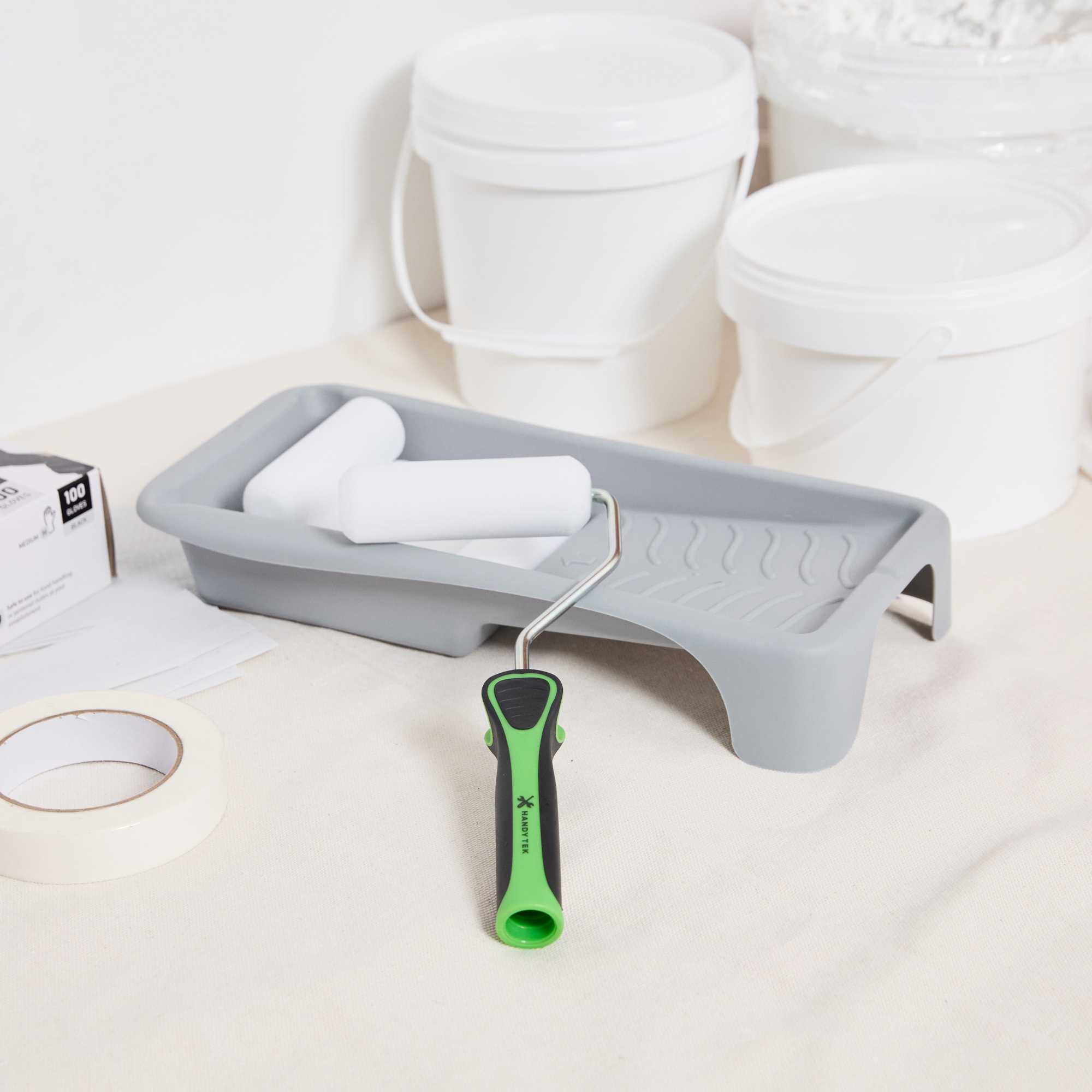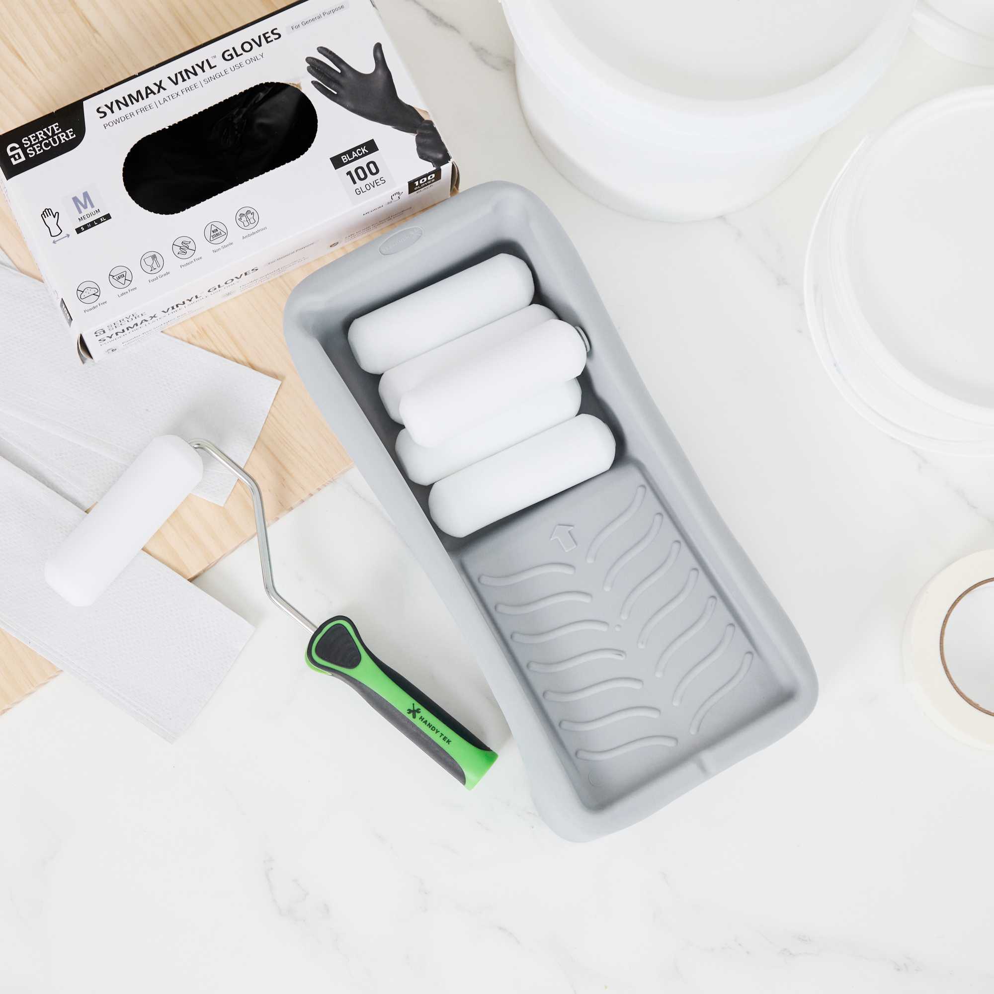 Transform your painting projects into a seamless experience with our Handy Tek Paint Roller Kit. This all-in-one painting kit includes 6 high-density foam roller covers, 1 durable roller frame, and 1 compact paint tray, everything you need for smooth, and precise application. The high-density foam roller covers ensure even paint distribution with minimal lint, making them ideal for cabinets, trim, and furniture in foodservice spaces. The included roller frame offers excellent stability and control, helping you achieve cleaner edges and better coverage. To reduce waste and maintain a clean work area, the ribbed surface of the paint tray helps evenly load paint and minimize drips. Apt for commercial kitchens, cafés, or any professional setting, this painting accessory keeps your space looking polished and professional. This kit includes six 3.94-inch foam roller covers, one 3.94-inch paint roller frame, and one 3.94-inch paint tray. Sold in a 12 count box.