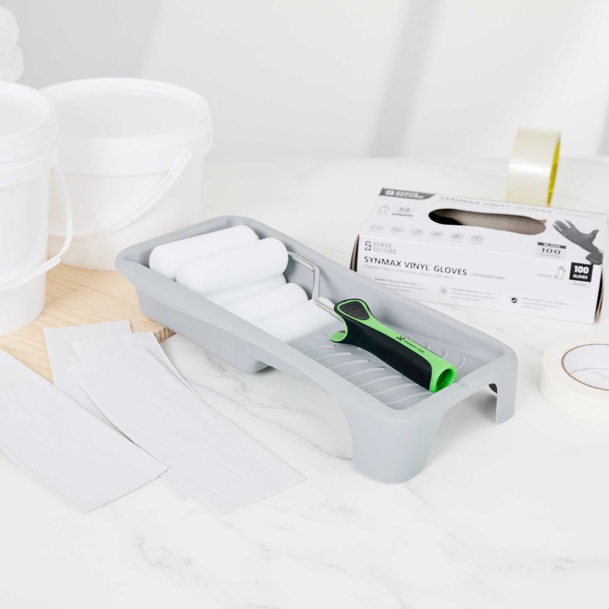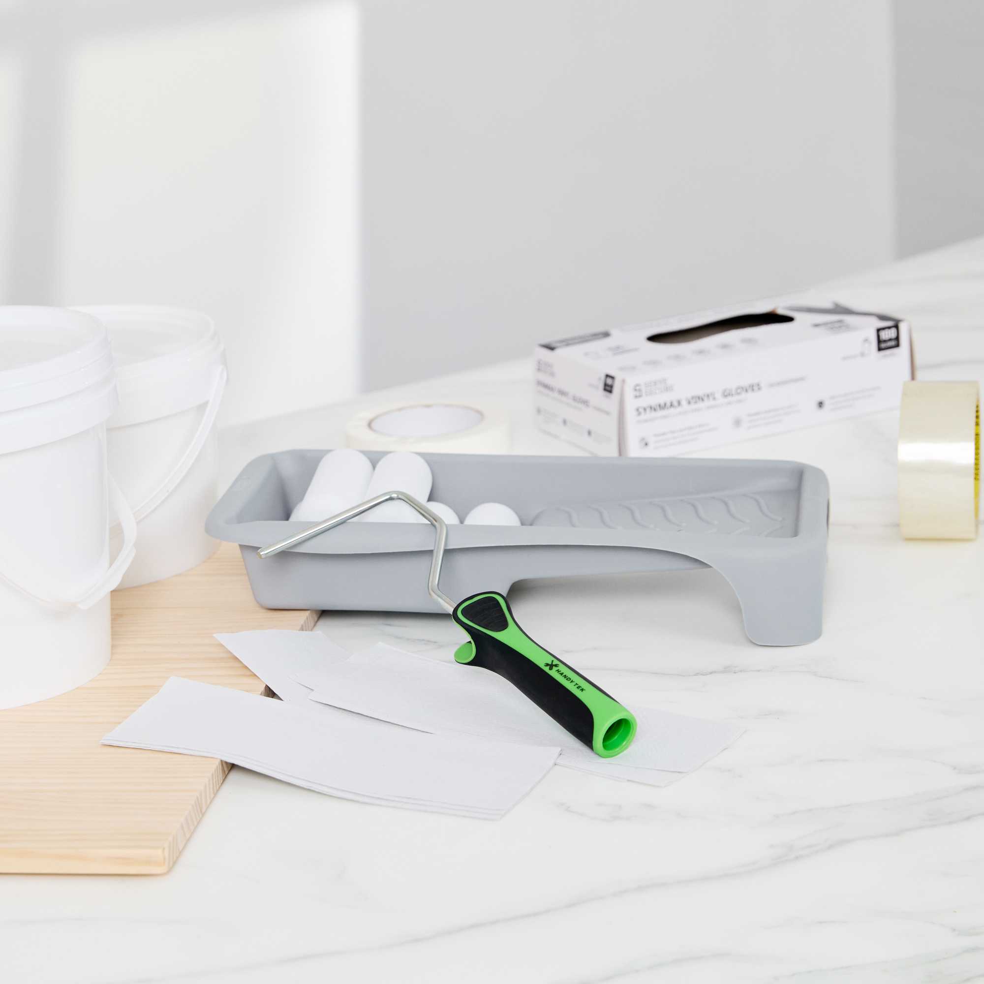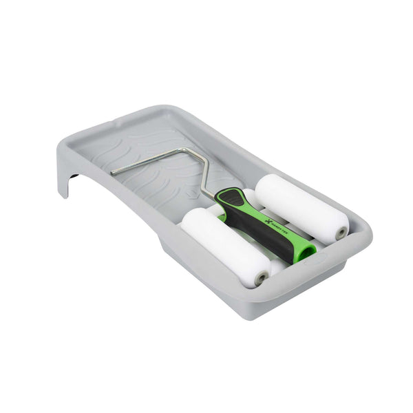 Transform your painting projects into a seamless experience with our Handy Tek Paint Roller Kit. This all-in-one painting kit includes 6 high-density foam roller covers, 1 durable roller frame, and 1 compact paint tray, everything you need for smooth, and precise application. The high-density foam roller covers ensure even paint distribution with minimal lint, making them ideal for cabinets, trim, and furniture in foodservice spaces. The included roller frame offers excellent stability and control, helping you achieve cleaner edges and better coverage. To reduce waste and maintain a clean work area, the ribbed surface of the paint tray helps evenly load paint and minimize drips. Apt for commercial kitchens, cafés, or any professional setting, this painting accessory keeps your space looking polished and professional. This kit includes six 3.94-inch foam roller covers, one 3.94-inch paint roller frame, and one 3.94-inch paint tray. Sold in a 12 count box.