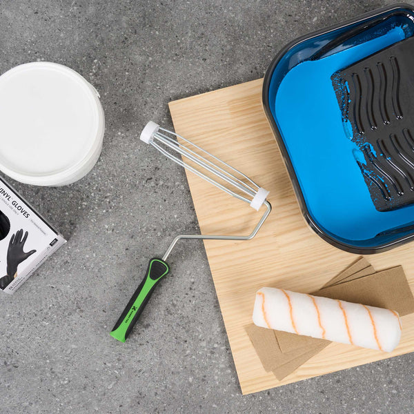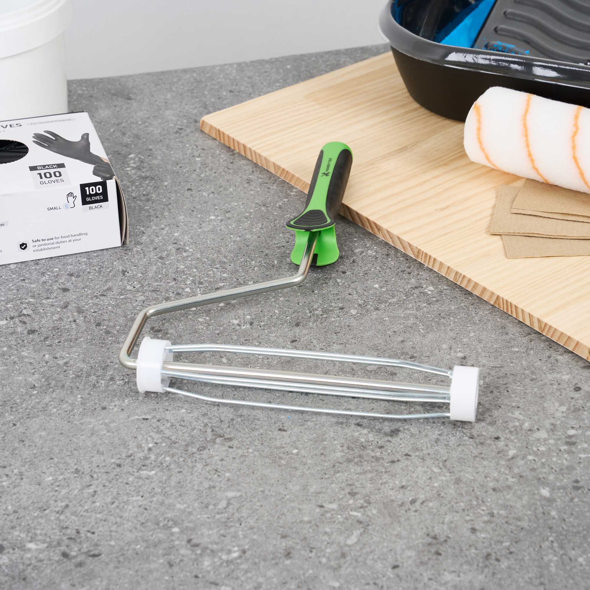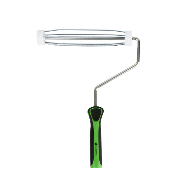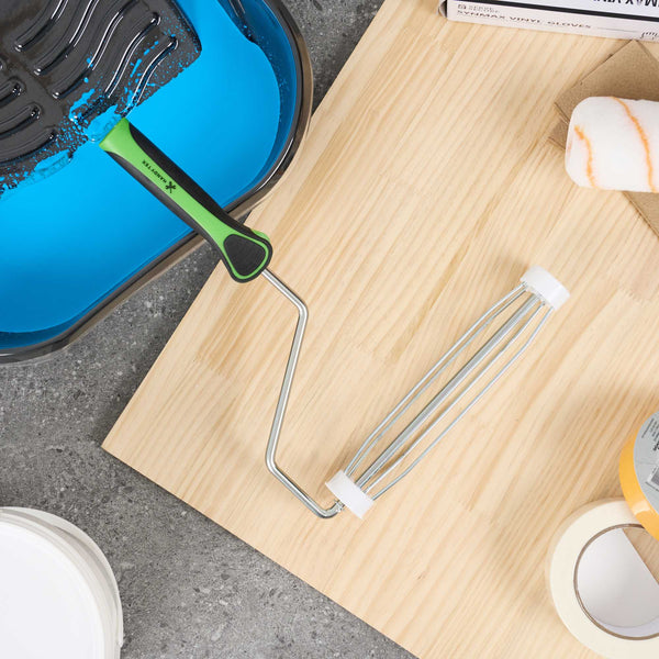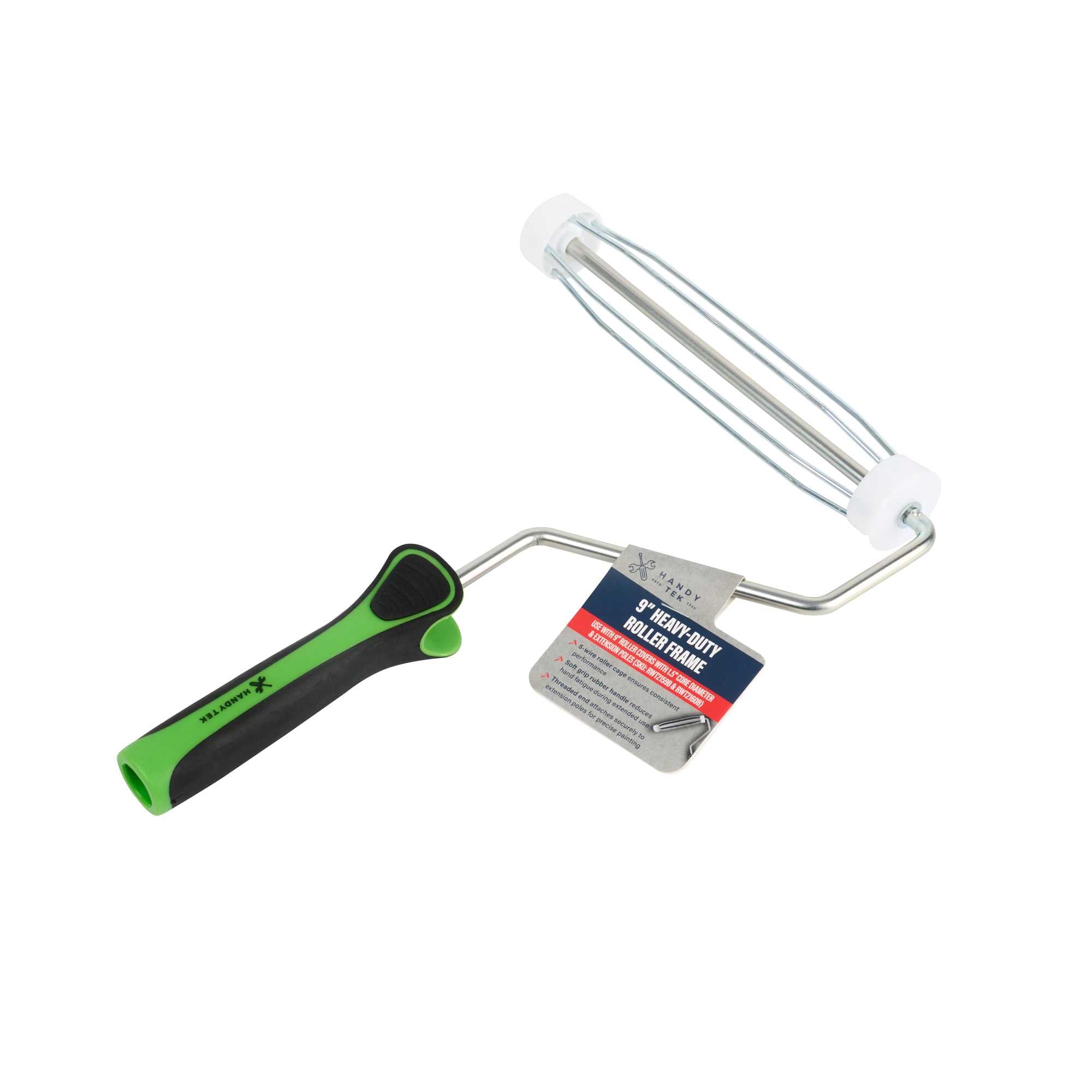 Upgrade your painting with our Handy Tek Roller Frame, designed for both expert and DIY projects. Built for durability, this heavy-duty paint handle frame ensures long-lasting performance. The 5-wire roller cage of this roller holder securely holds roller covers in place, preventing slipping and ensuring a smooth, even application. For effortless painting across walls, ceilings, and hard-to-reach areas, this frame is compatible with 9-inch roller covers featuring a 1.5-inch core diameter for smooth paint application. The roller frame includes a threaded end to securely attach to our compatible extension poles for extended reach. Featuring a soft grip handle, this painting roller frame provides a comfortable, secure grip, reducing hand fatigue during extended use. Measuring 12.99 inches in length by 9.84 inches in width by 1.38 inches in height, this roller frame is ideal for a variety of painting tasks. Sold in a 1 count box. Roller covers and extension poles are sold seperately.