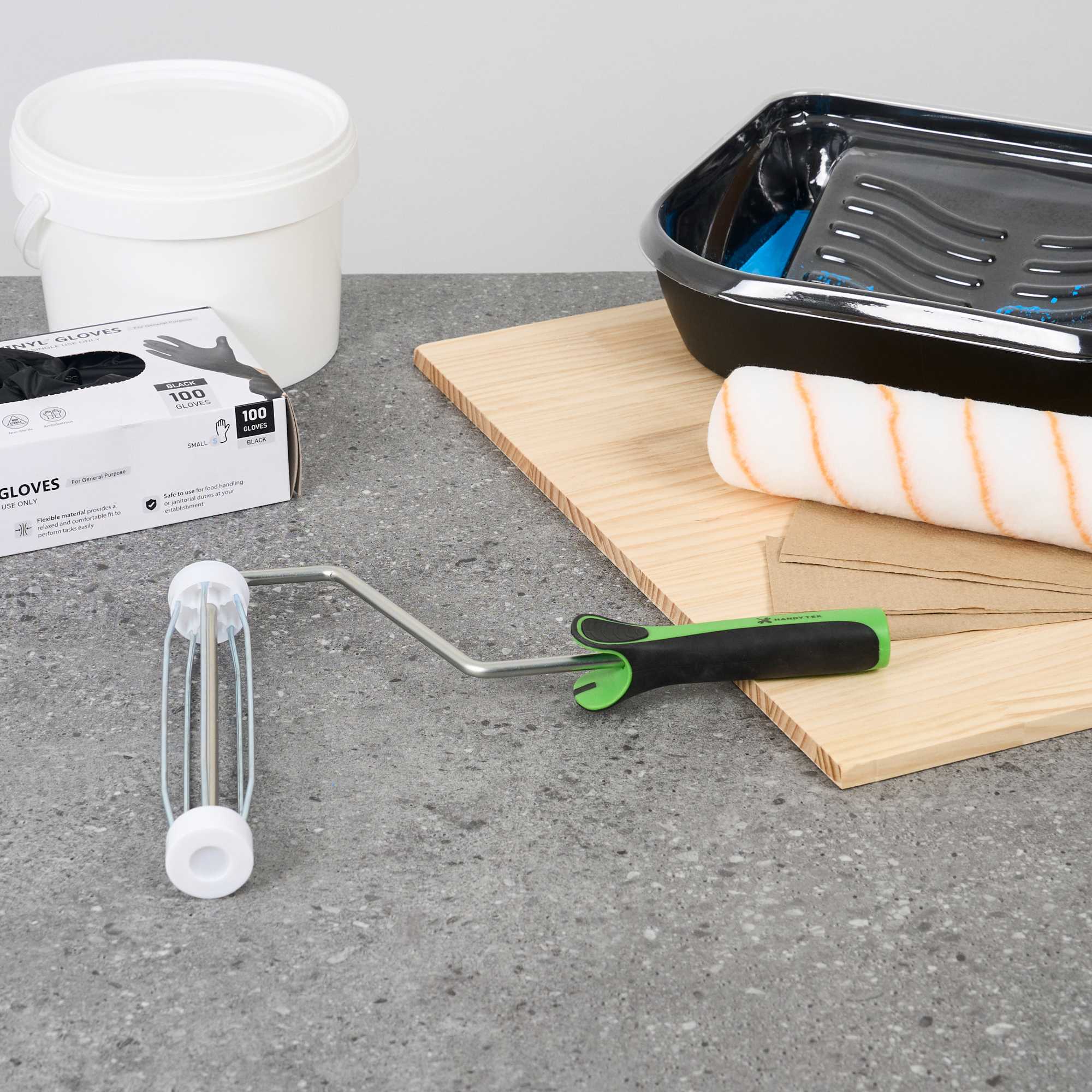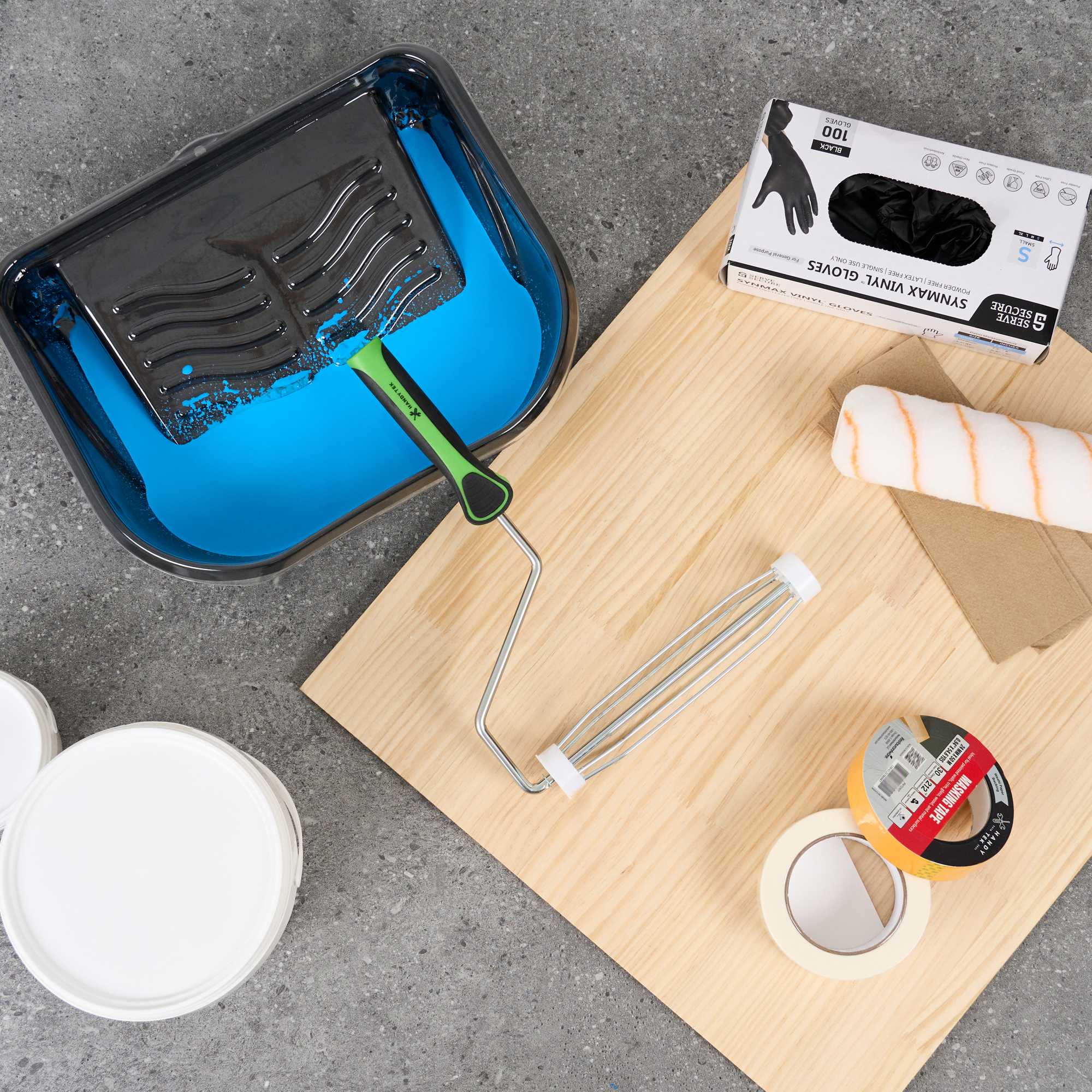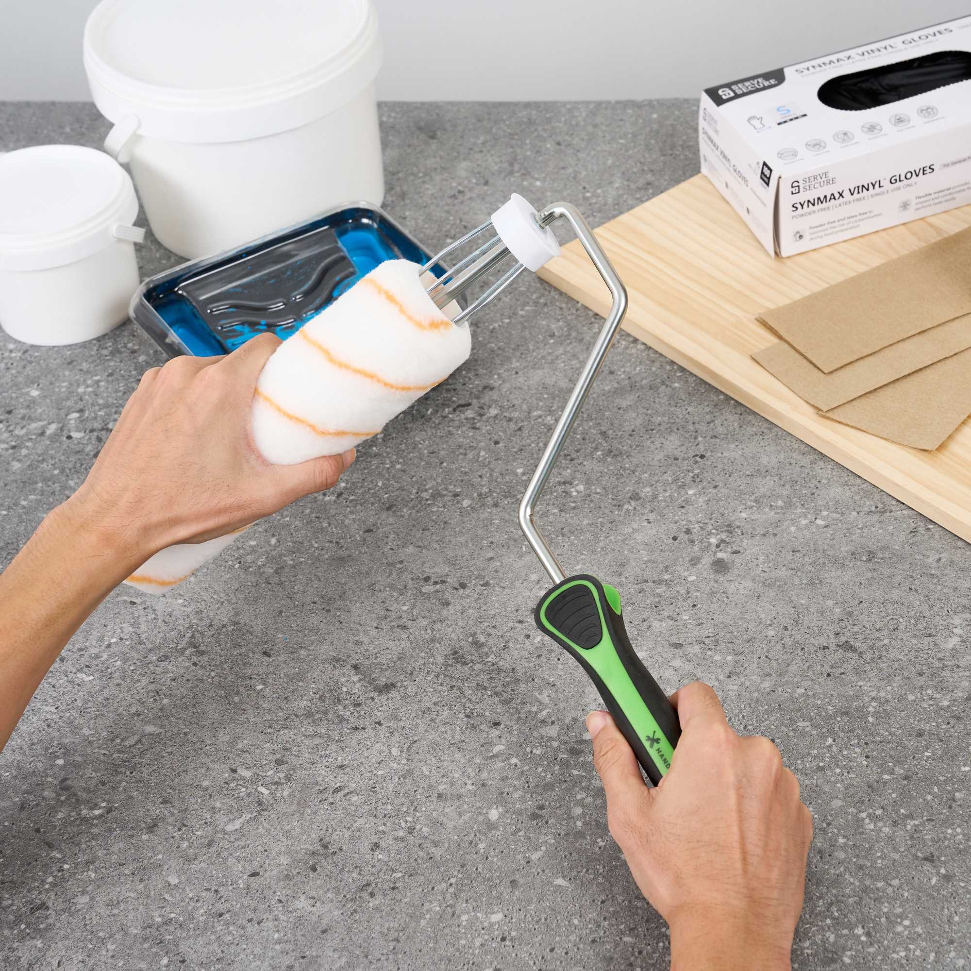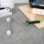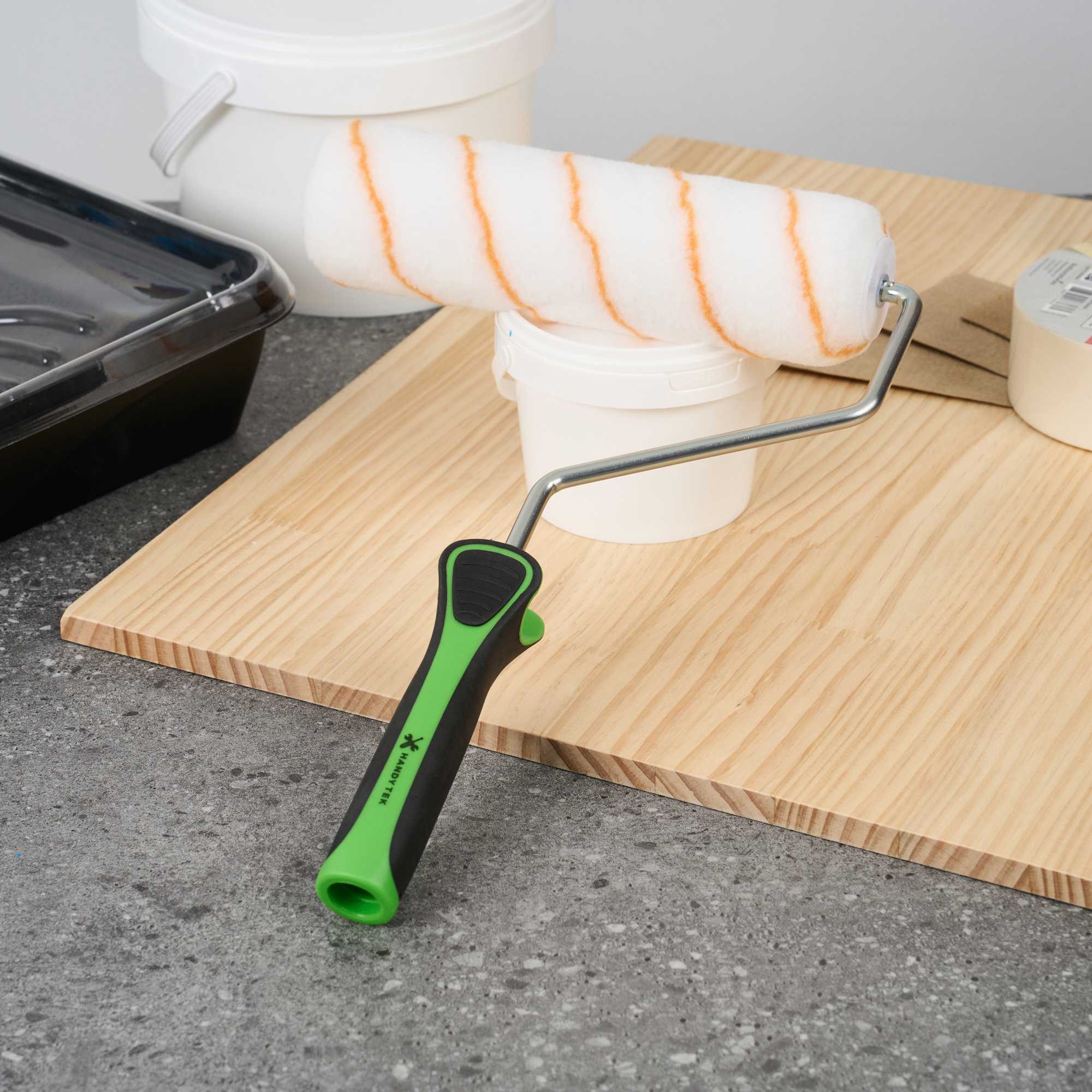 Upgrade your painting with our Handy Tek Roller Frame, designed for both expert and DIY projects. Built for durability, this heavy-duty paint handle frame ensures long-lasting performance. The 5-wire roller cage of this roller holder securely holds roller covers in place, preventing slipping and ensuring a smooth, even application. For effortless painting across walls, ceilings, and hard-to-reach areas, this frame is compatible with 9-inch roller covers featuring a 1.5-inch core diameter for smooth paint application. The roller frame includes a threaded end to securely attach to our compatible extension poles for extended reach. Featuring a soft grip handle, this painting roller frame provides a comfortable, secure grip, reducing hand fatigue during extended use. Measuring 12.99 inches in length by 9.84 inches in width by 1.38 inches in height, this roller frame is ideal for a variety of painting tasks. Sold in a 12 count box. Roller covers and extension poles are sold seperately.