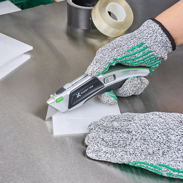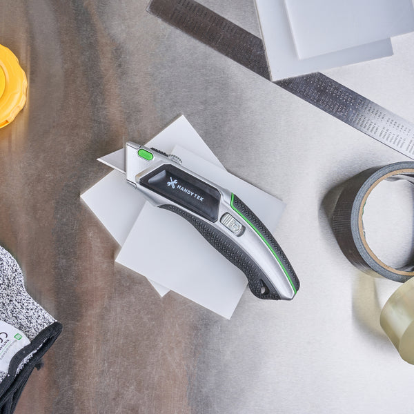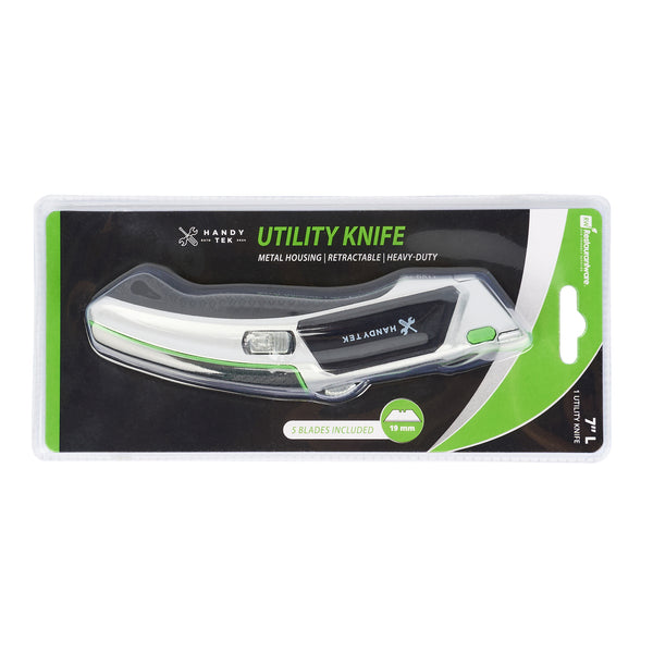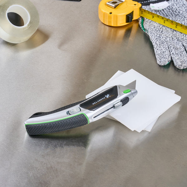 Upgrade your toolbox with our Handy Tek Silver Auto-Loading Utility Knives. These utility knives feature a quick change mechanism, allowing for easy and rapid blade replacement, making them perfect for demanding tasks. Equipped with an innovative auto-loading mechanism, these sharp knives automatically load a new blade when the existing one becomes dull. The blade compartment of these retractable knives offers a convenient and secure solution for storing extra blades, ensuring you’re always prepared. Boasting a heavy-duty design, these cutting knives ensure durability and reliability, making them ideal for demanding tasks. These heavy-duty knives provide a firm, secure grip while cutting, enhancing user comfort and control. Made from high-carbon steel, these box cutters offer superior sharpness and edge retention, ideal for various cutting tasks. These auto-loading utility knives feature a 4-position locking system, allowing for adjustable blade extension and improved control during use. For enhanced safety, the slider of these sharp utility knives enables the blade to be safely stored within the handle when not in use, reducing the risk of accidental cuts and injuries. With zinc housing, these silver utility knives are built to last and resist breakage, ensuring optimal performance. Featuring an ABS and TPR over-molding grip, these sharp cutting knives provide a non-slip hold when in use, enhancing safety and comfort during extended cutting tasks. Measuring 6.96 inches in length, these retractable utility knives are equipped with a 19-millimeter wide blade. Sold in 6 boxes with 6 knives and 30 blades.