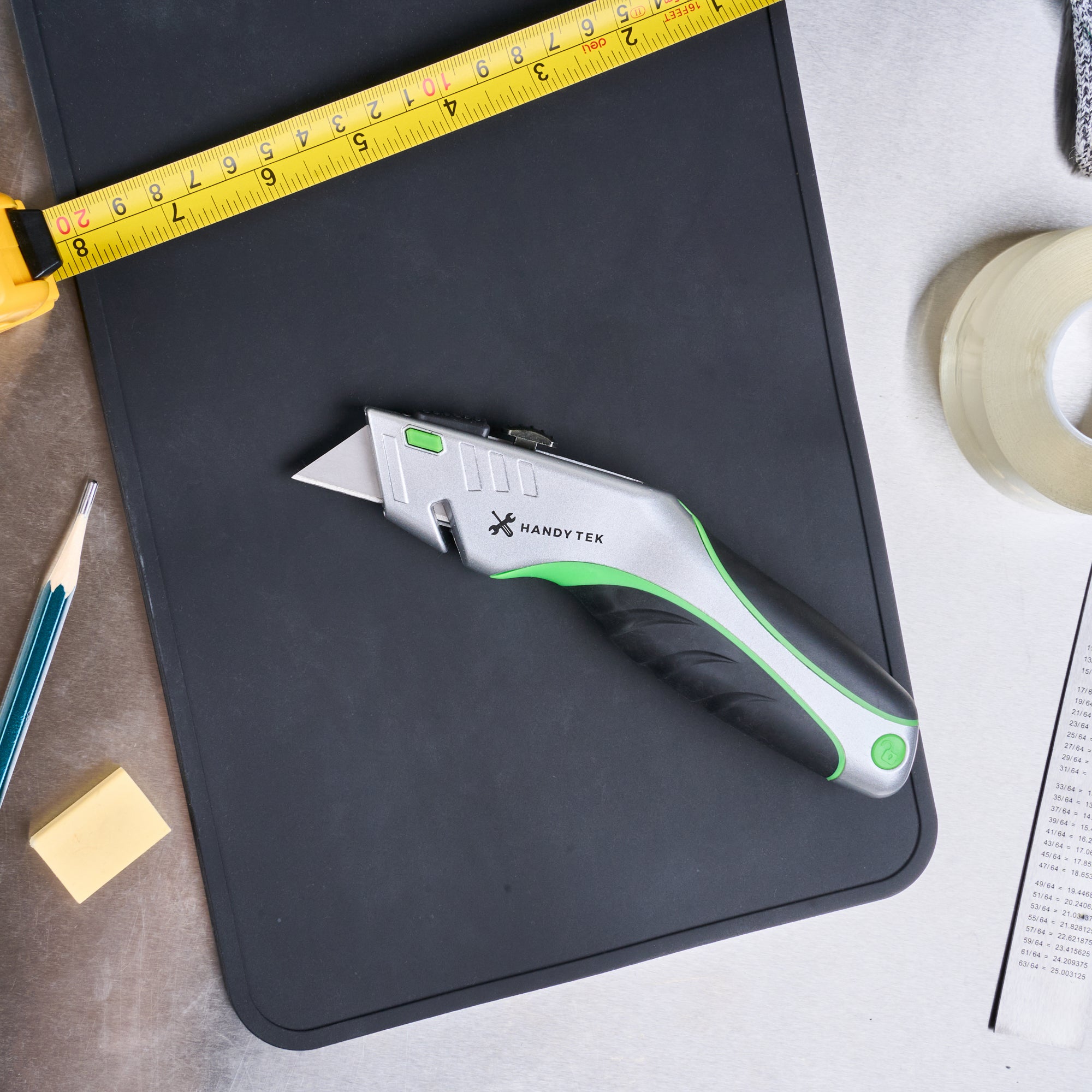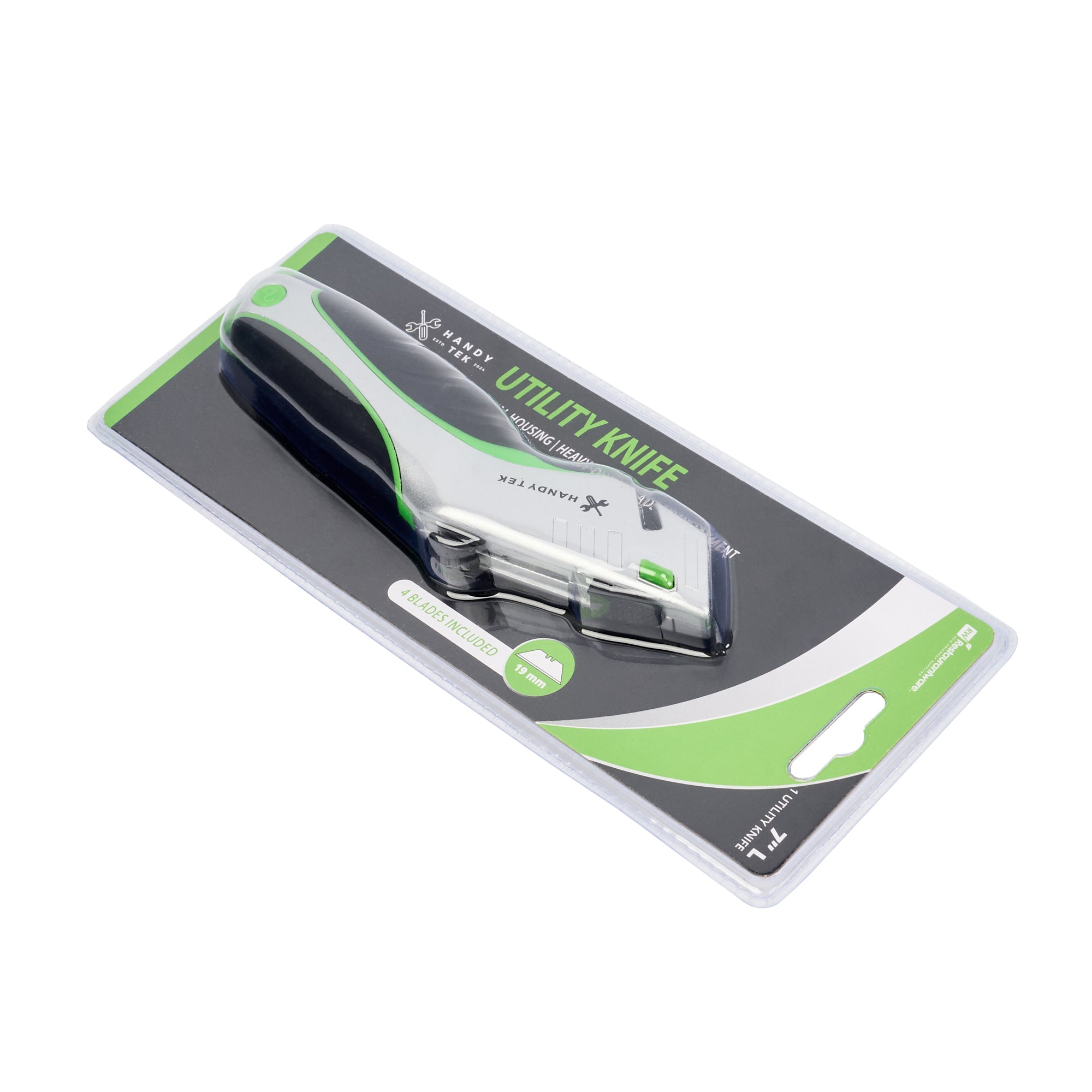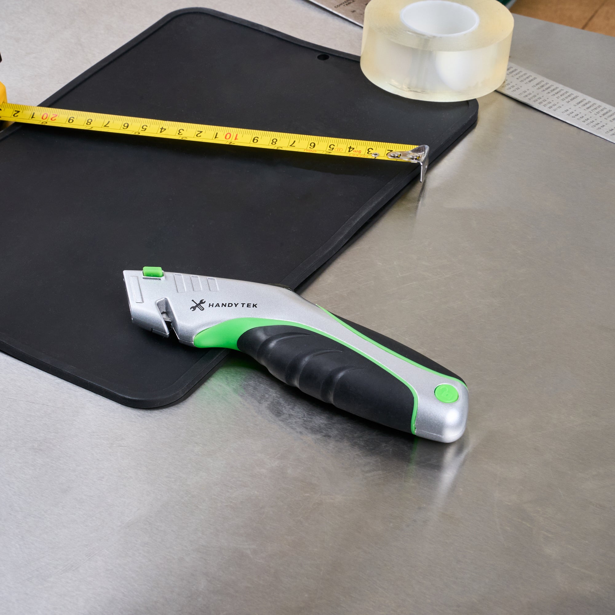 Enhance your cutting tasks with our Handy Tek Silver Utility Knife. Featuring a quick change mechanism, this heavy-duty knife allows for easy and rapid removal of blades, ensuring uninterrupted workflow. The blade compartment of this utility knife provides a secure solution for accommodating the included extra blades. This retractable utility knife features four adjustable blade positions for versatile cutting needs. The retractable design of this sharp utility knife allows the blade to be tucked away inside the handle when not in use. Crafted with an ergonomic handle, this sharp knife provides a comfortable grip while cutting. For added comfort and control, this razor-sharp knife features an over-molding grip crafted from a blend of PP and TPR for a non-slip experience during precise cutting tasks. Equipped with a high-carbon steel blade, this box cutter offers superior sharpness and edge retention for prolonged use. The durable aluminum housing ensures this cutting knife stands up to rigorous use without breaking. Measuring 6.93 inches in length, this sharp cutter is equipped with an 19-millimeter blade. Sold in a box with 1 knife and 4 blades.