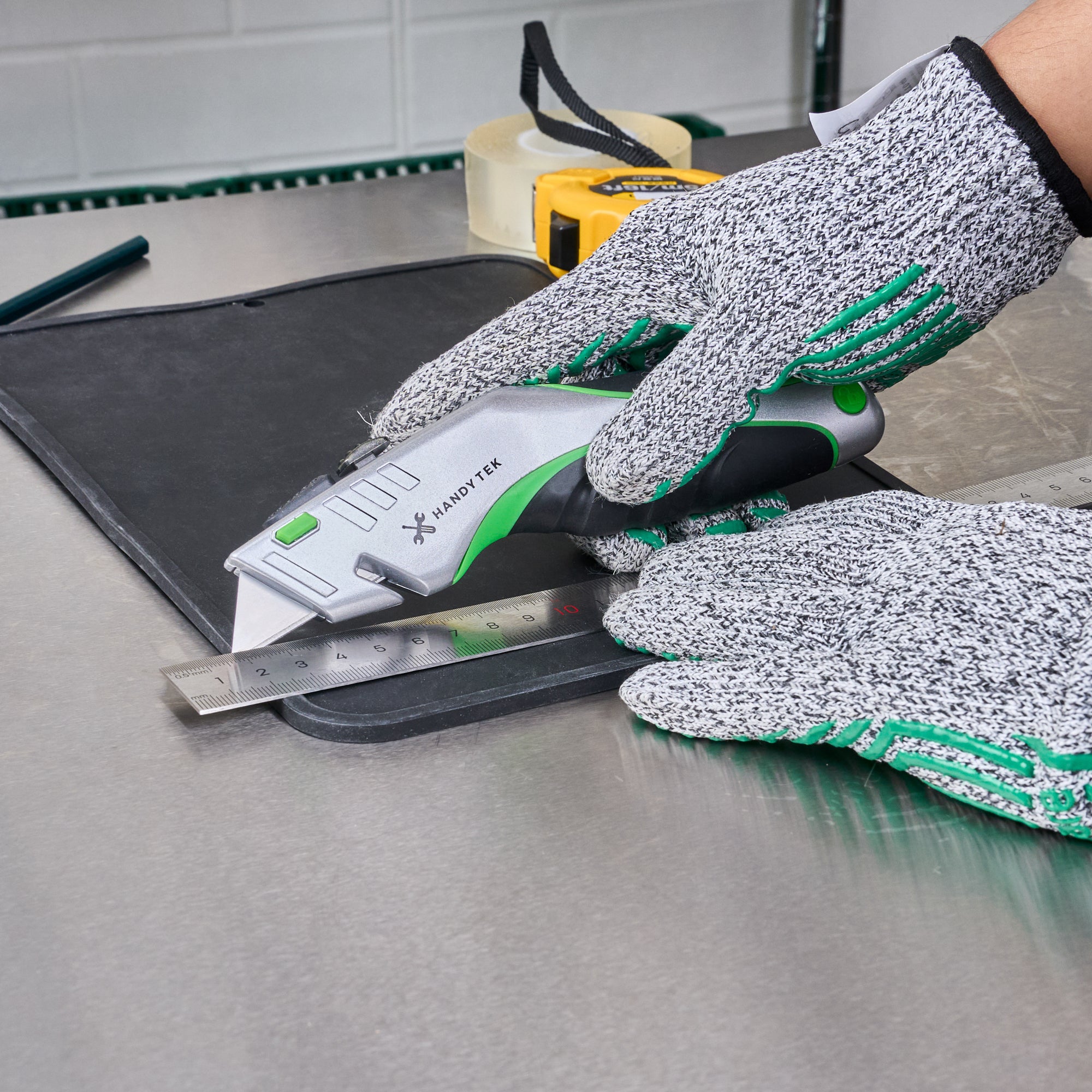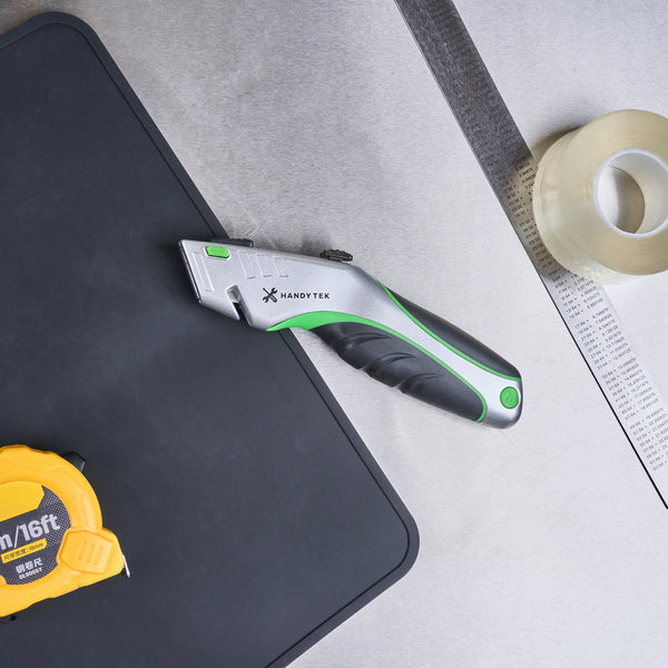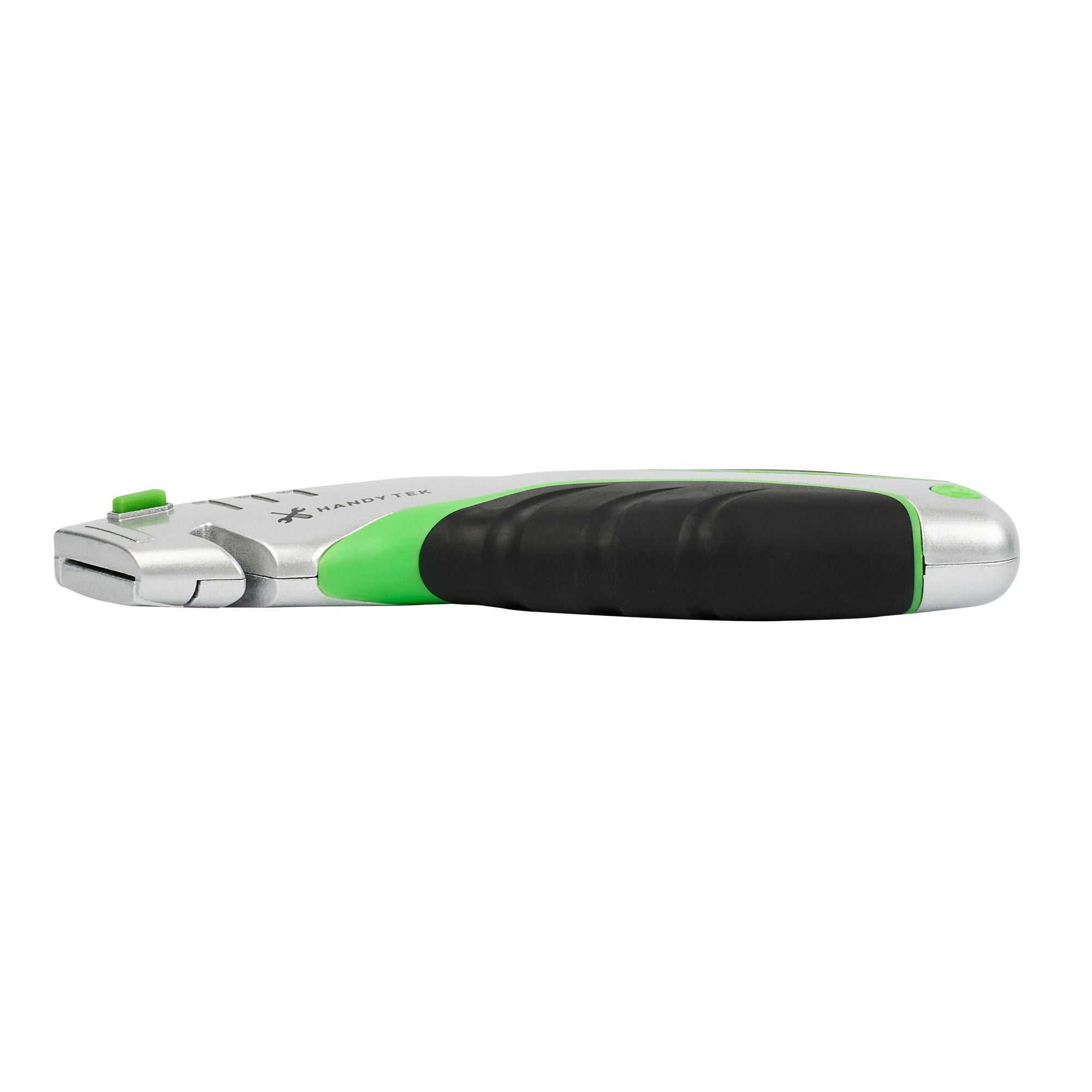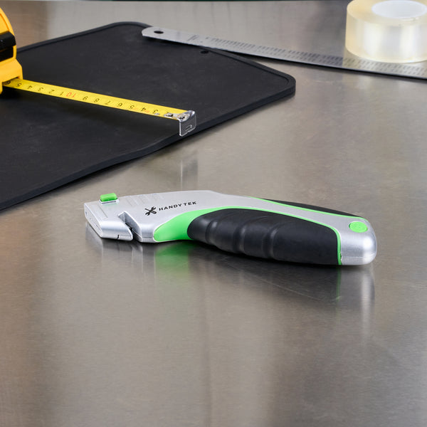 Enhance your cutting tasks with our Handy Tek Silver Utility Knife. Featuring a quick change mechanism, this heavy-duty knife allows for easy and rapid removal of blades, ensuring uninterrupted workflow. The blade compartment of this utility knife provides a secure solution for accommodating the included extra blades. This retractable utility knife features four adjustable blade positions for versatile cutting needs. The retractable design of this sharp utility knife allows the blade to be tucked away inside the handle when not in use. Crafted with an ergonomic handle, this sharp knife provides a comfortable grip while cutting. For added comfort and control, this razor-sharp knife features an over-molding grip crafted from a blend of PP and TPR for a non-slip experience during precise cutting tasks. Equipped with a high-carbon steel blade, this box cutter offers superior sharpness and edge retention for prolonged use. The durable aluminum housing ensures this cutting knife stands up to rigorous use without breaking. Measuring 6.93 inches in length, this sharp cutter is equipped with an 19-millimeter blade. Sold in a box with 1 knife and 4 blades.