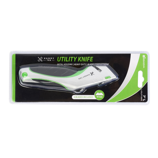 Enhance your cutting tasks with our Handy Tek Silver Utility Knives. Featuring a quick change mechanism, these heavy-duty knives allow for easy and rapid removal of blades, ensuring uninterrupted workflow. The blade compartment of these utility knives provides a secure solution for accommodating the included extra blades. These retractable utility knives feature four adjustable blade positions for versatile cutting needs. The retractable design of these sharp utility knives allows the blade to be tucked away inside the handle when not in use. Crafted with an ergonomic handle, these sharp knives provide a comfortable grip while cutting. For added comfort and control, these razor-sharp knives feature an over-molding grip crafted from a blend of PP and TPR for a non-slip experience during precise cutting tasks. Equipped with a high-carbon steel blade, these box cutters offer superior sharpness and edge retention for prolonged use. The durable aluminum housing ensures these cutting knives stand up to rigorous use without breaking. Measuring 6.93 inches in length, these sharp cutters are equipped with an 19-millimeter blade. Sold in 12 boxes with 12 knives and 48 blades.