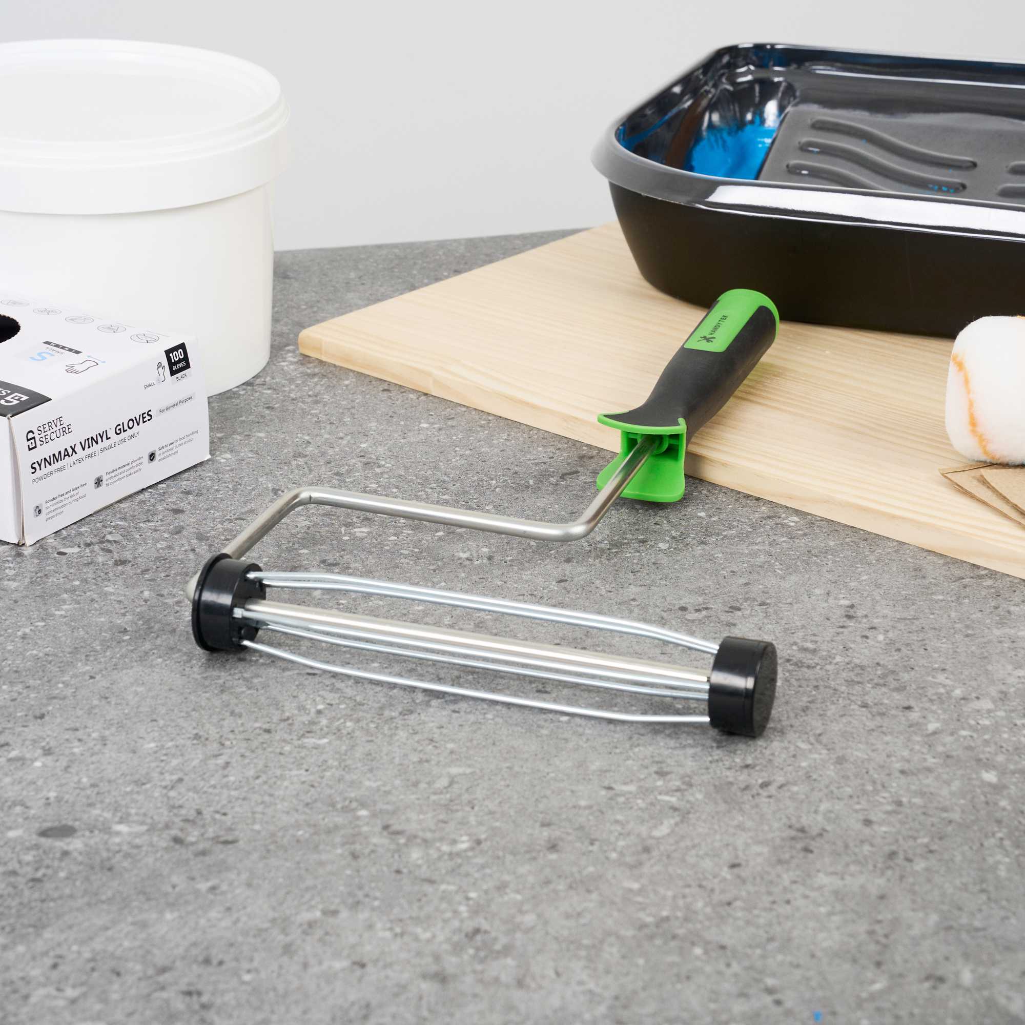 Elevate your painting projects with our Handy Tek Smooth Roller Frame, designed to provide a seamless and efficient painting experience. This roller frame features enclosed bearings, ensuring smooth rolling with minimal friction and noise, making it the ideal paint handle frame for any task. Pair this painting roller frame with Handy Tek roller covers and an extension pole for smooth coverage across walls, ceilings, and hard-to-reach areas in restaurants or cafés. Crafted with a heavy-duty 5-wire chrome-plated cage, this roller holder securely grips roller covers, resisting rust and bending even after multiple uses. The soft rubber grip handle of this coating tool frame offers exceptional comfort, allowing for better control and reduced fatigue during extended painting sessions. Measuring 15.55 inches in length by 10.04 inches in width by 1.58 inches in height, this roller frame is built for versatile use. Sold in a 24 count box.