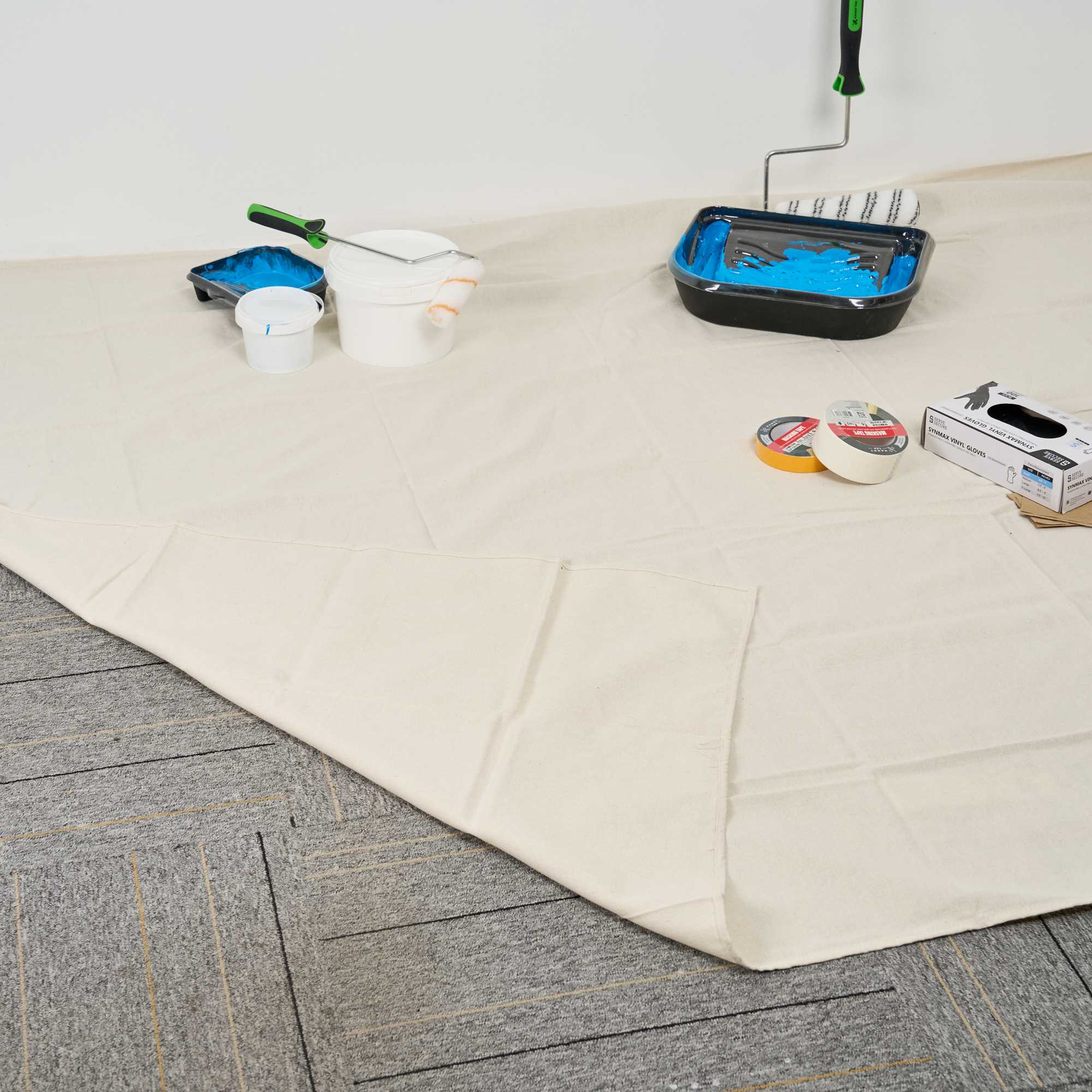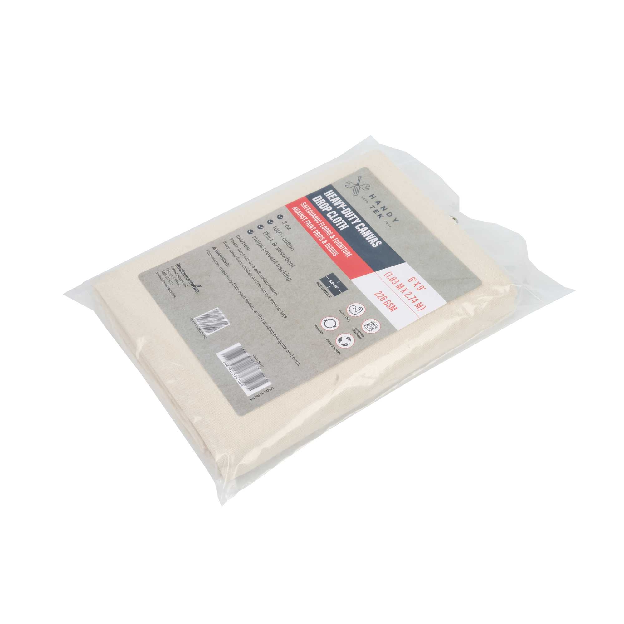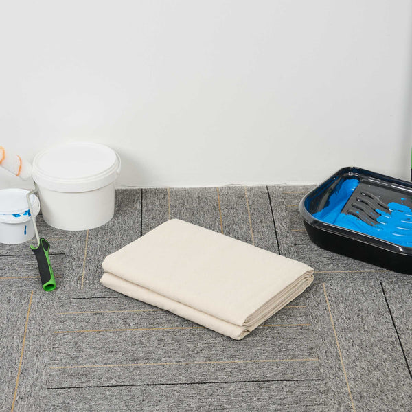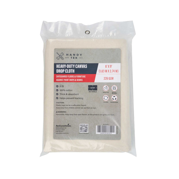 Protect surfaces with confidence using our Handy Tek White Cotton Canvas Drop Cloth, designed for a wide range of tasks in commercial and foodservice settings. This multi-purpose drop cloth serves as a great floor cover, effectively shielding surfaces like floors, carpets, and furniture from paint, spills, and dust. With its durable design, this painting sheet features hemmed and double-stitched edges, enhancing its strength and stopping fraying for long-lasting use. Crafted from heavyweight canvas, this tarp sheet stays in place and provides added protection against leaks and debris. Not only does this white tarp sheet absorb spills and dust, but it also ensures that surfaces underneath remain clean and pristine. Designed for convenience, this worksite cover is washable and reusable, making it a reliable choice for multiple projects. Measuring 72.05 inches in length by 107.87 inches in width, this drop cloth provides ample coverage for any task. Sold in a 1 count box.