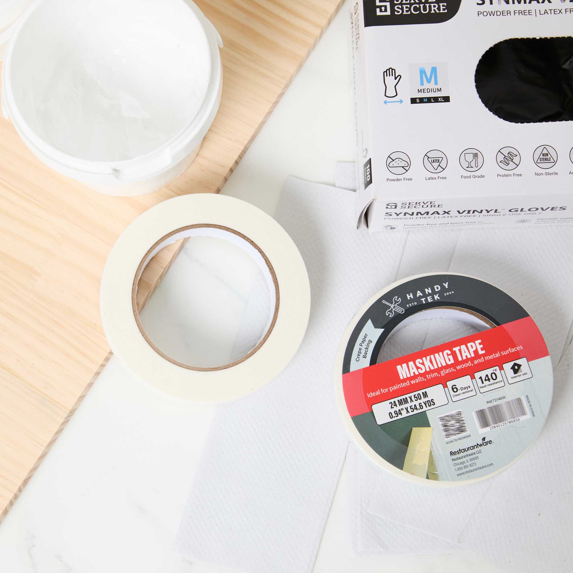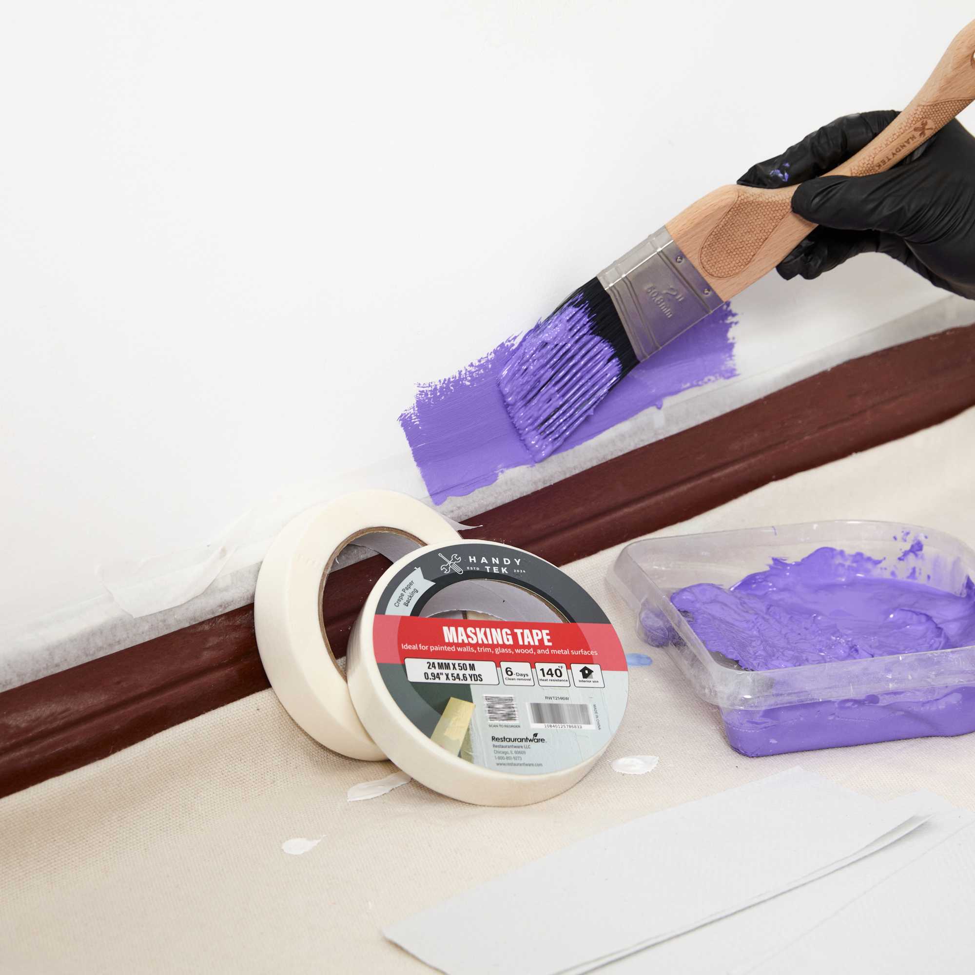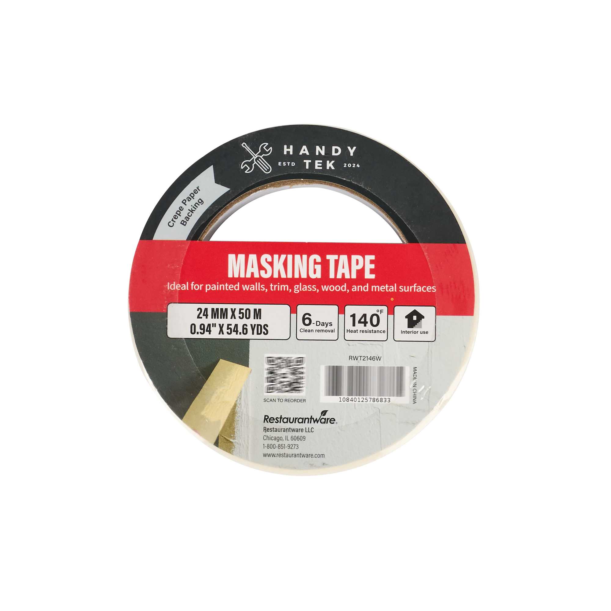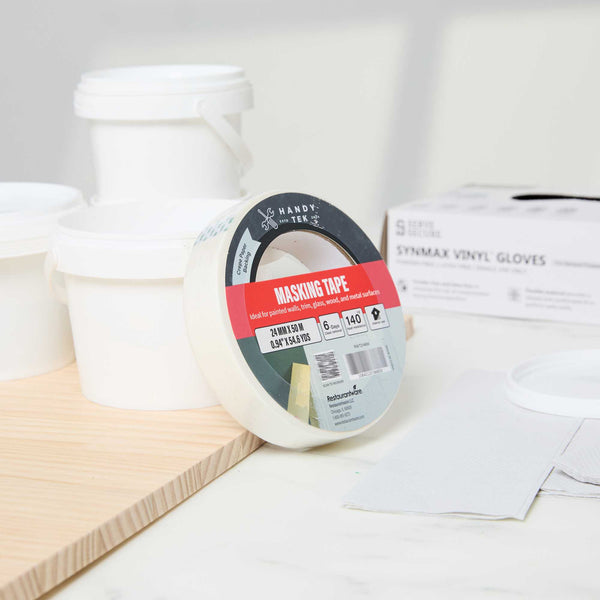 Enhance your foodservice operations with our Handy Tek White Masking Tape Roll, a versatile tool suitable for light bundling, packaging, labeling, and precise masking during paint jobs. This masking tape is moisture and heat-resistant, ensuring it holds up against most paints and moisture for reliable indoor use. Easy to apply, this adhesive tape is hand-tearable and conformable, allowing for quick and precise placement on various surfaces. Equipped with strong adhesion, this tape roll features a rubber adhesive that securely sticks to most surfaces for clean, consistent masking. For easy maintenance, this painter’s tape offers clean removal, peeling off effortlessly without damage or residue for up to 6 days after application. Measuring 1 inch in width, this masking tape roll features a total length of 54 yards. Sold in a 96 count box.