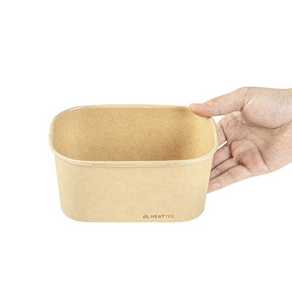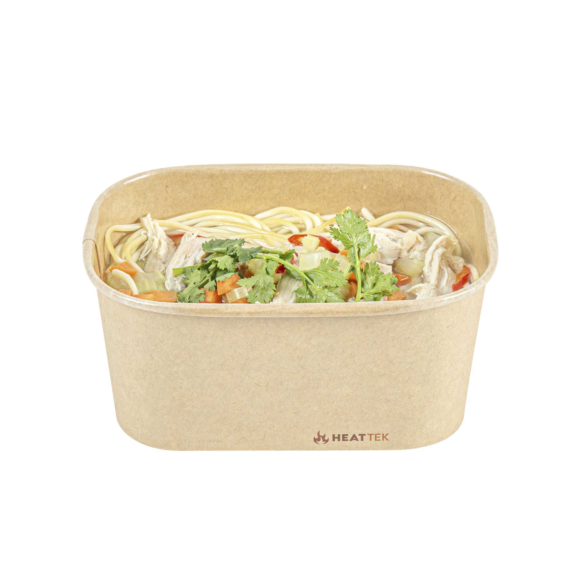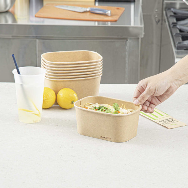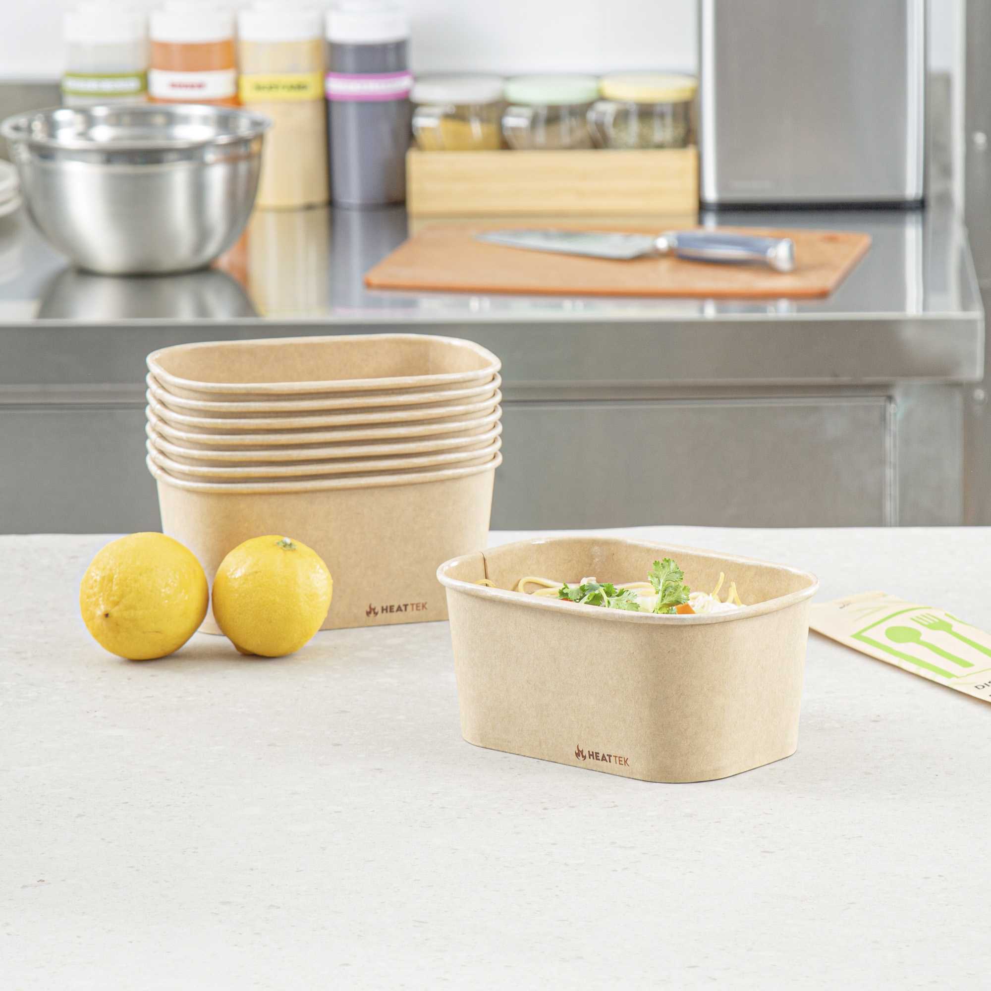 Elevate your foodservice with our Heat Tek 34-Ounce Oval Kraft Paper Serving Containers, designed to meet the demands of any kitchen. These paper food containers feature a greaseproof lining that expertly prevents oils and sauces from leaking through, ensuring a clean and professional presentation.Built from premium kraft paper, these serving containers are durable for oven use up to 460F, ensuring your food stays warm and delicious. Plus, they are freezable, making them versatile for any food prep situation. The convenient stackable design of these paper containers enables space-saving storage and easy organization in busy environments. With a generous capacity of 34 ounces, these kraft containers are ideal for serving hearty portions of your favorite dishes. Measuring 6.77 inches in length by 4.72 inches in width by 2.95 inches in height, these kraft paper containers provide ample space for a variety of meals. Sold in a 25 count box.